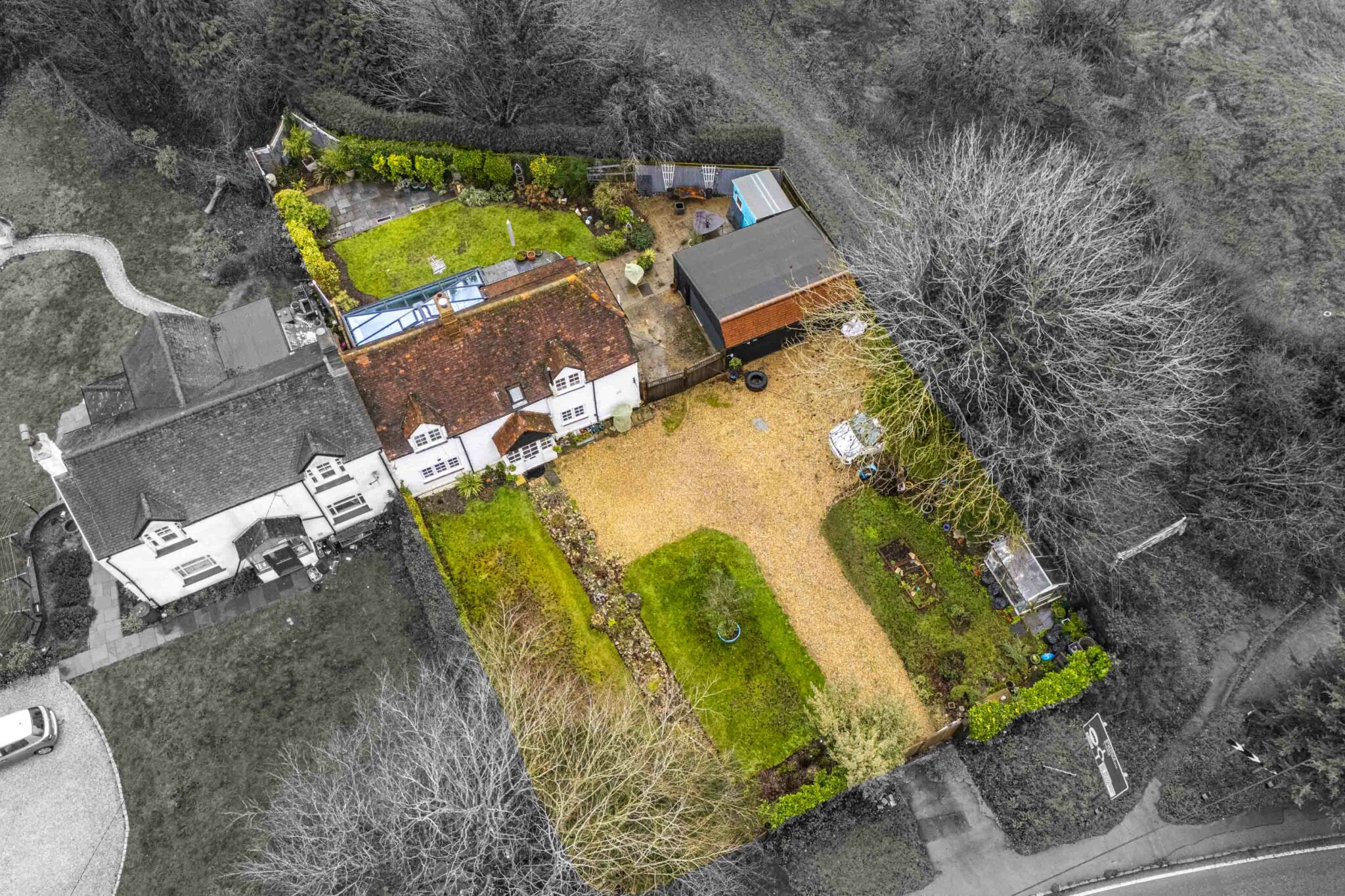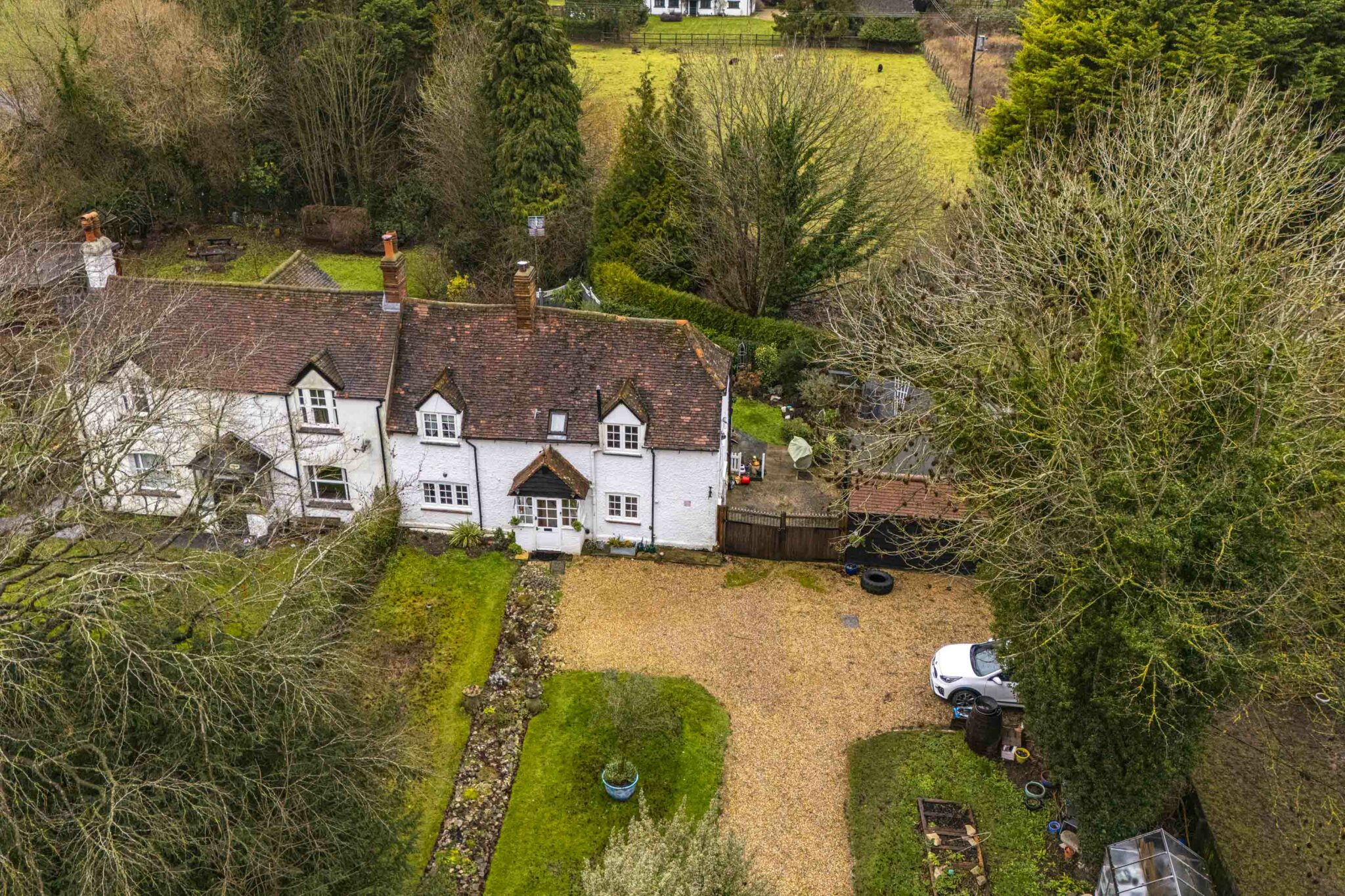 Set within a gated 0.19-acre plot, this charming late-1800s cottage blends period character with thoughtful modern upgrades. The property features painter-rendered elevations and a garage / outbuilding with electric roller door, power supply and ample driveway parking.