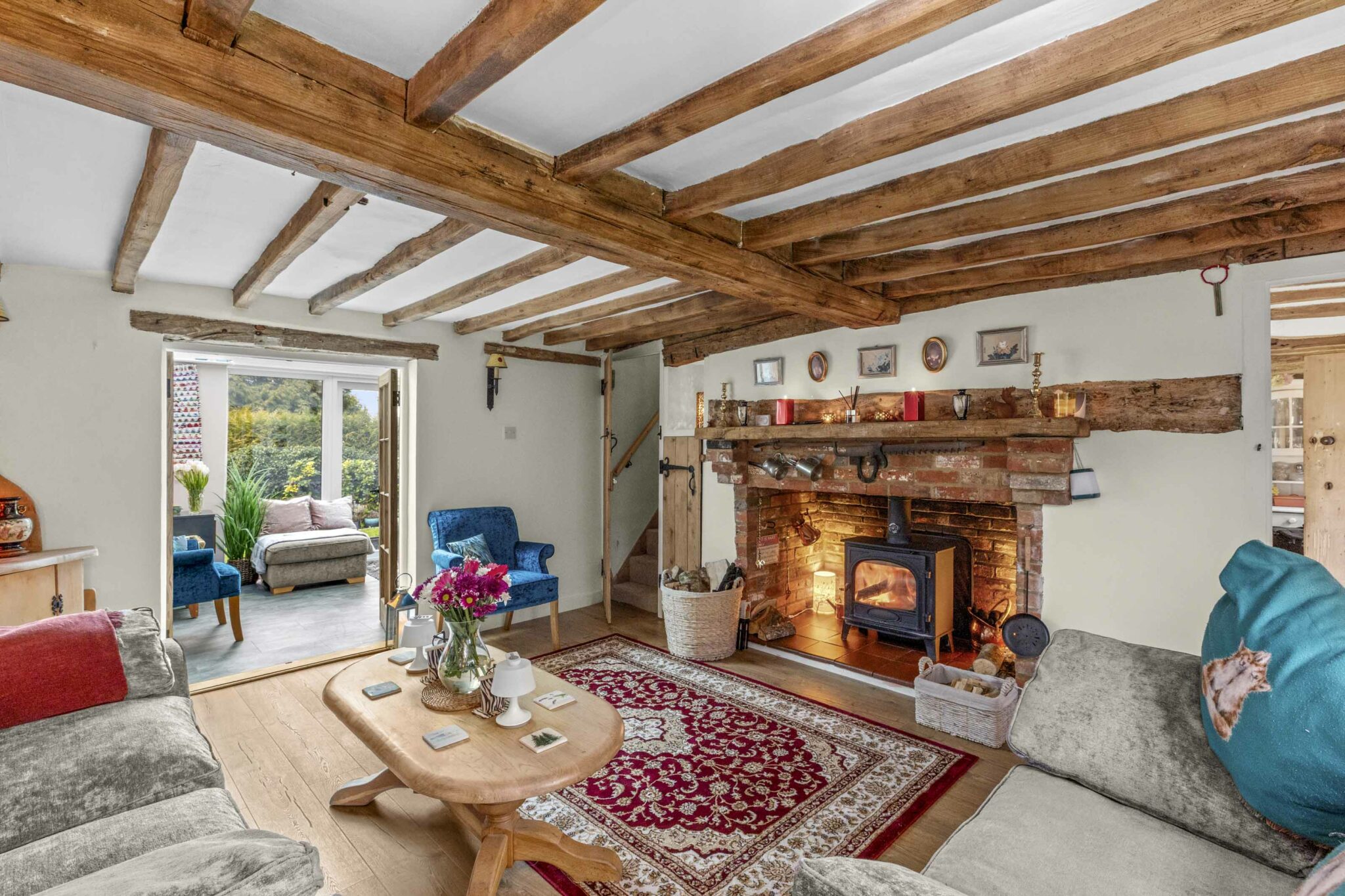 Upstairs are two generous double bedrooms, both with vaulted ceilings and exposed beams, with the principal bedroom enjoying a dual aspect. The bathroom is well appointed with a freestanding roll-top bath, complementing the home’s period charm.