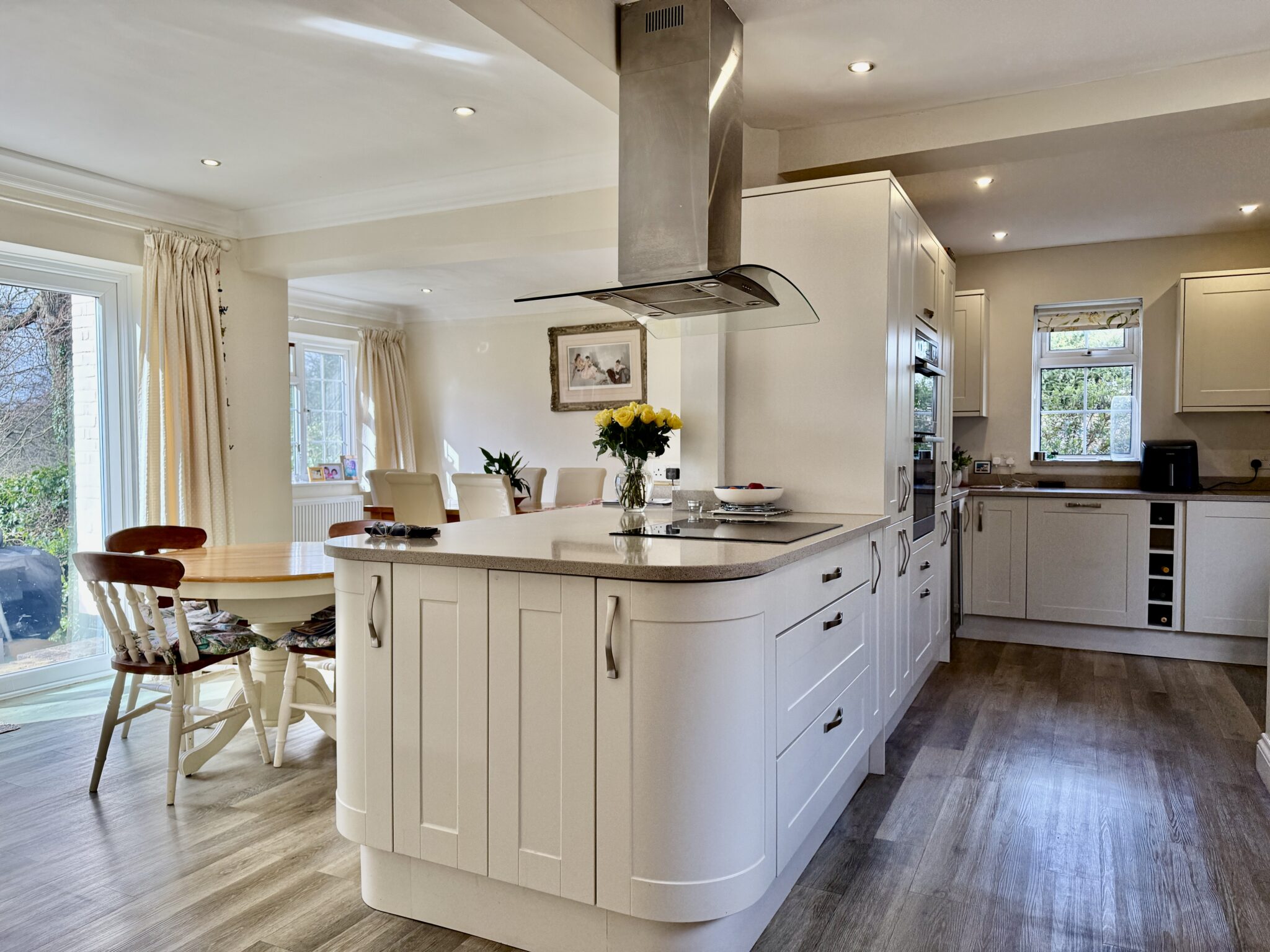 On the ground floor there is a spacious turning hall with attractive wooden floor leading to the cloakroom, a spacious sitting room with open fireplace and the impressive open kitchen/breakfast/dining room with integrated appliances and light stone worktops. There is a separate utility room with access to the front. Both the sitting room and kitchen have French doors to the garden terrace for enjoying the views.