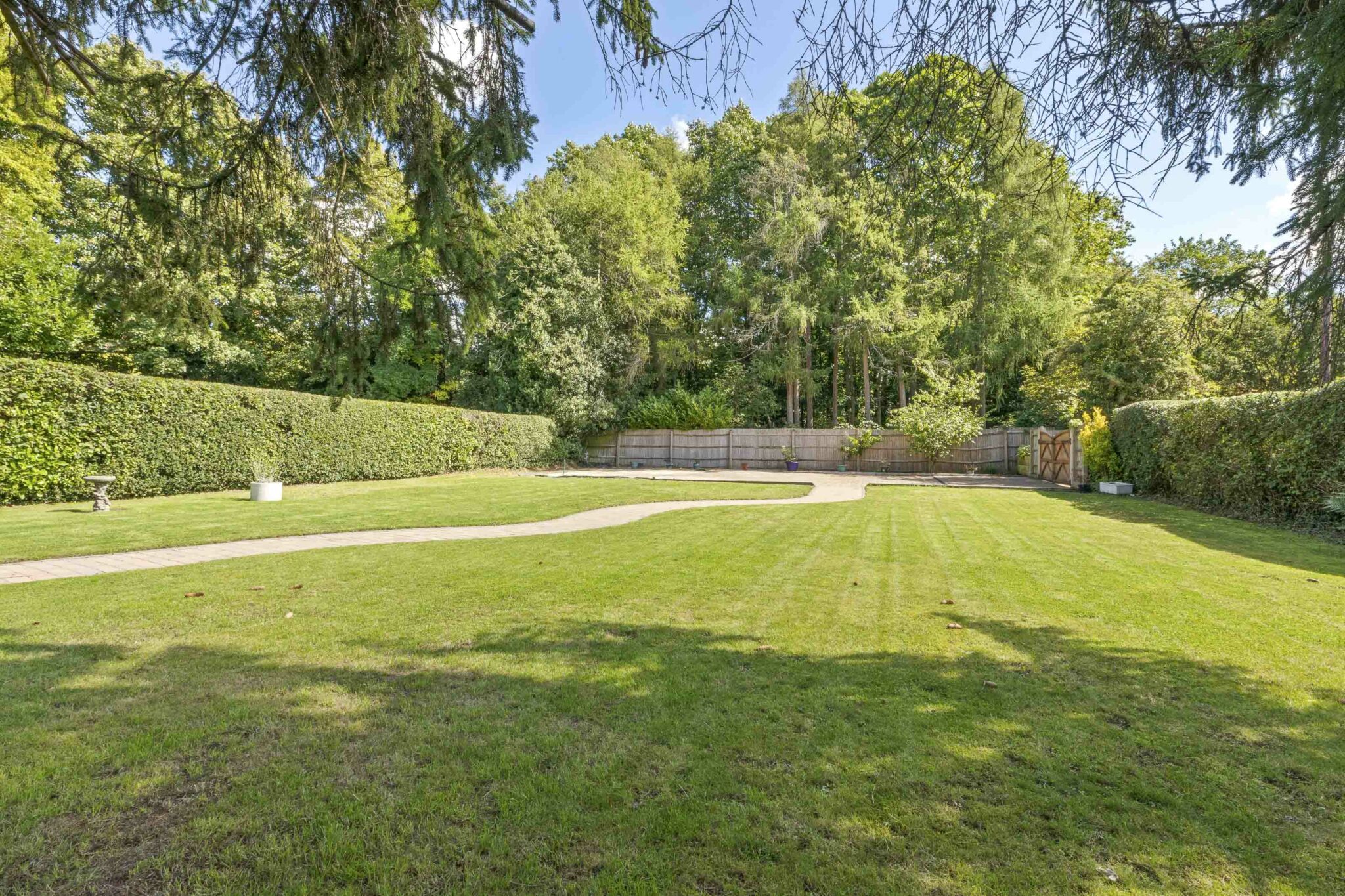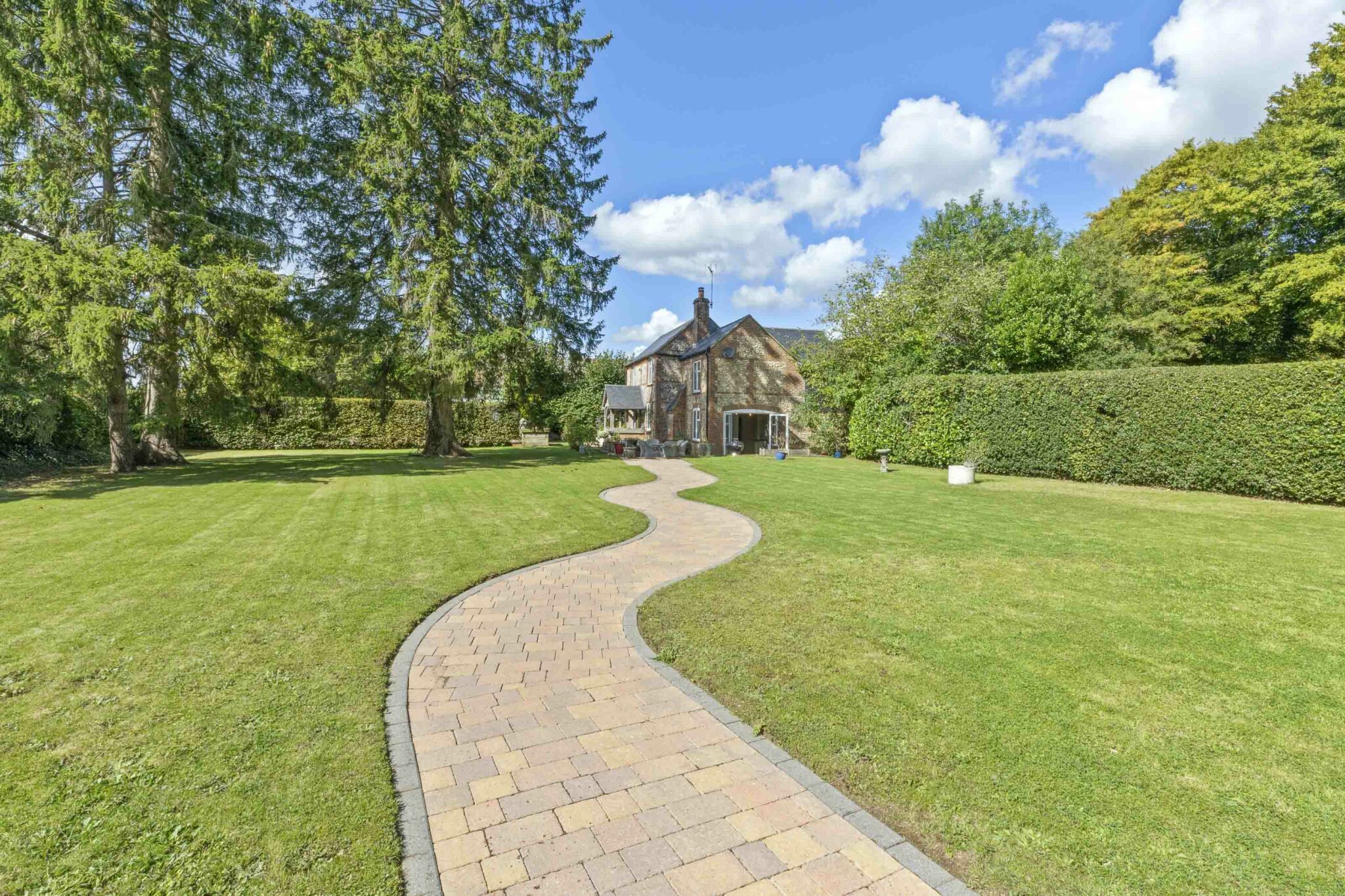 The property's manicured, level lawned gardens are a standout feature, adorned with flower and shrub beds, meandering pathways connecting to secluded seating areas, and surrounded by mature hedging and fencing. The external allure is further enhanced by an extensive brick-paved driveway, offering ample parking space, with the potential for a detached barn-style garage / home office, subject to the necessary consents.