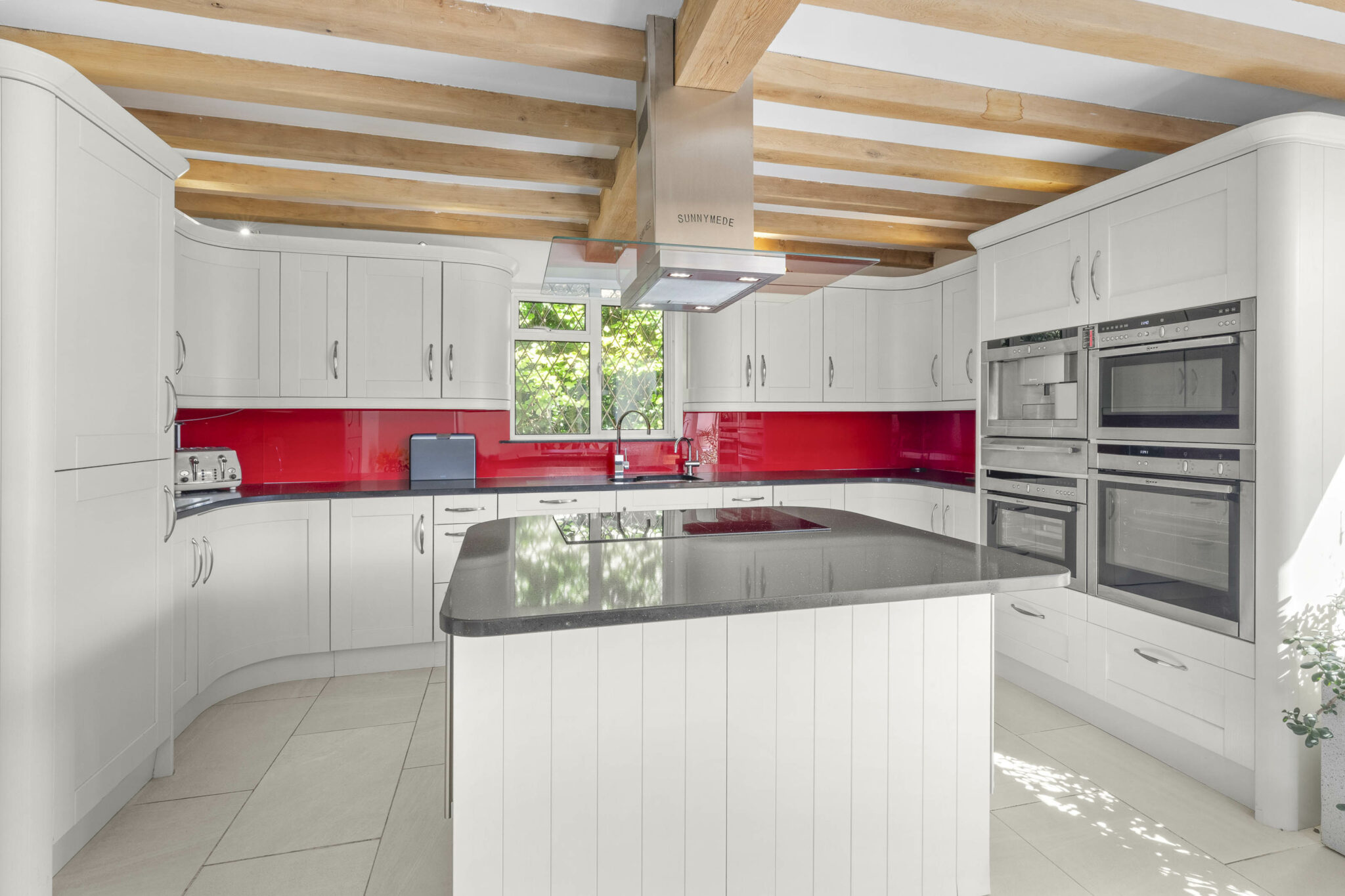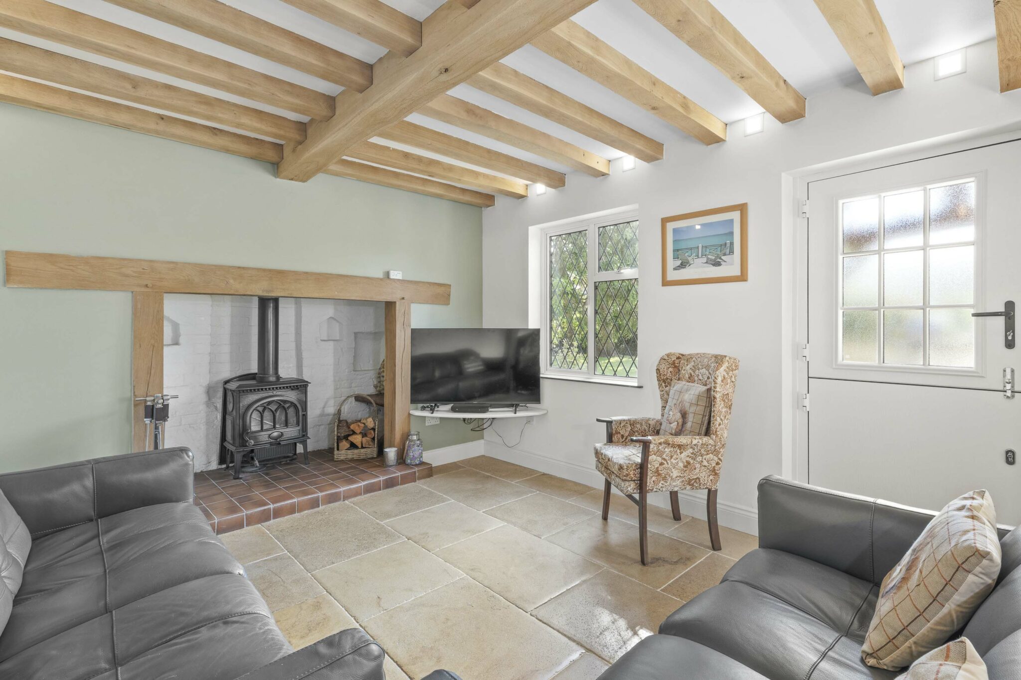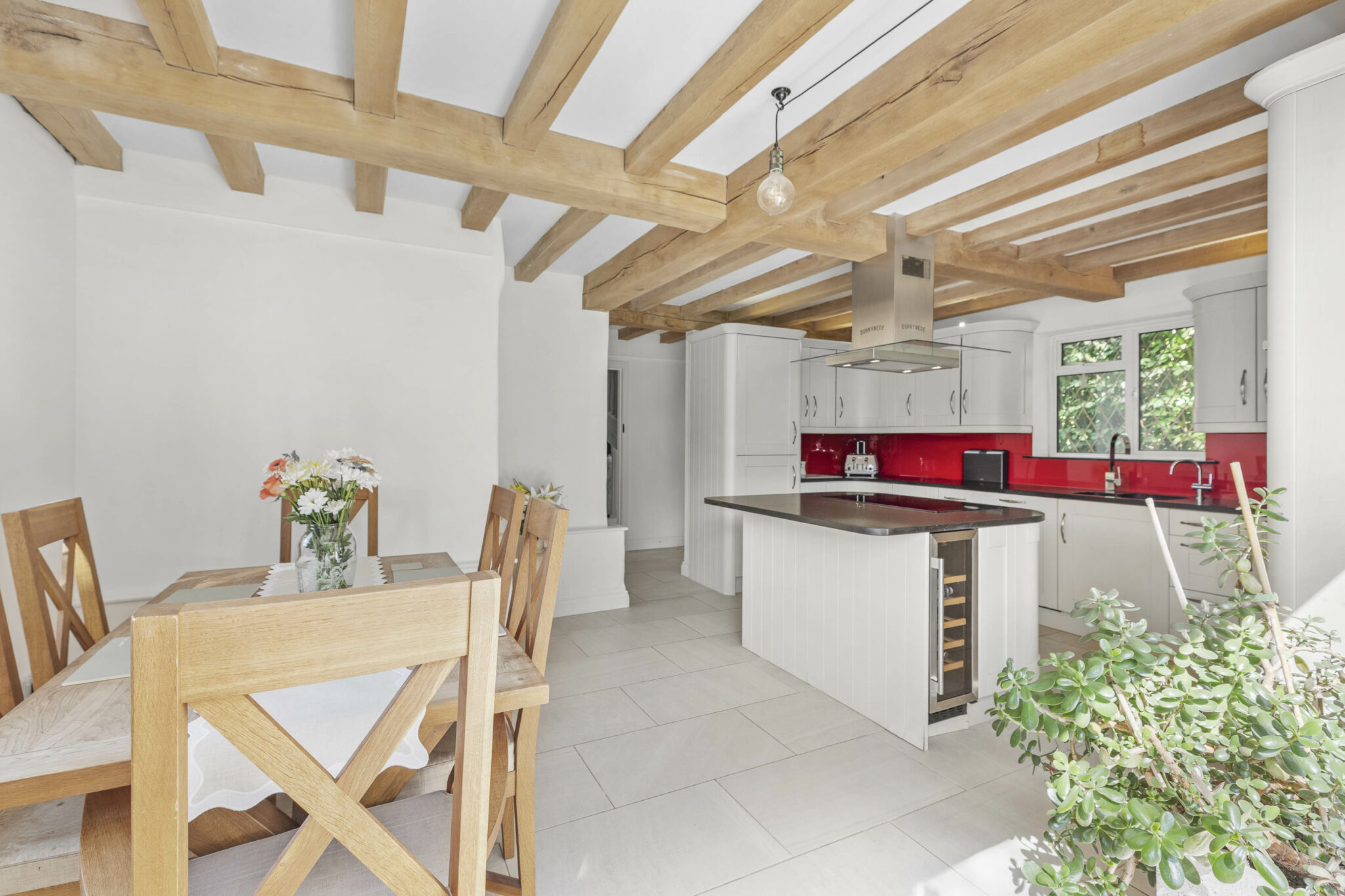 Stepping through the stable door entrance, you are welcomed into the impressive main sitting/dining room, featuring a stunning oak beam ceiling and a centrepiece inglenook wood-burning stove. The well-equipped and contemporary fitted kitchen/breakfast/dining room boasts another captivating oak beam ceiling, a large island, integrated appliances, and double doors leading to the attractive gardens.