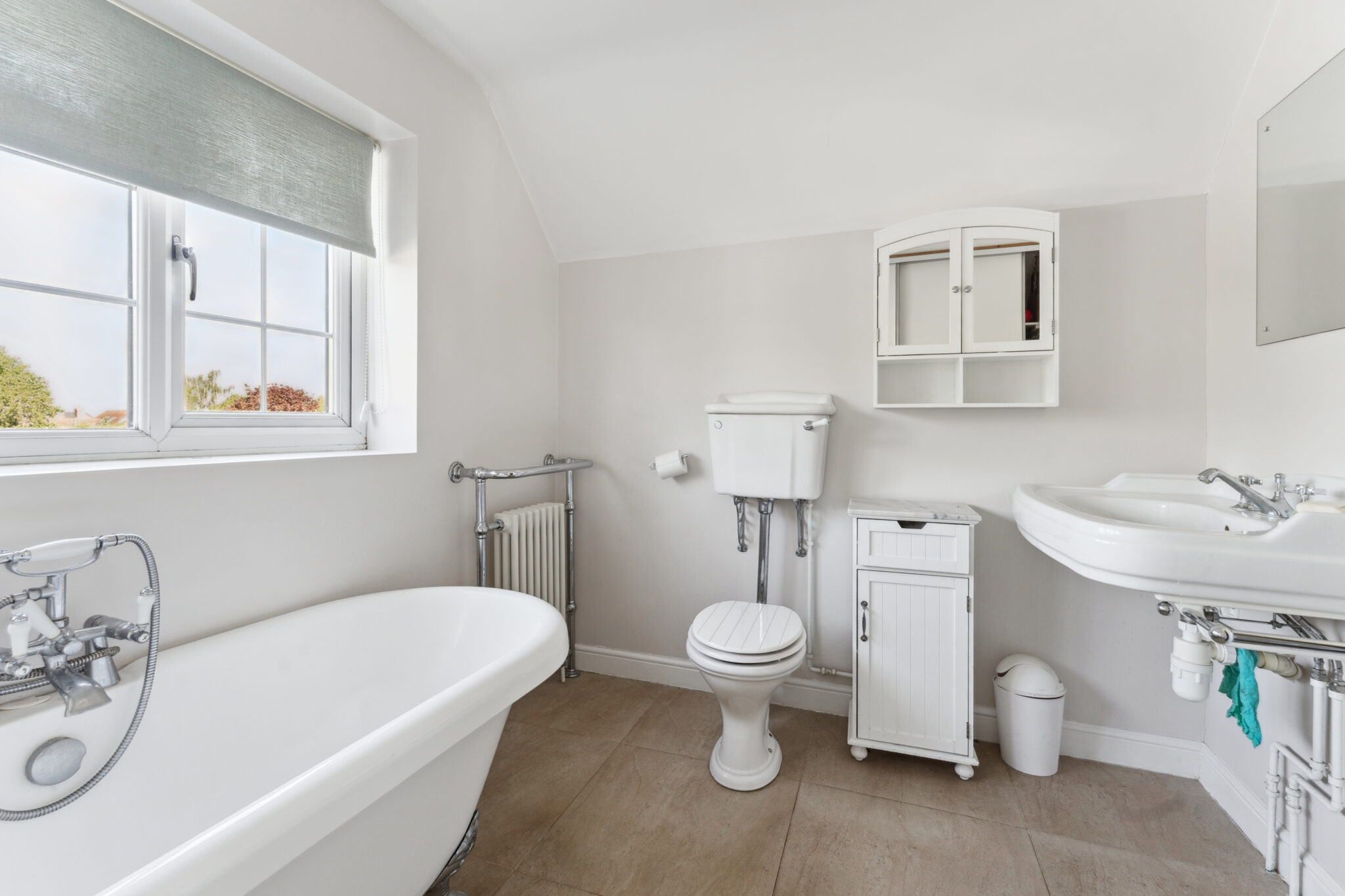 To the first floor, the principal bedroom follows which offers fitted wardrobes. A beautifully appointed bathroom with stand alone bathtub concludes the accommodation.