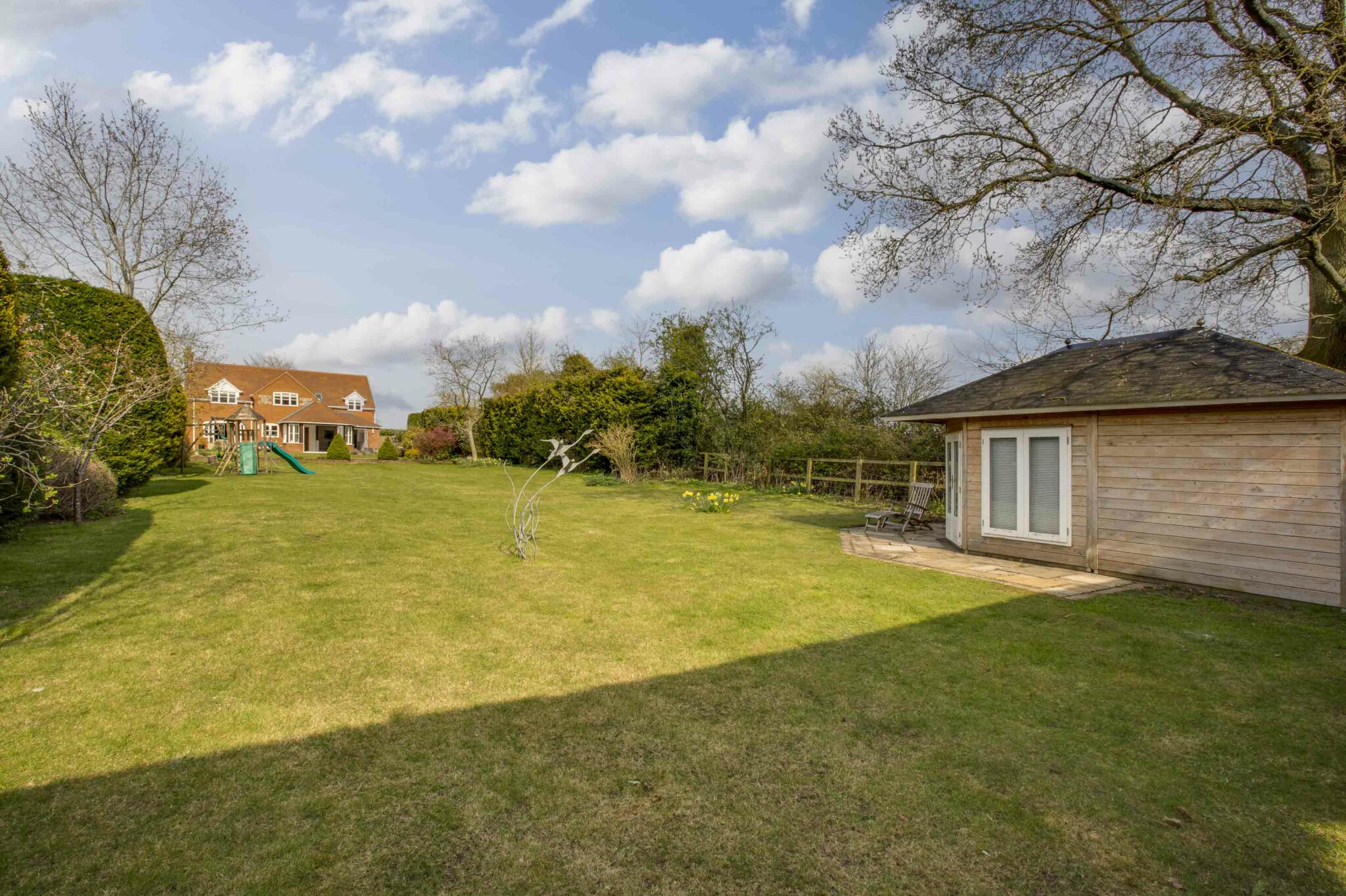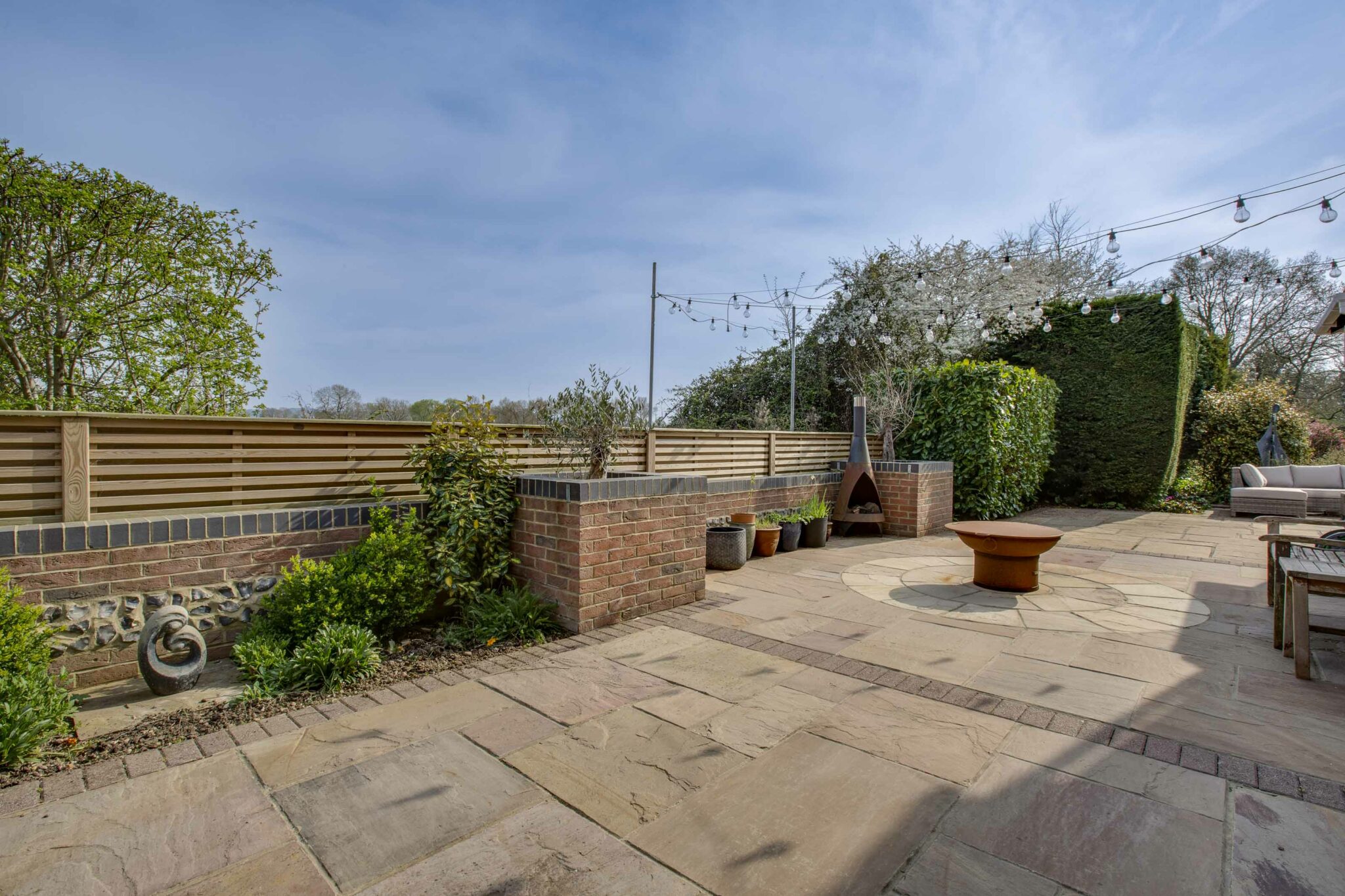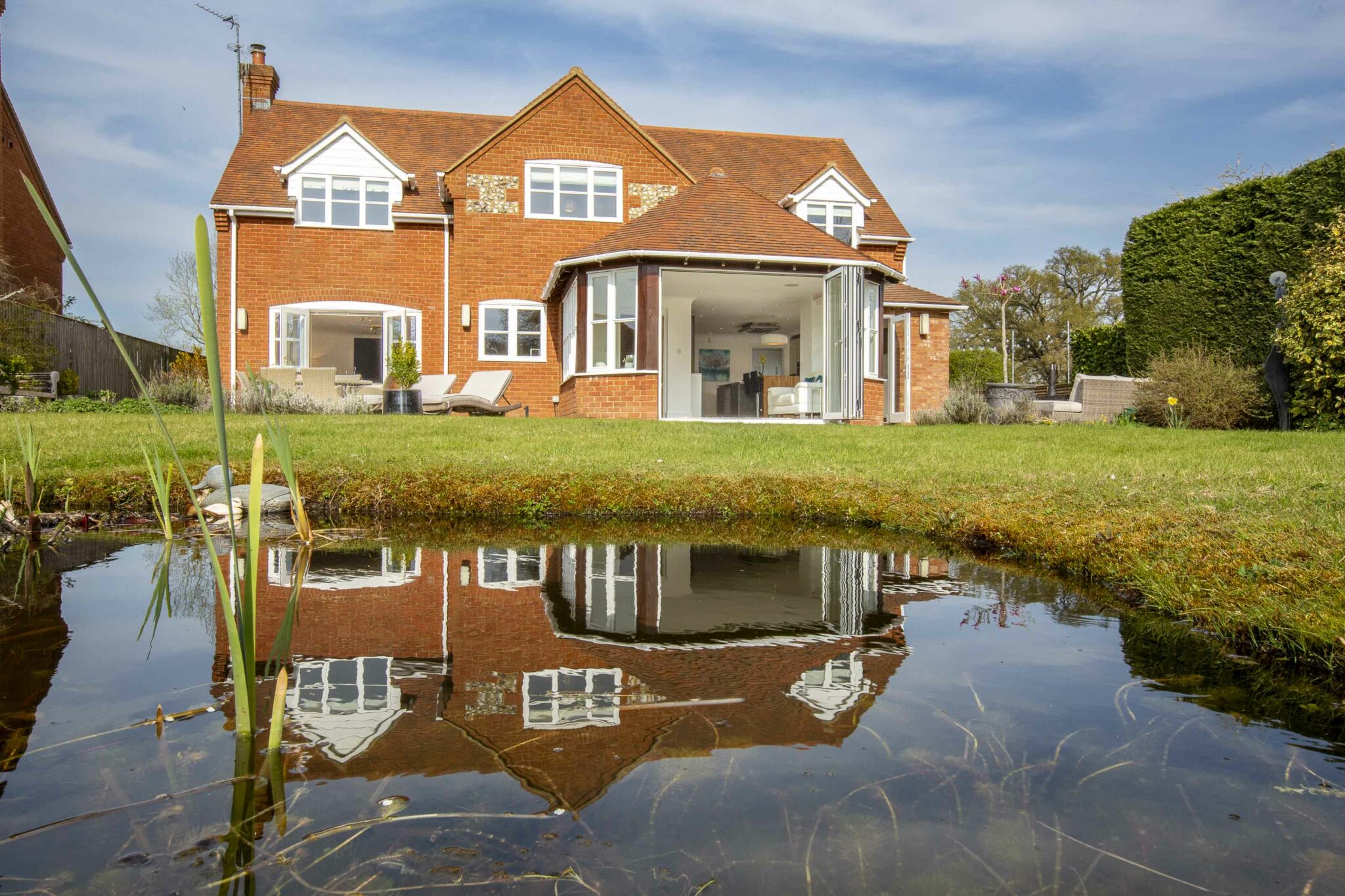 There are patio areas right across the back of the house and down the side, the latter with a fire pit and views of Coombe Hill. A wide expanse of lawn stretches away with a lovely natural pond, well stocked borders and a summerhouse with light and power. An archway leads through the hedge to a golf practice net.