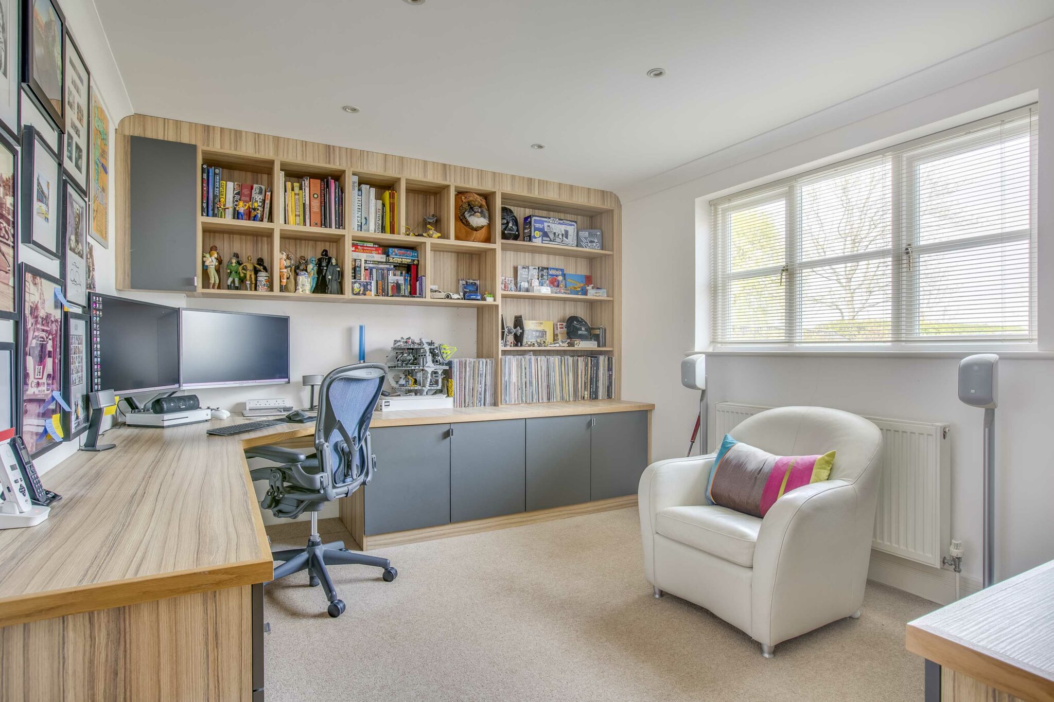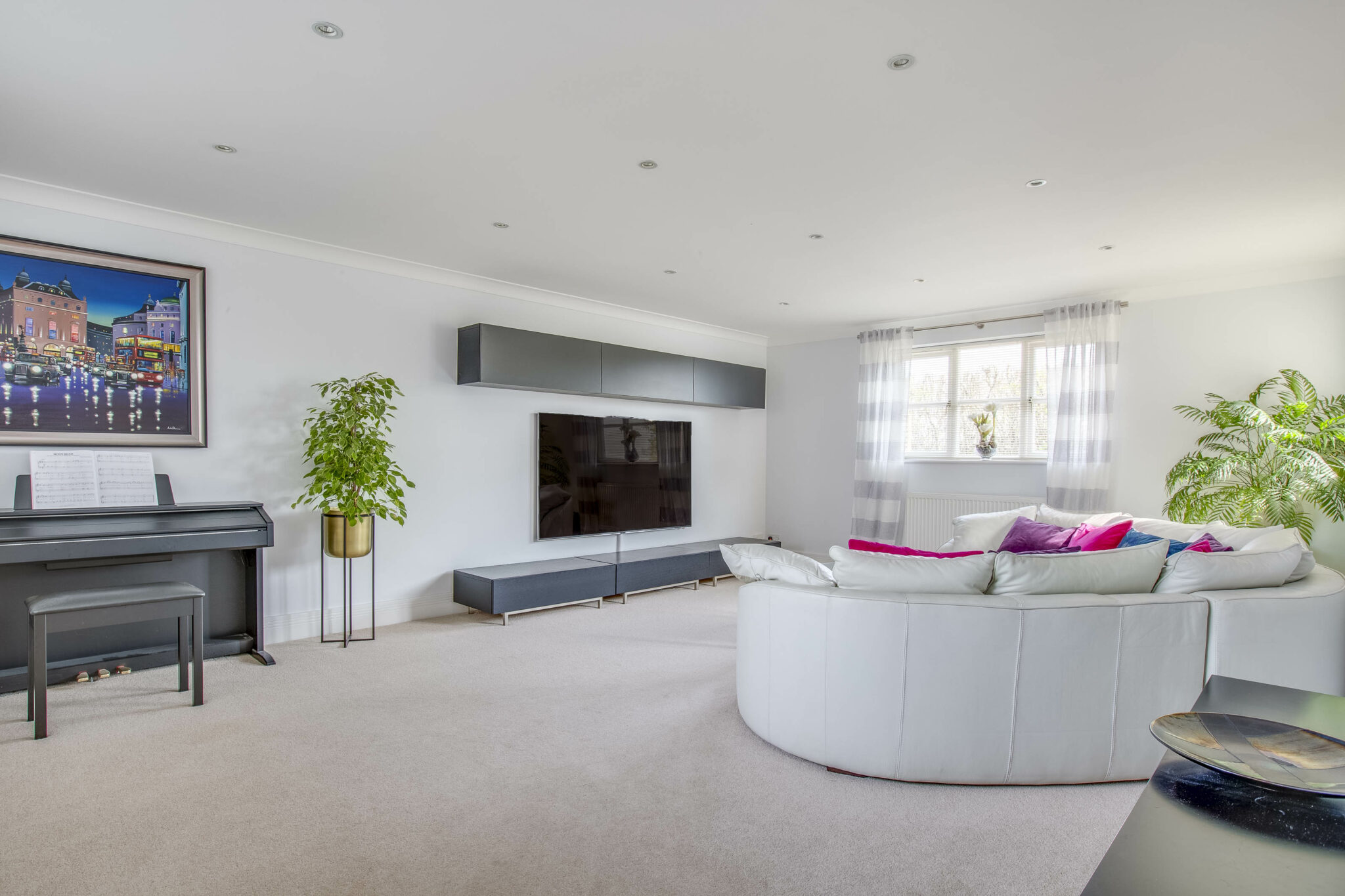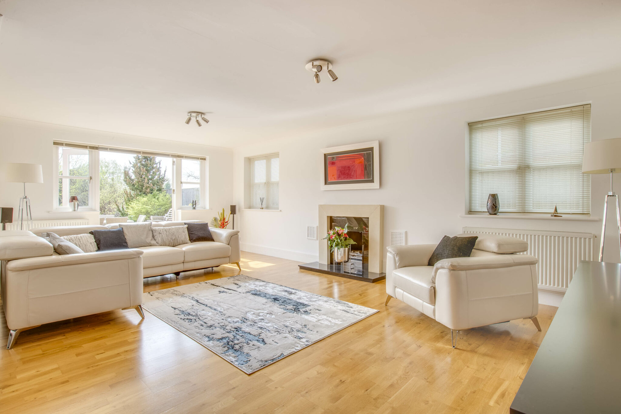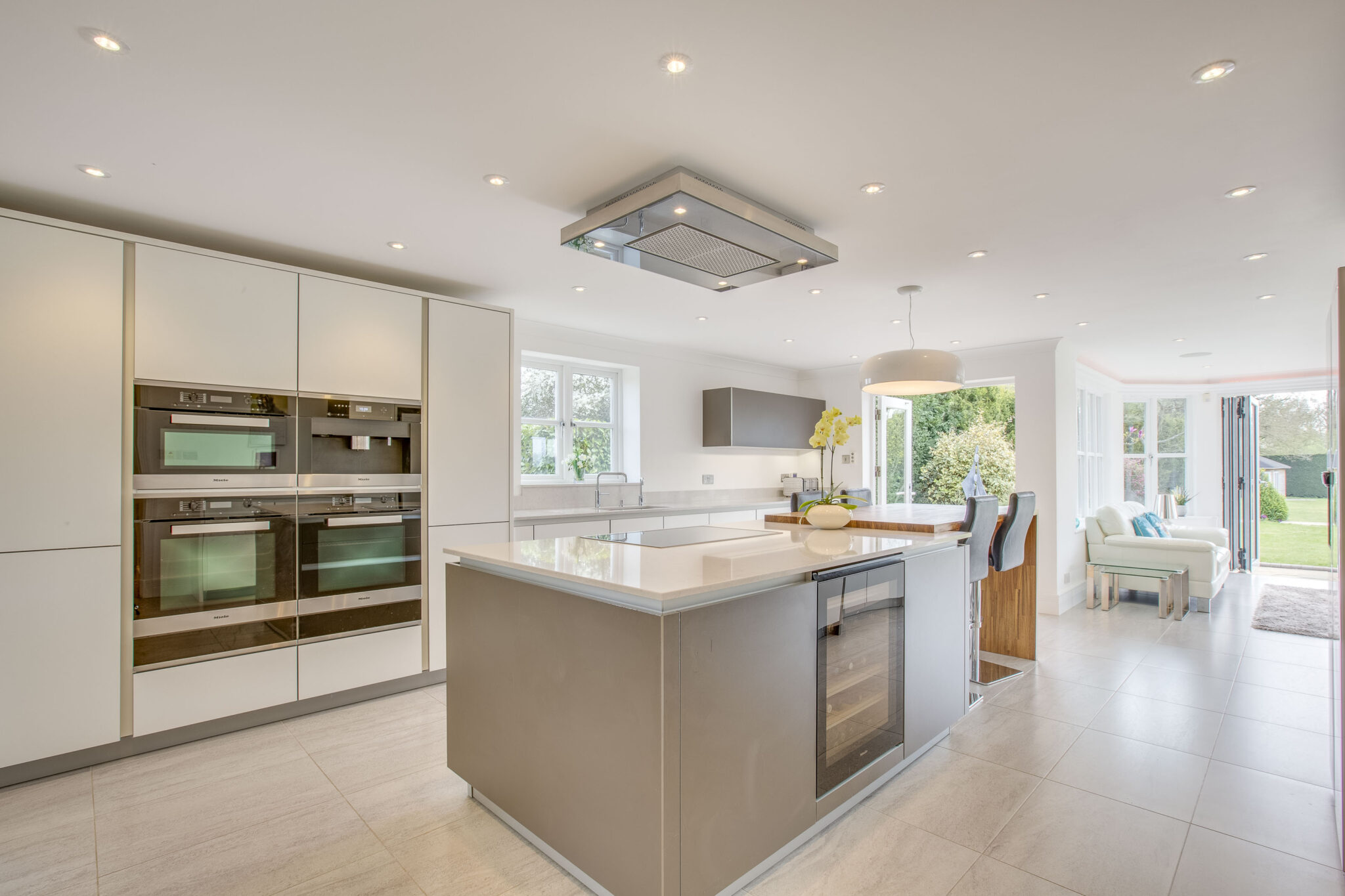 The front door opens into a full height reception hall with glass and oak staircase to the first floor, cloakroom and double doors to the main reception rooms. The study is a great workspace and fully fitted with bespoke desk, cupboards and shelving. The double aspect family room is a perfect space for children or to watch television. The main sitting room has double casement doors opening onto the garden and a lovely stone fireplace with gas flame fire as the focal point. The dining room takes a large dining table and connects with the garden room. The kitchen is breathtaking, beautifully fitted with sleek handle less units by Leicht; with a large central island and incorporating every Miele integrated appliance you could wish for. The kitchen has double doors out to the outside and leads through to the garden room which has also had bifolds to the garden. The connection with the outside space works beautifully for inside/outside entertaining. The utility is again comprehensively fitted, including freezer and water softener.