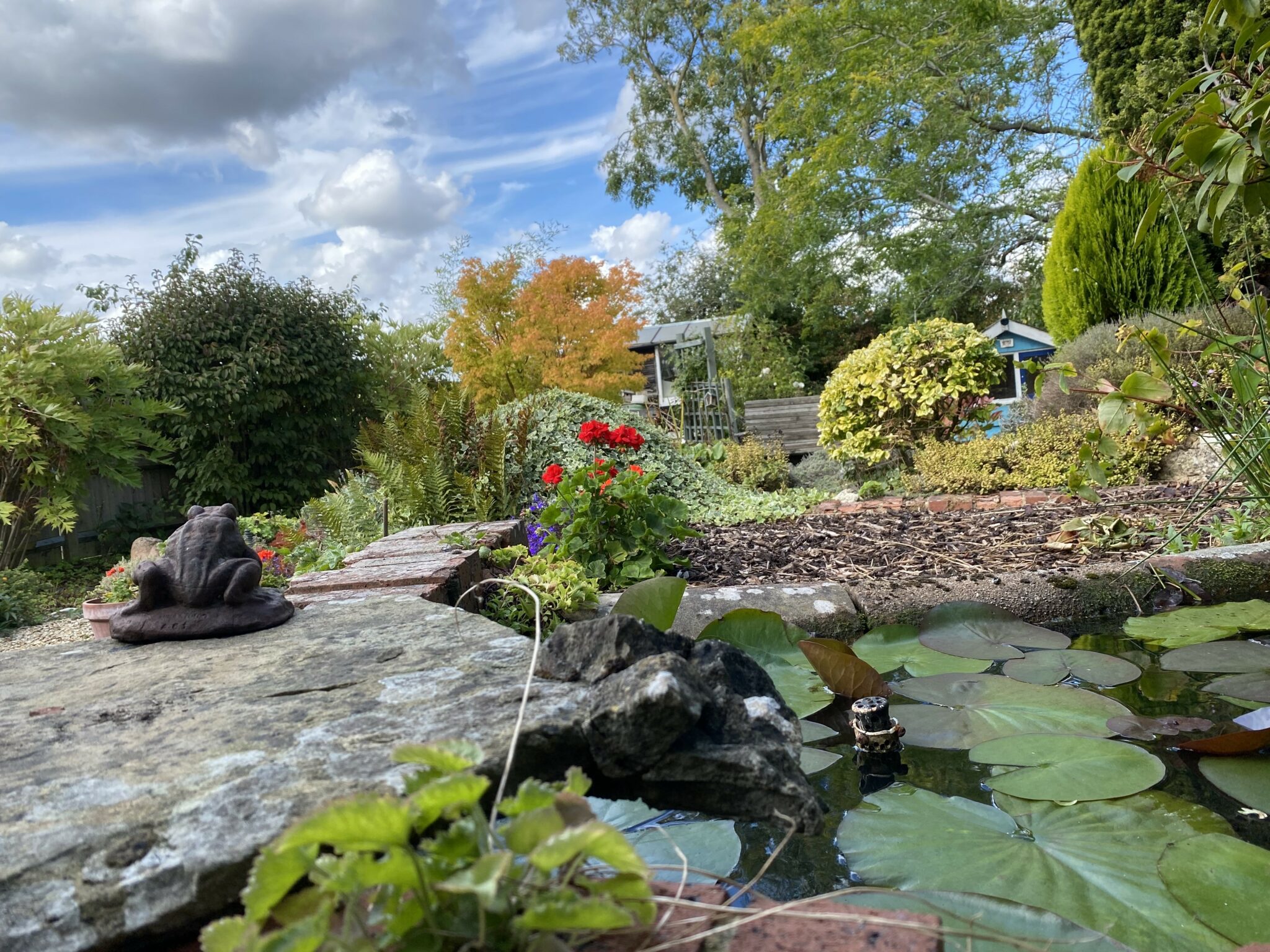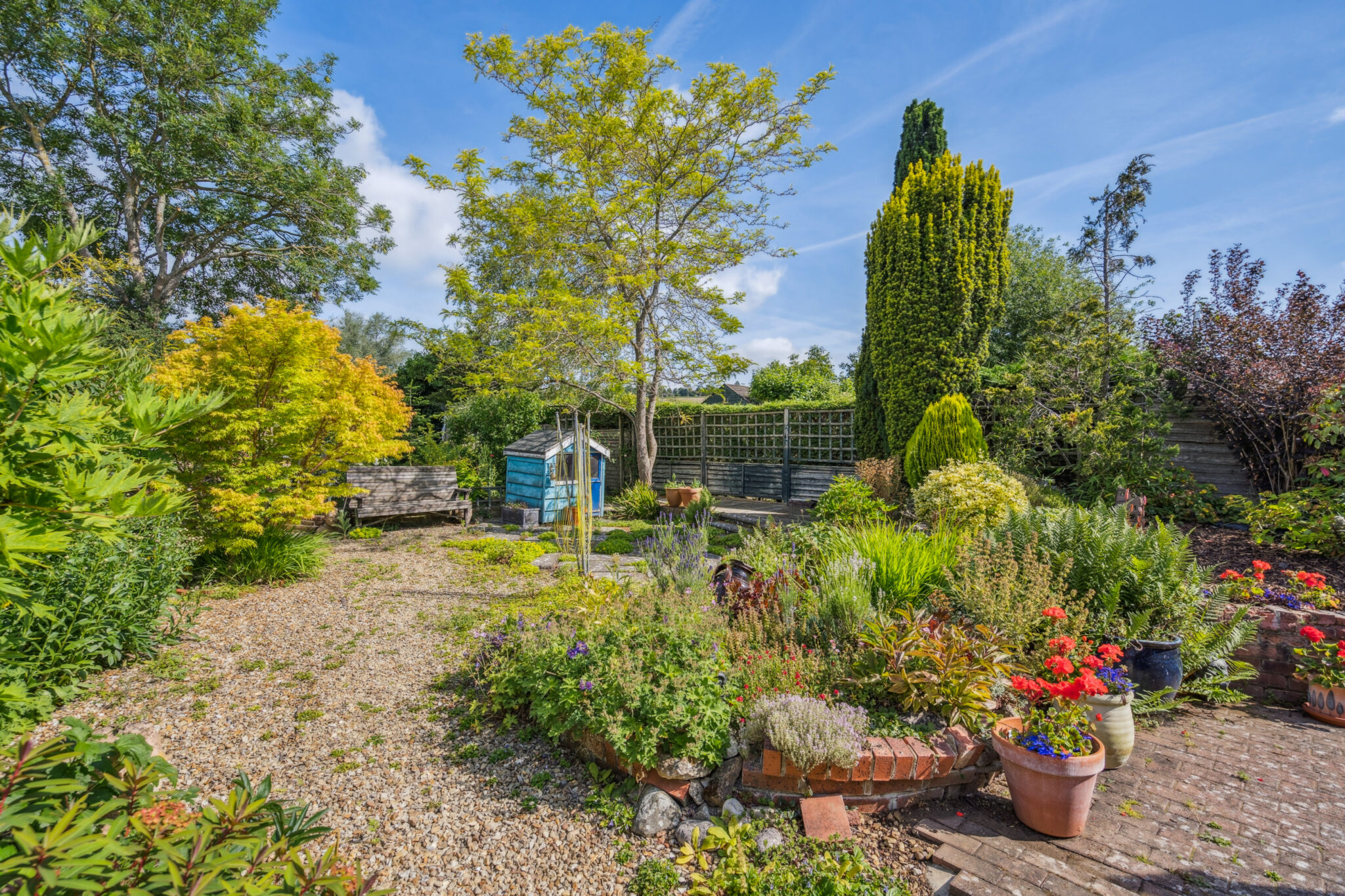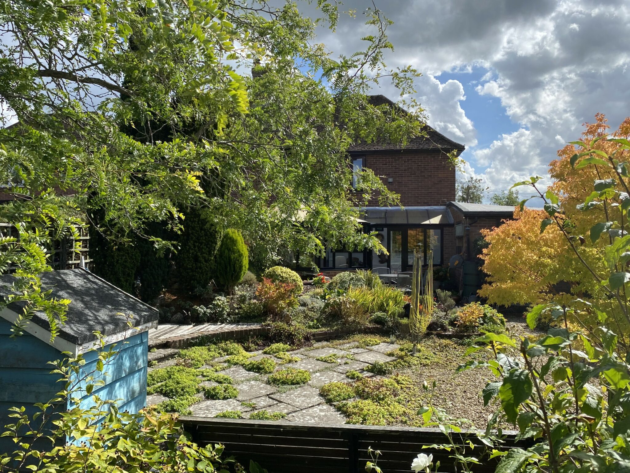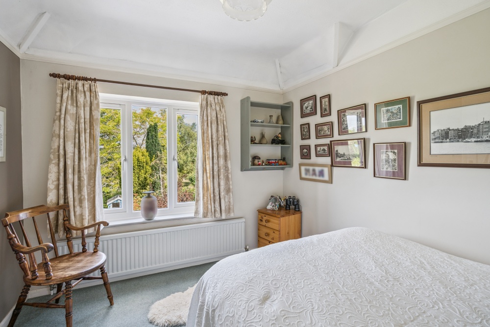To the front is a substantial garden with beautifully planted shrubs, and a drive which provides parking for several motor vehicles. The Calor gas tank is discreetly placed behind a planted terrace. The rear garden is a joy. A beautifully interesting cottage garden with meandering pathways, seating areas, small pond, mature shrubs and specimen trees. What a gorgeous space to relax in.