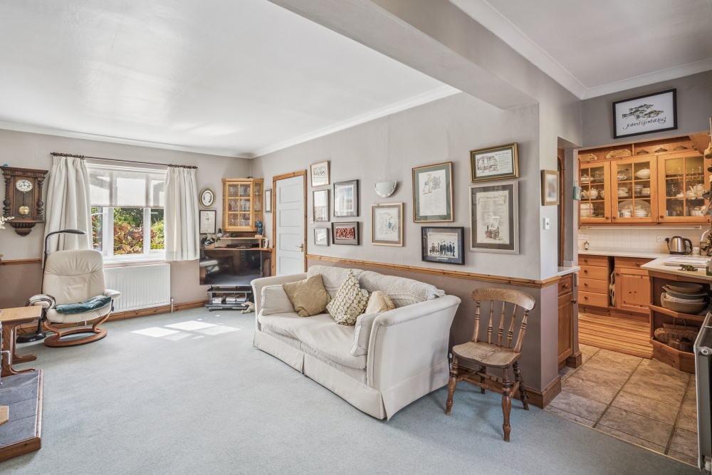 The entrance hall leads to both the sitting room and the downstairs shower room. The sitting room has an attractive fireplace and a newly fitted picture window. From this space, there is access to both the conservatory and the kitchen. The kitchen is fitted with a range of fitted cabinets and a built in oven and hob. There is plenty of room for a breakfast table. The conservatory enjoys stunning views of the garden and allows access to the garage and the study via a clever link. This concludes the ground floor.