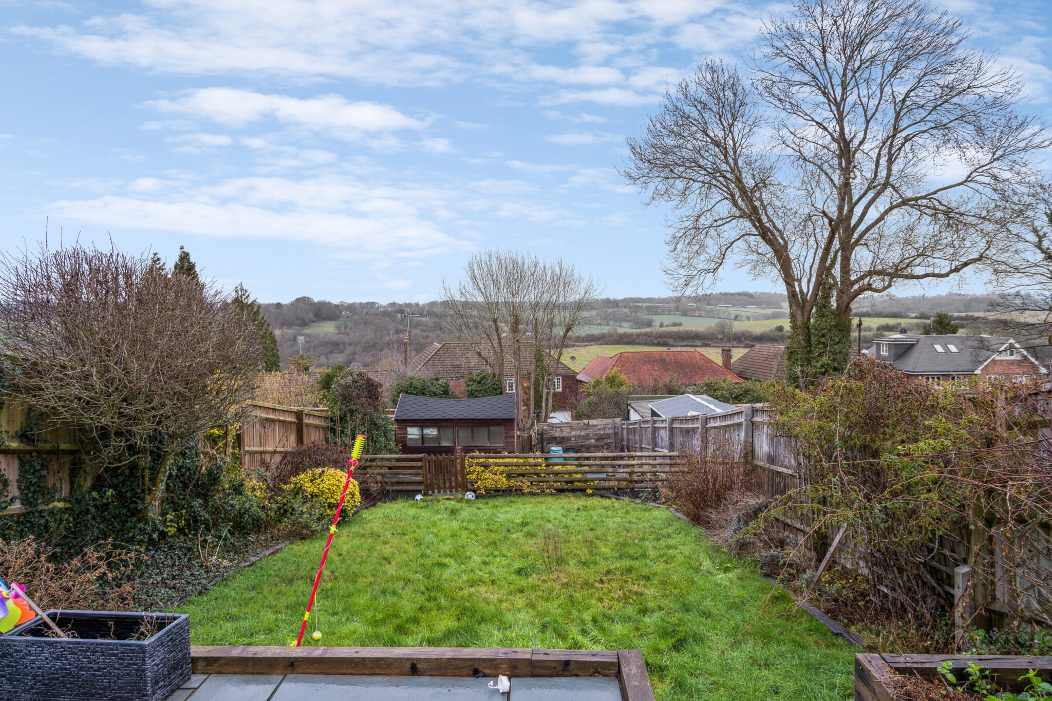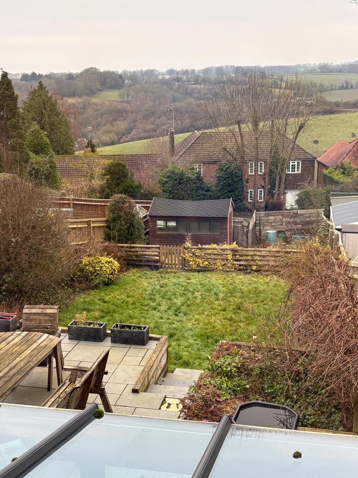 The rear garden is a splendid feature of the property having been thoughtfully landscaped to maximise enjoyment of the spectacular view. There is a large paved terrace with ample seating and dining space with steps down to a level lawned area with various shrub/floral borders. There is a further enclosed area to the rear with workshop/shed. This area offers potential to site a spacious garden room/office and to create on-site  parking given there is a dropped curve (and turning) off Holtspur Top Lane.