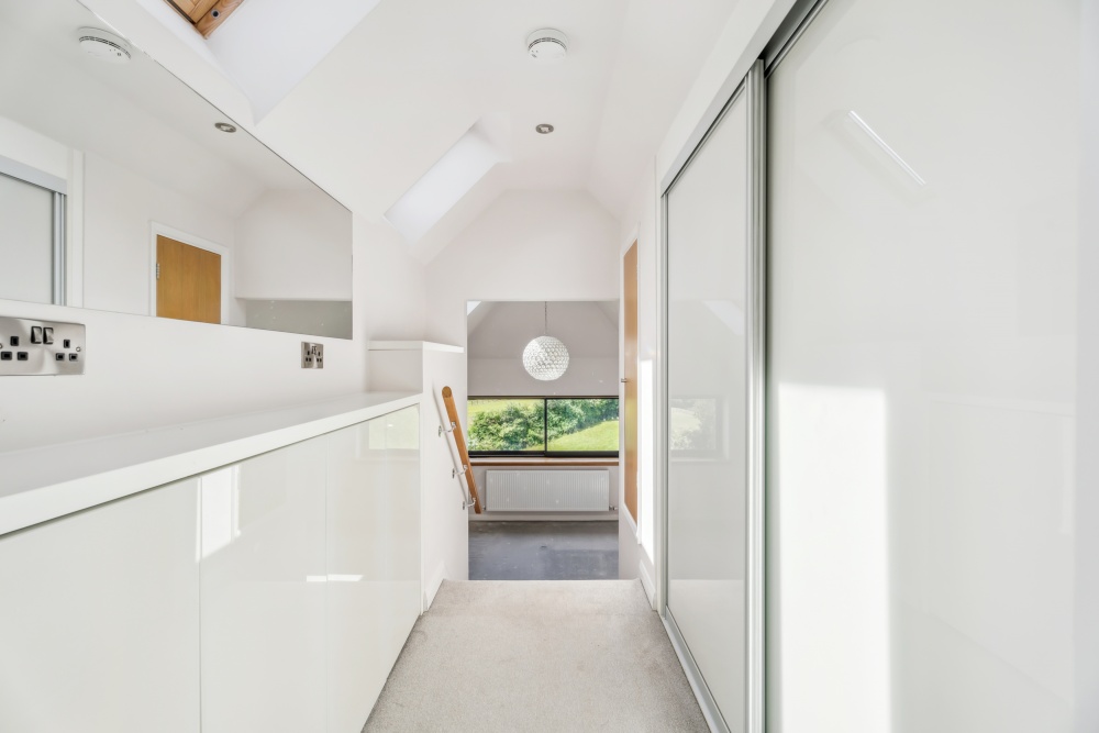 The first floor features a comfortable bedroom with en suite shower room, with stairs rising to two further bedrooms and a stylish family bathroom. The top floor is dedicated to the luxurious principal bedroom suite, which includes a private en suite, sauna, and outstanding countryside views.