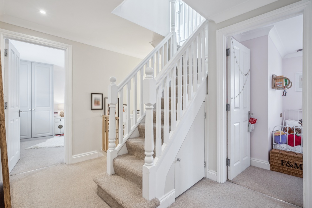 As you step into the property, engineered oak flooring flows seamlessly into an impressive sitting room, featuring a wood-burning stove and French doors that open onto the rear garden. The dining/family room, currently used as a playroom, continues the elegant oak flooring. The stylishly refitted kitchen/breakfast room is well-equipped with the utility room opposite. The cloakroom completes the ground floor.