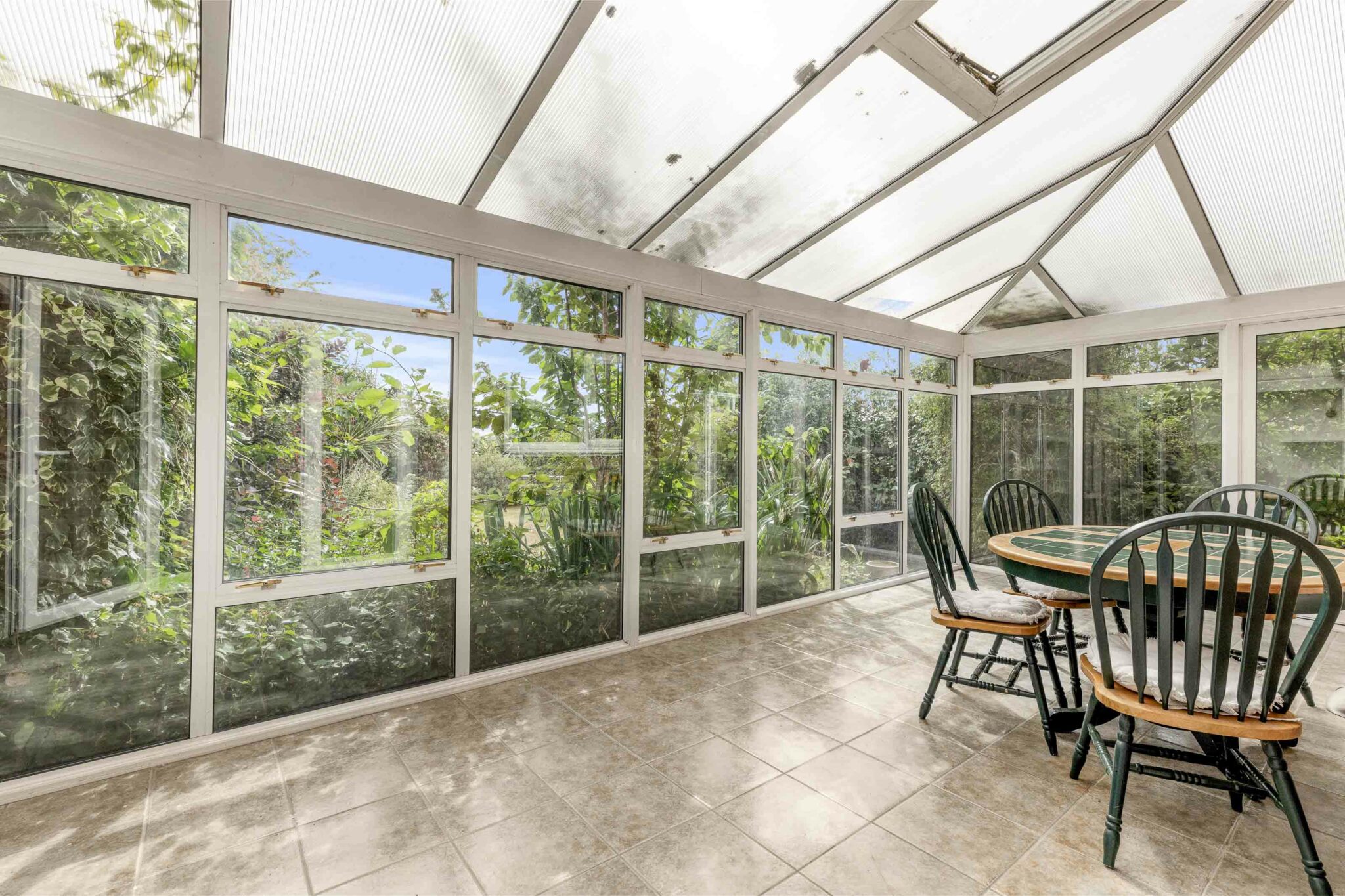 Accommodation is provided by two well-proportioned double bedrooms and one cosy single bedroom, each served by a modern walk-in shower room that has also been tastefully updated. The outside spaces of this property are equally impressive; an ample driveway offers convenient parking provisions, leading the way to a substantial garage for further convenience. To the rear lies a secluded and beautifully landscaped garden, characterised by its tropical planting and mature shrubs that promise a burst of colour and visual interest throughout the changing seasons.