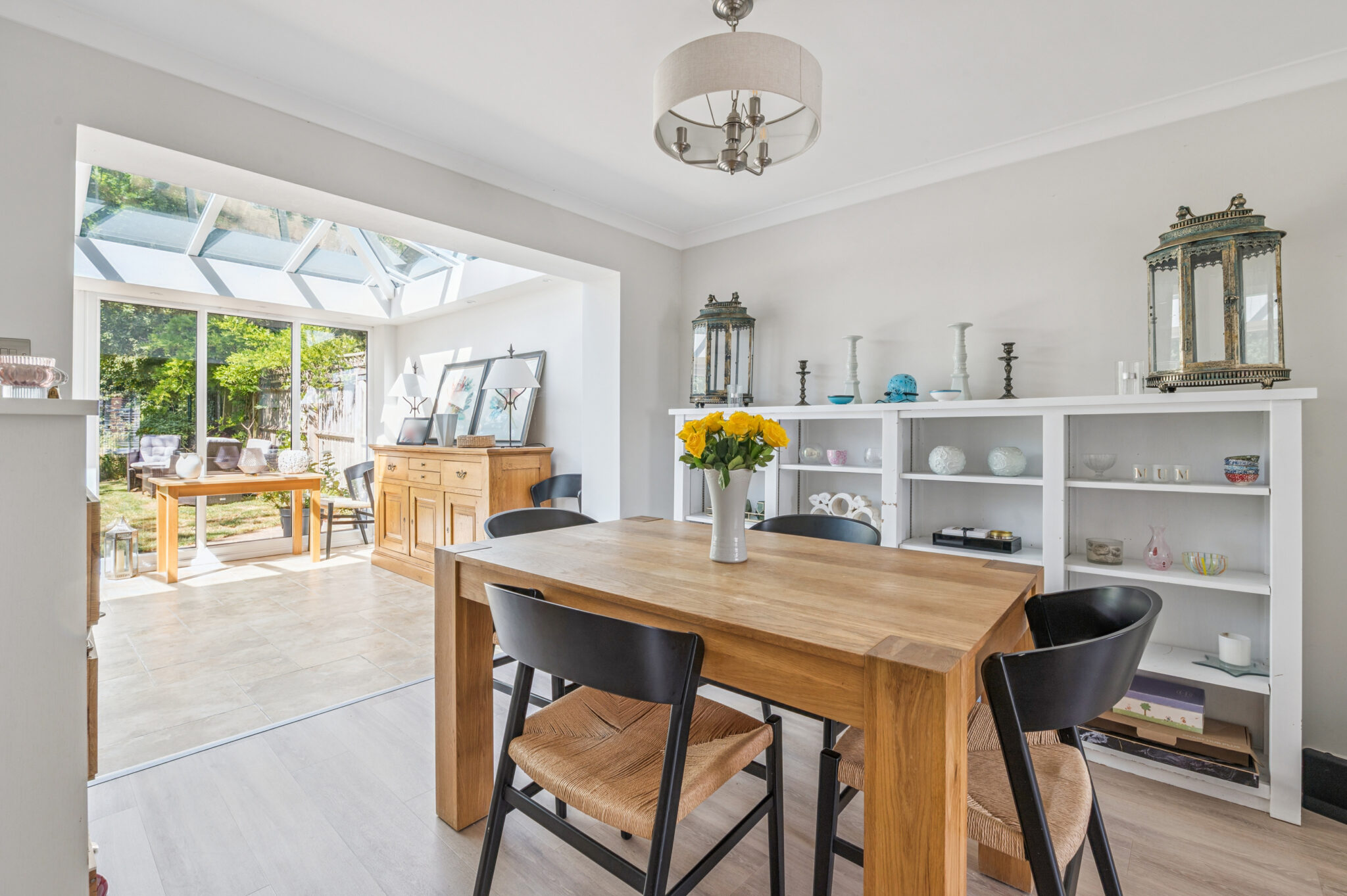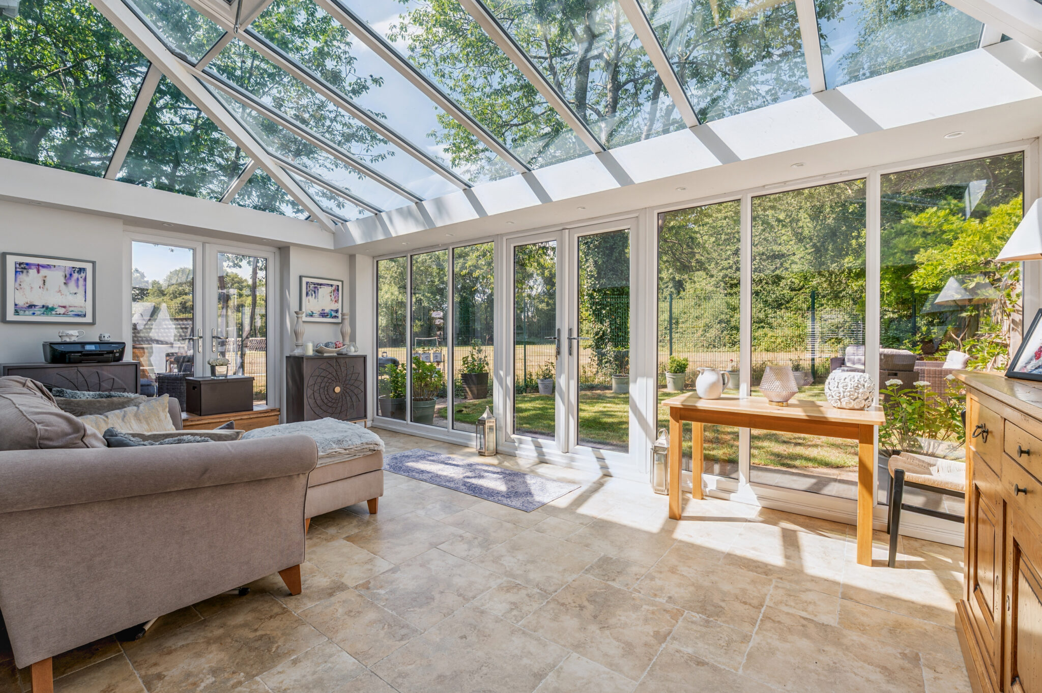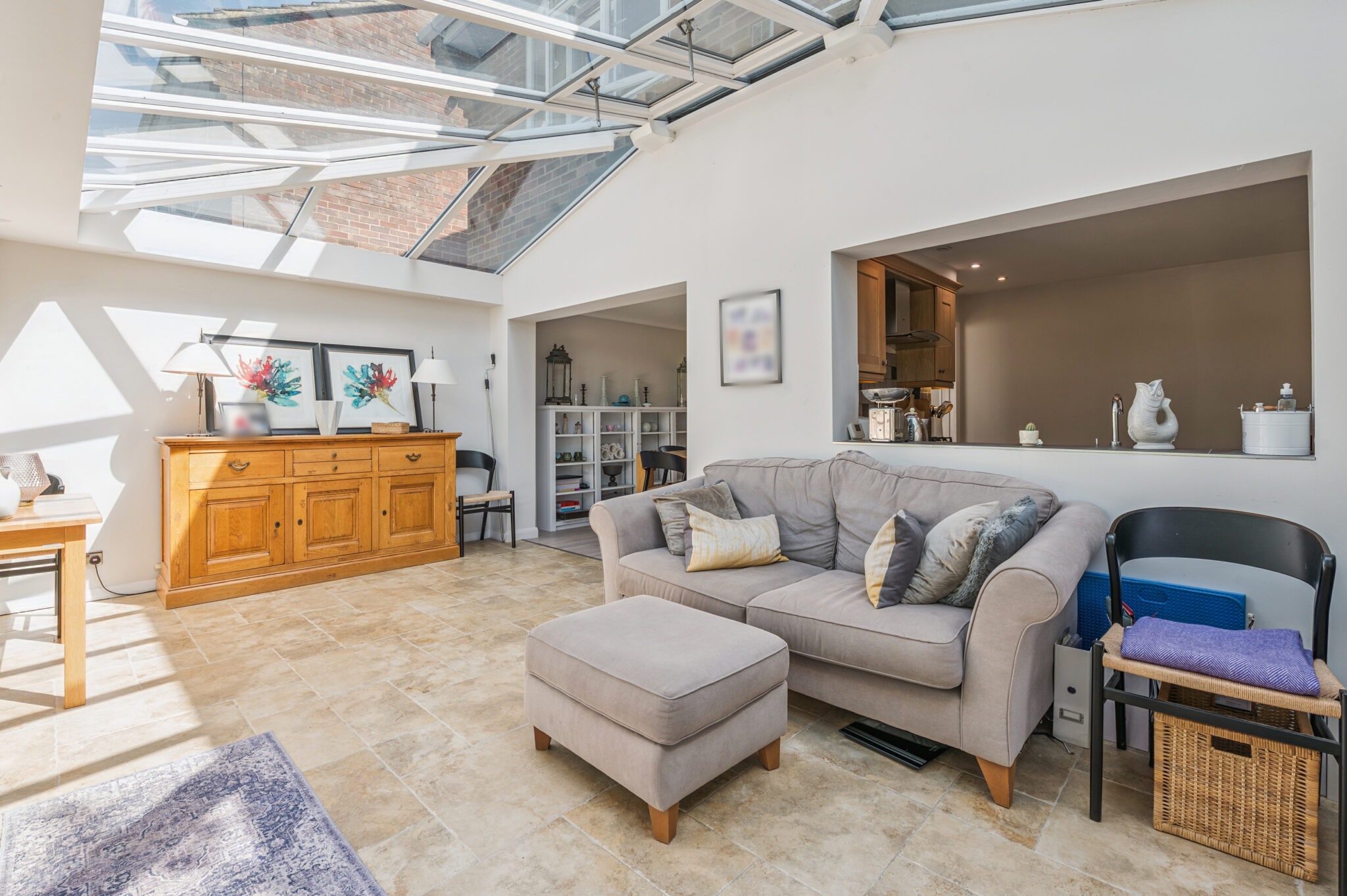 A bright conservatory, now a relaxed family room, floods the home with natural light. Engineered oak flooring runs throughout, adding warmth and charm.