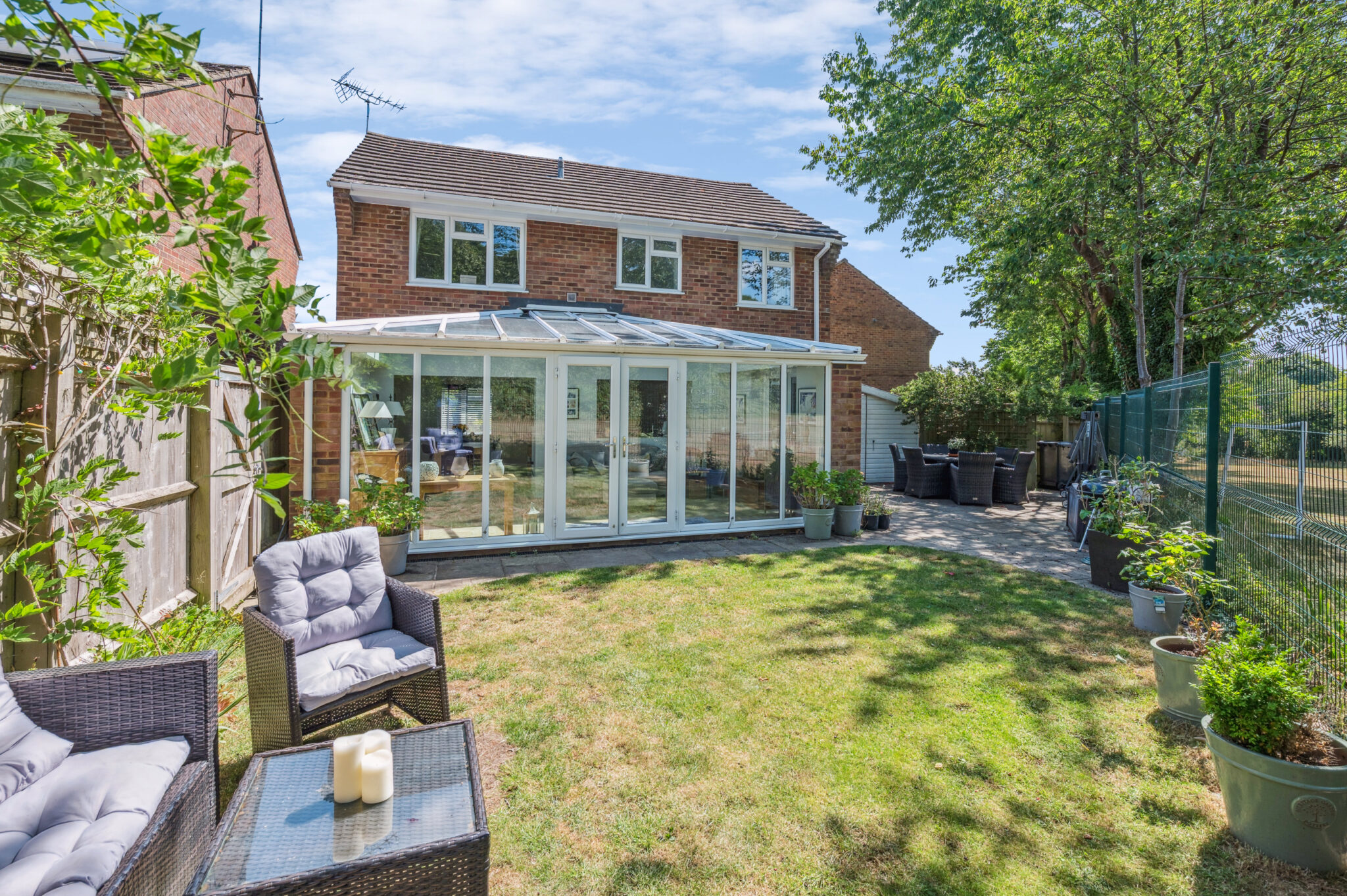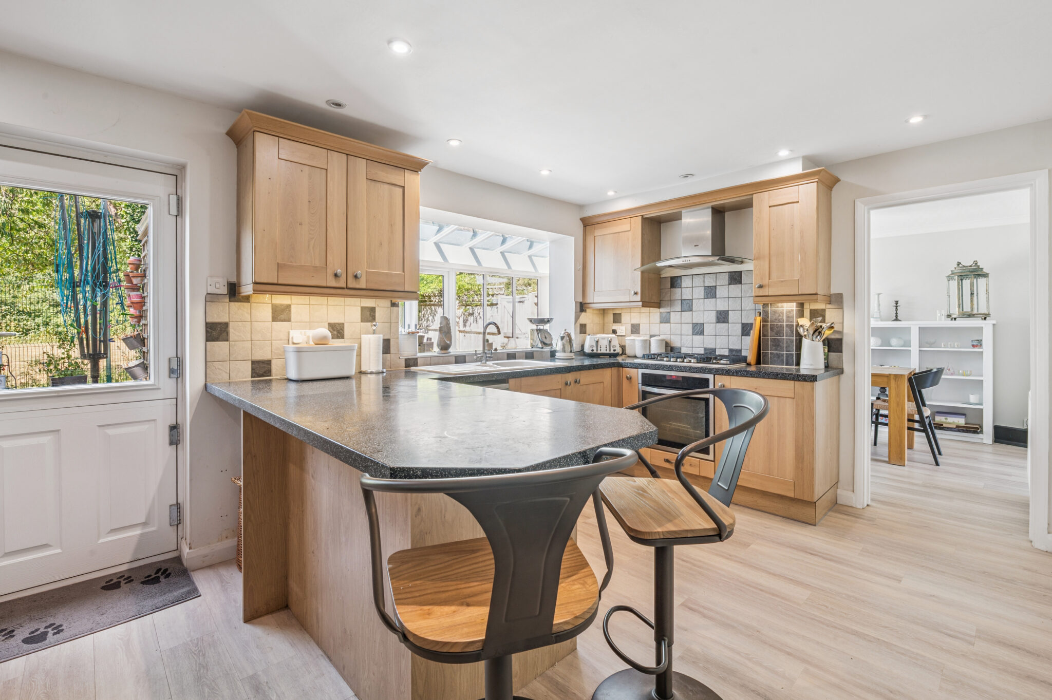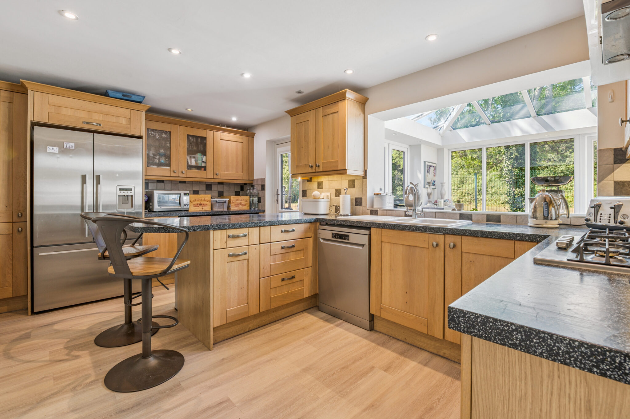 A bright conservatory, now a relaxed family room, floods the home with natural light. Engineered oak flooring runs throughout, adding warmth and charm.