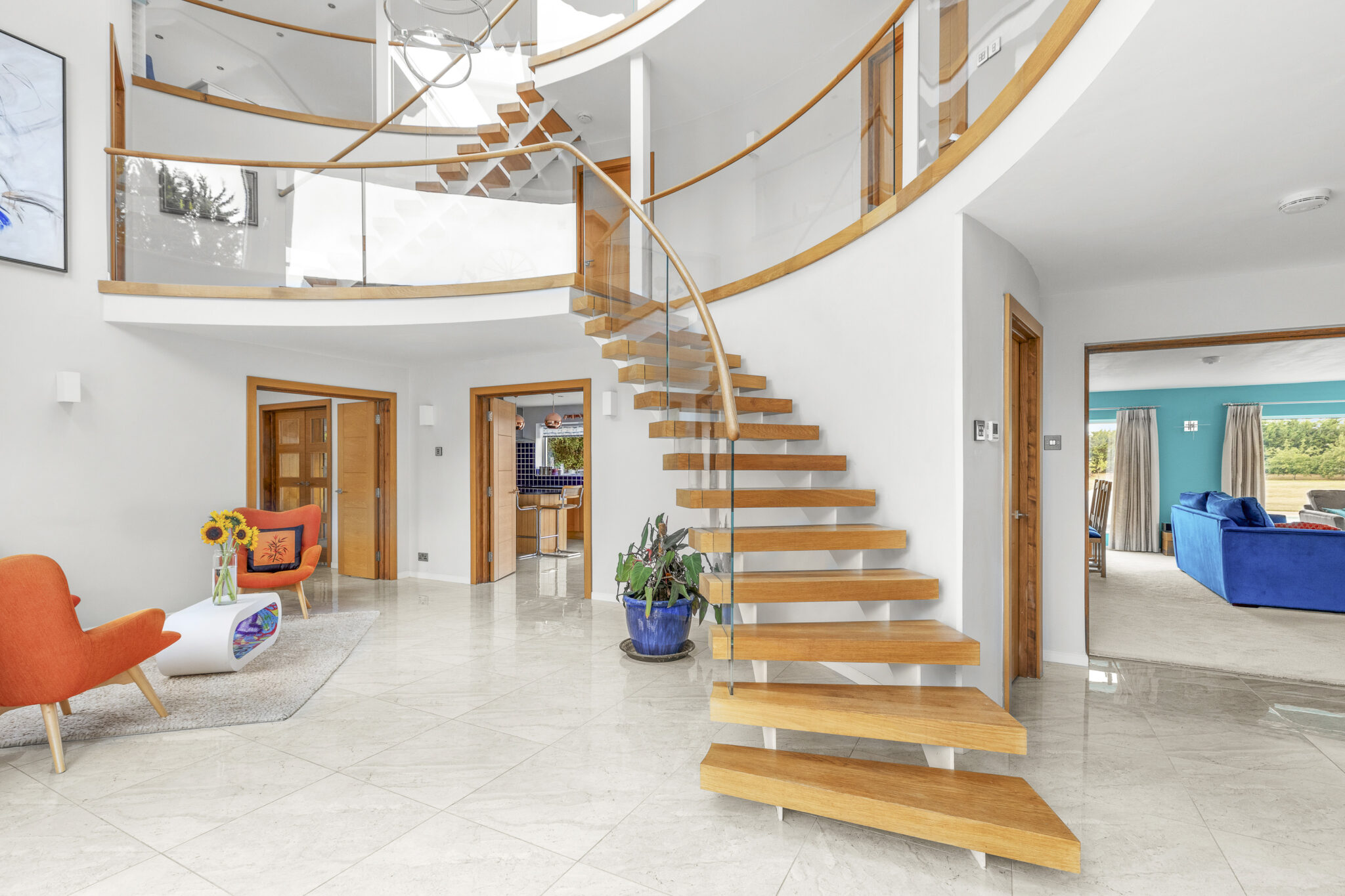 The stunning curved landing is the centre pieces with its amazing curved glass; leading all the bedrooms and up the next floor. The main bedroom suite has doors out to a sun balcony overlooking the garden, plus ‘his and hers’ ensuite bathrooms. There are three further bedrooms on this floor, all of which are ensuite. The second floor has a spectacular open plan study or family area, plus a further large bedroom suite.