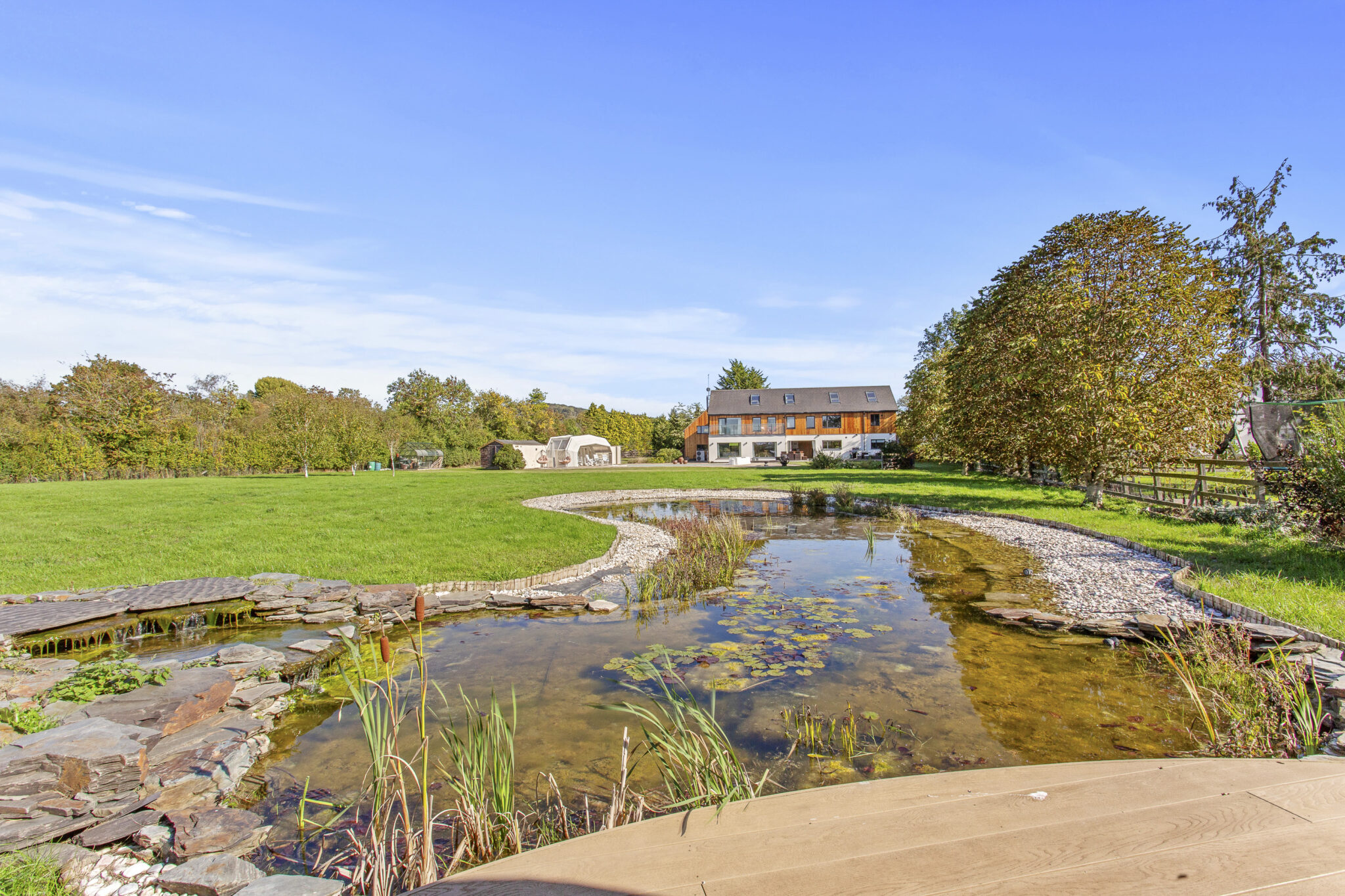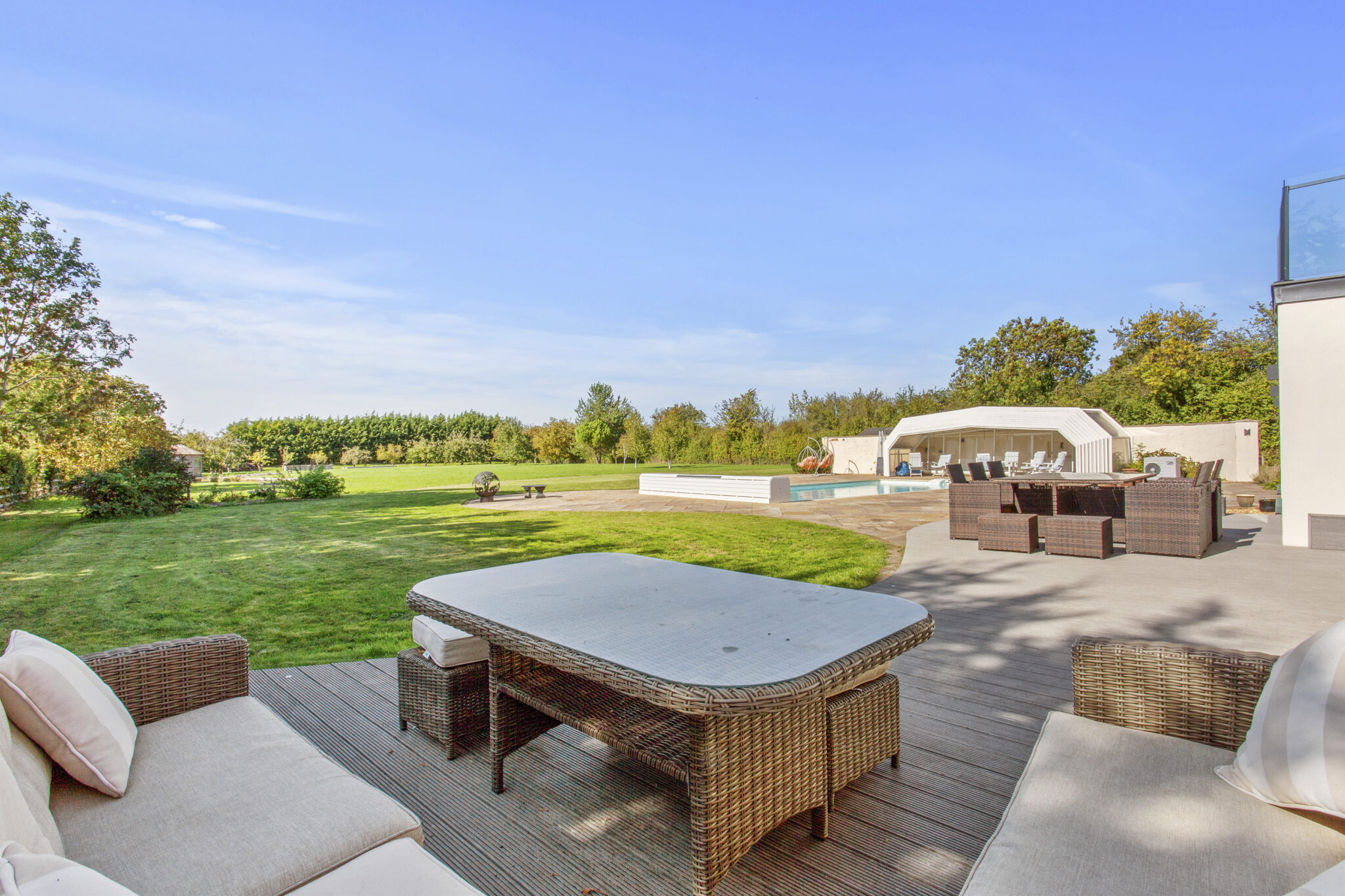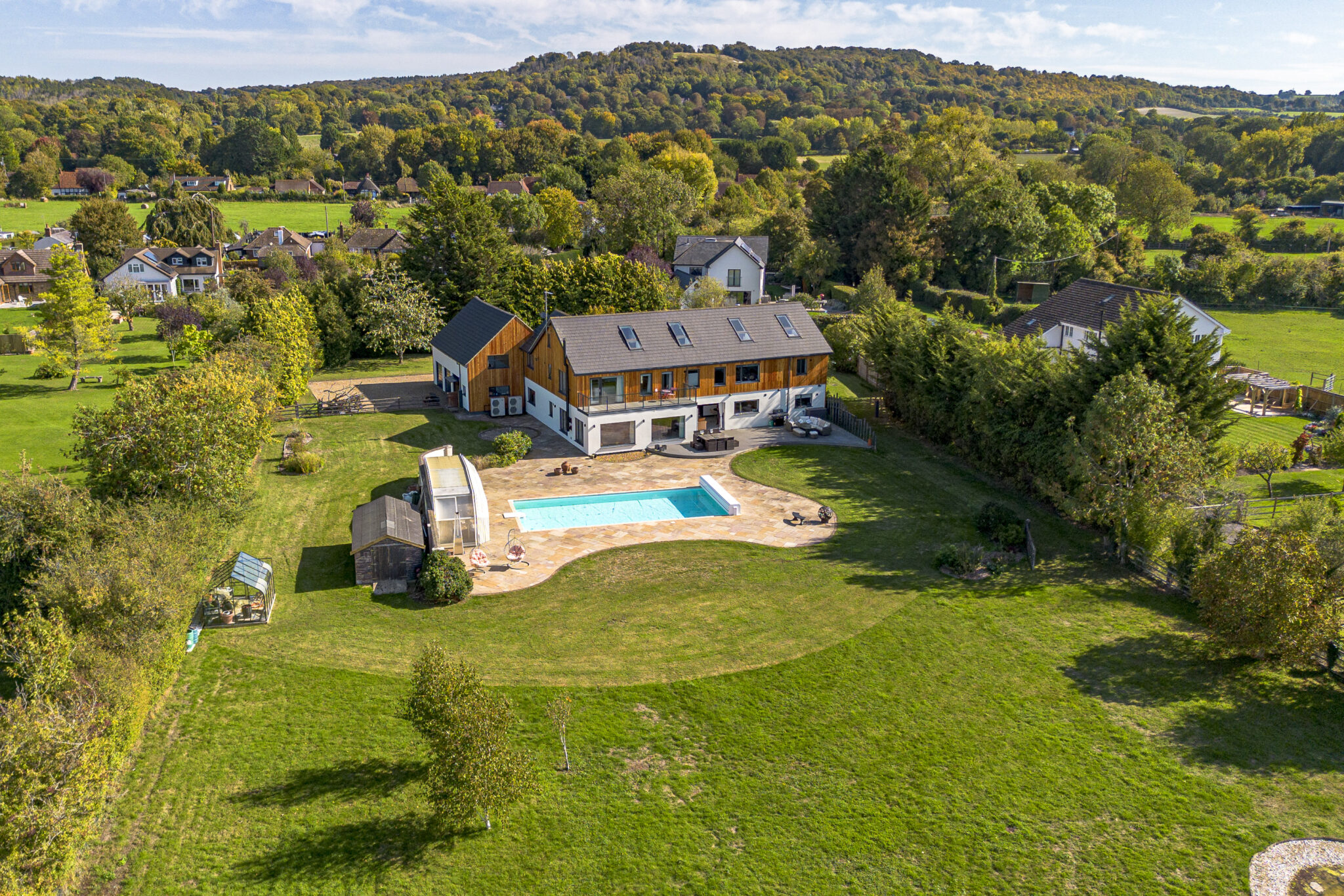 The property is approached via electric gates leading to a generous circular driveway provides ample parking for numerous cars; the driveway continues on round to the triple garage. Directly behind the house there is a large area of decking leading to an extensive paved terrace up to and around the pool, perfect for outdoor entertaining. The gardens enjoy a lovely south westerly aspect with a wide expanse of lawn interspersed with mature bushes, shrubs, trees and hedging on the boundaries, providing plenty of privacy. A feature of the large garden is the large pond and adjacent summerhouse, proving a lovely tranquil setting. There is also a greenhouse and vegetable plots.