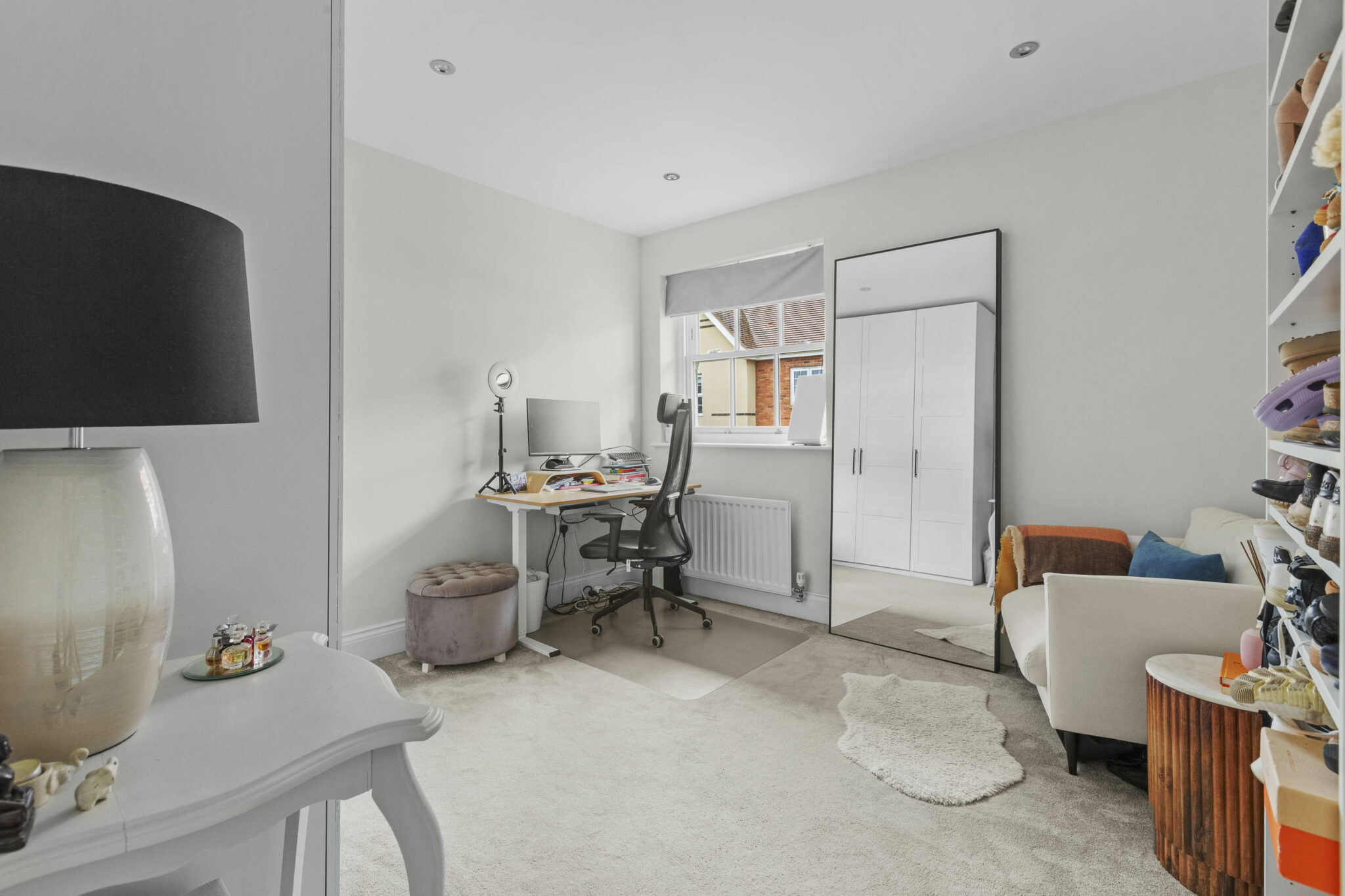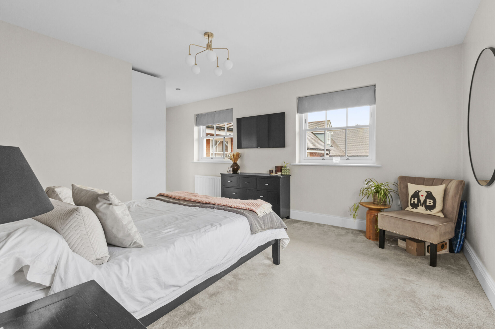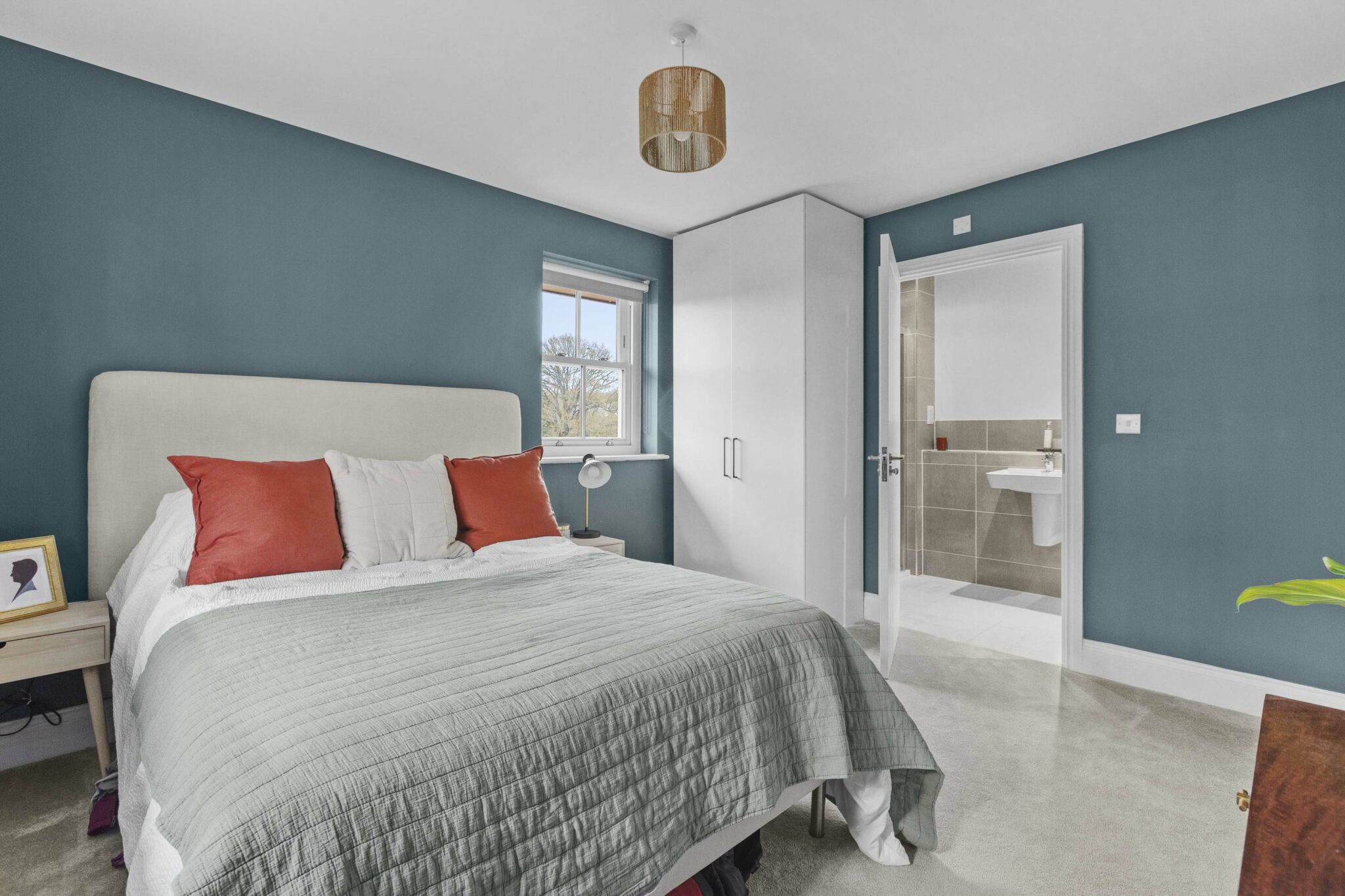 The sitting room is generous in size and benefits from a double aspect, making it feel airy and inviting. There is a large storage cupboard to help keep things tidy, and the same beautiful flooring continues here. Upstairs, the principal bedroom is a real treat. It’s a luxury size, with space for fitted cupboards for plenty of storage and a generous ensuite for added privacy. The guest bedroom also has its own ensuite shower room, while the third double bedroom is served by a beautifully appointed family bathroom.