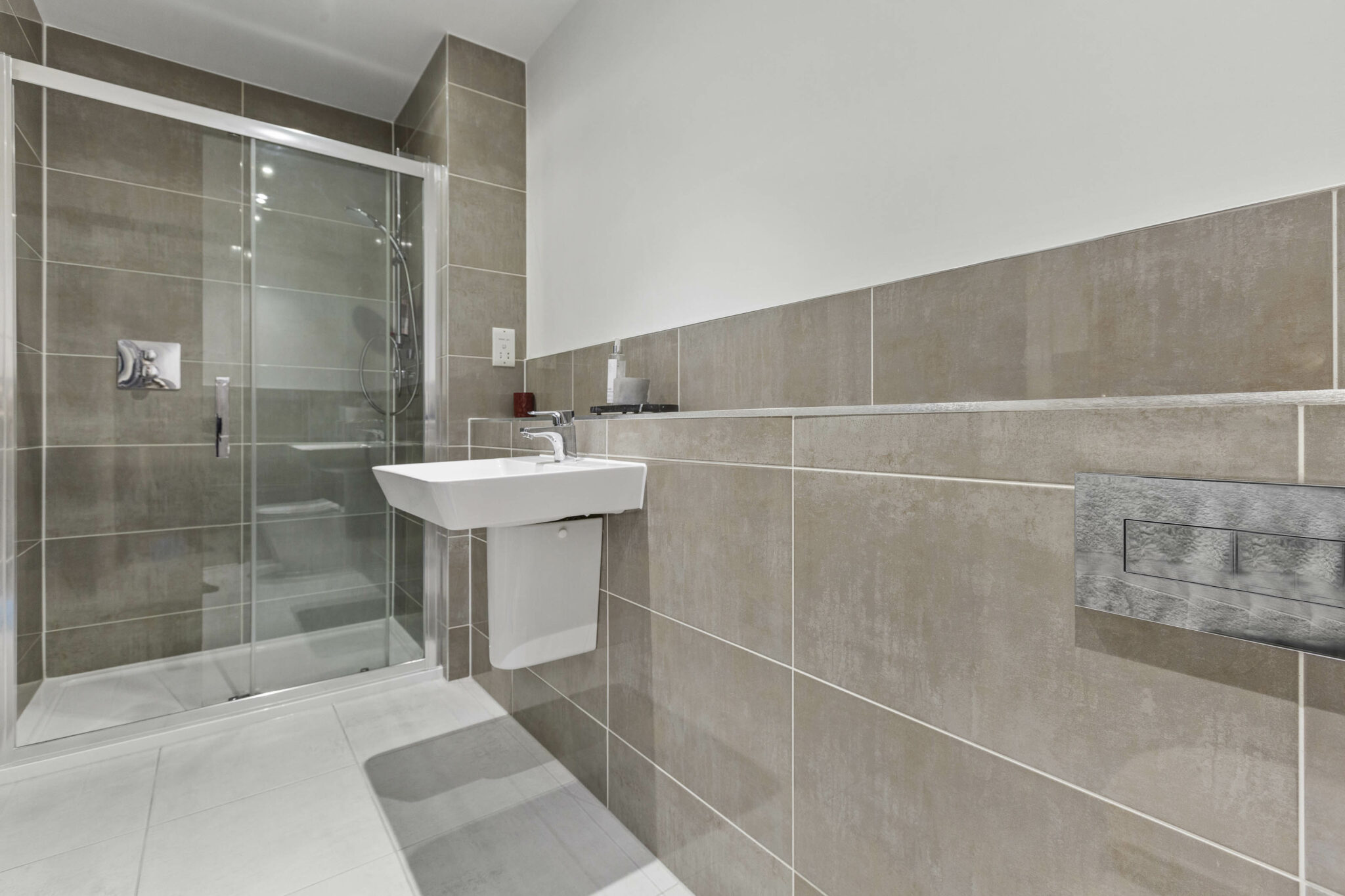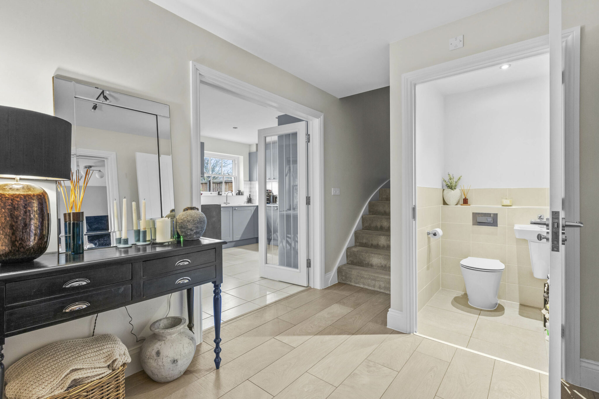 • Spacious and welcoming entrance hall with grey wood effect porcelain tiles from Porcelanosa and downstairs cloakroom