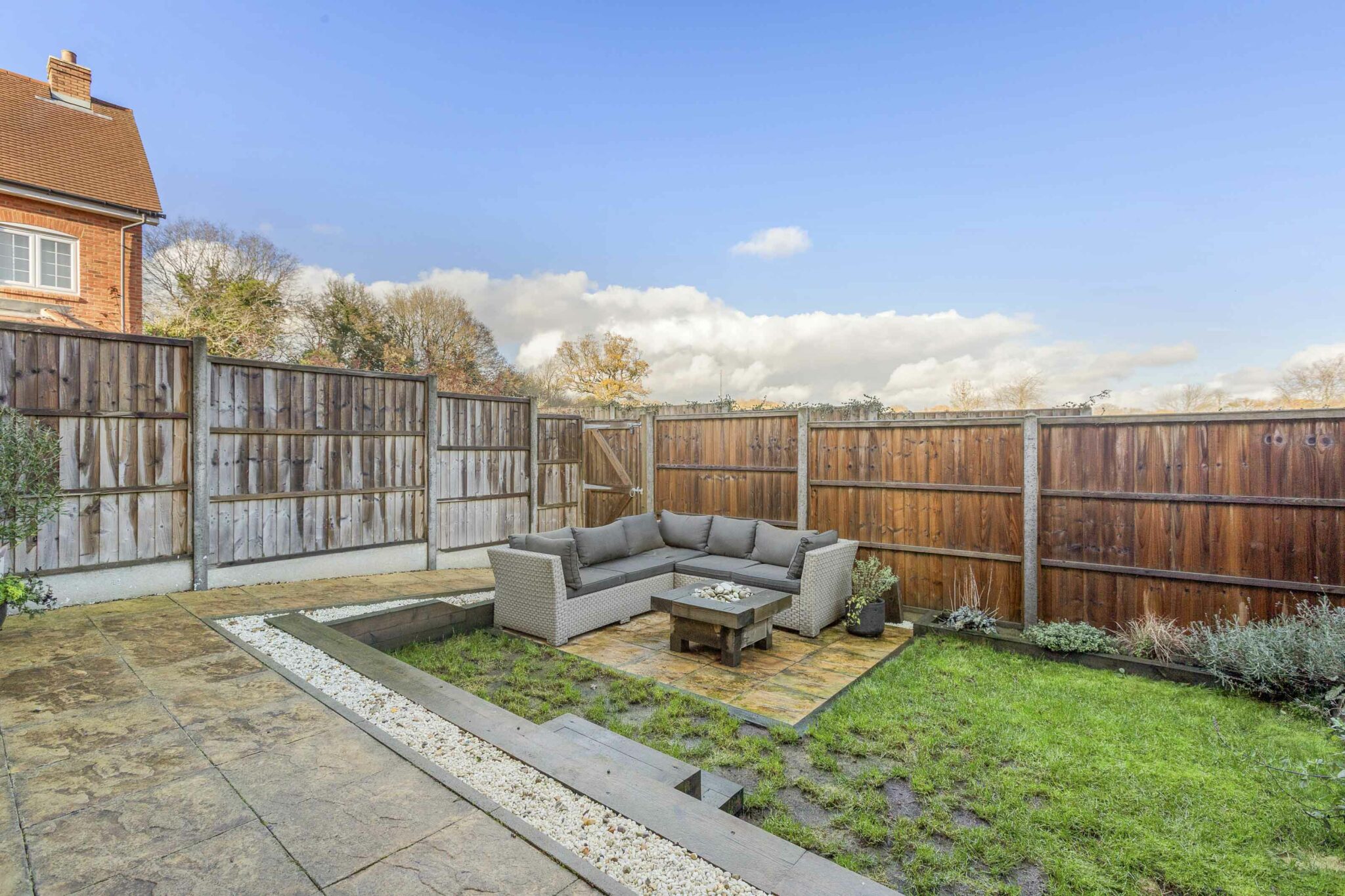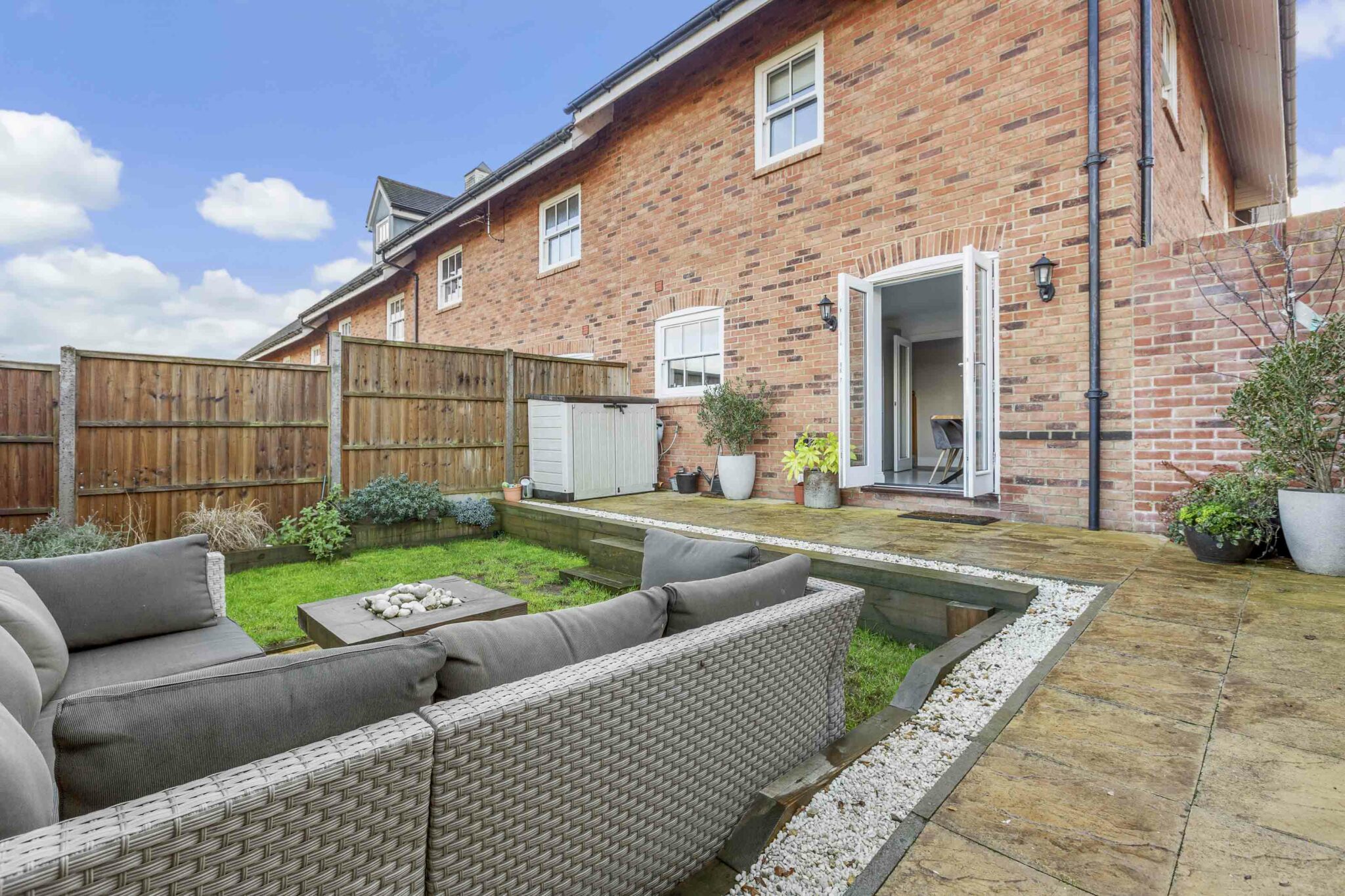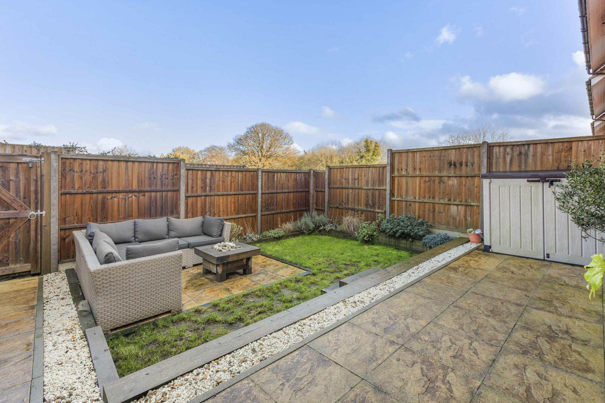 • Easy to maintain rear garden with two patio areas, small area of lawn and raised beds all well enclosed by timber panel fencing and garden gate