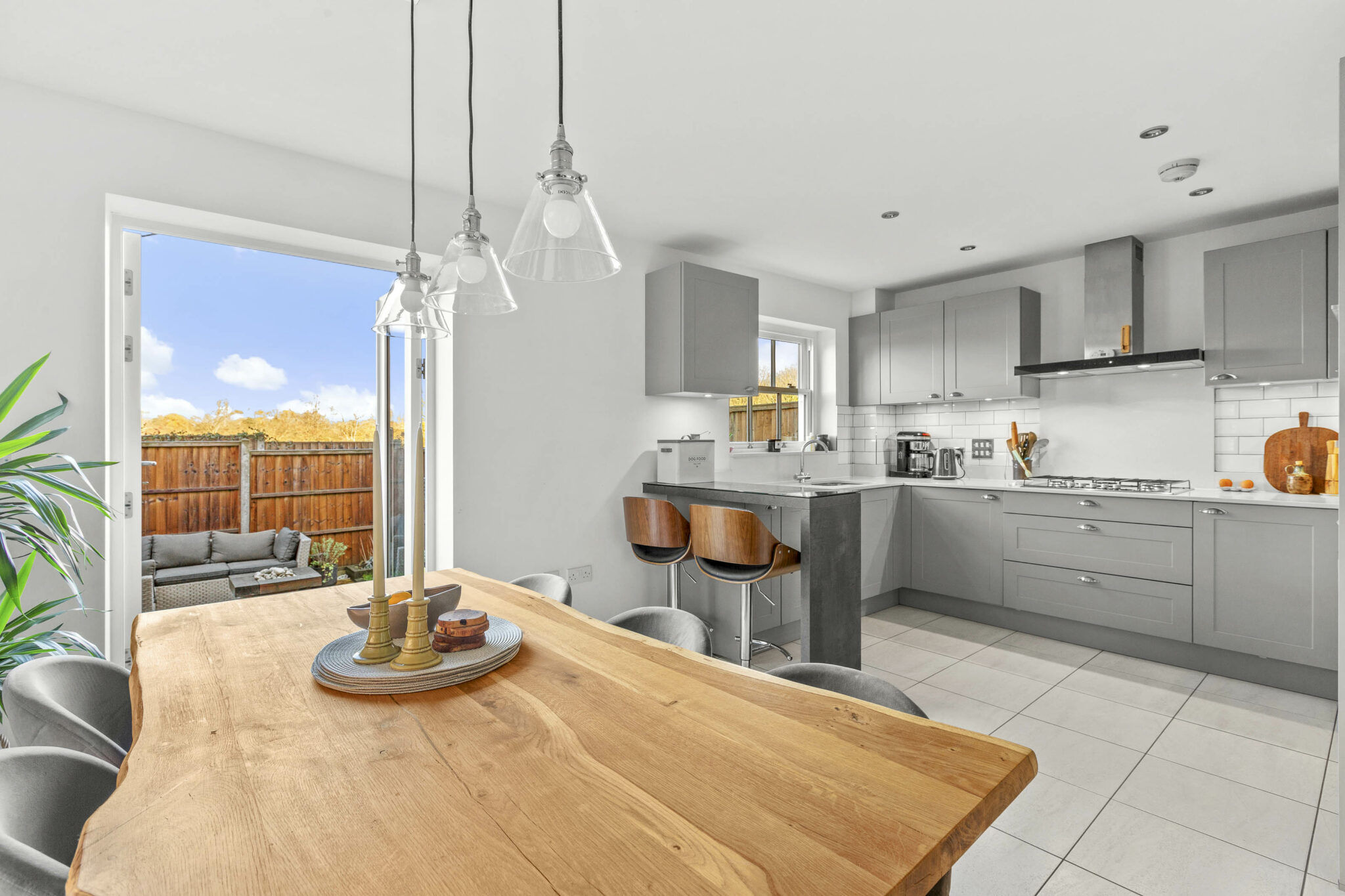 Step inside and you will find a spacious and welcoming entrance hall, featuring grey wood effect porcelain tiles from Porcelanosa that runs through much of the ground floor. There is a handy downstairs cloakroom, perfect for guests. The heart of this home is the bright and spacious 17x11ft shaker style kitchen, which flows seamlessly into the breakfast and dining area. This space is ideal for family meals or entertaining friends. The kitchen is well equipped and finished to a high standard, with patio doors that let in plenty of natural light.