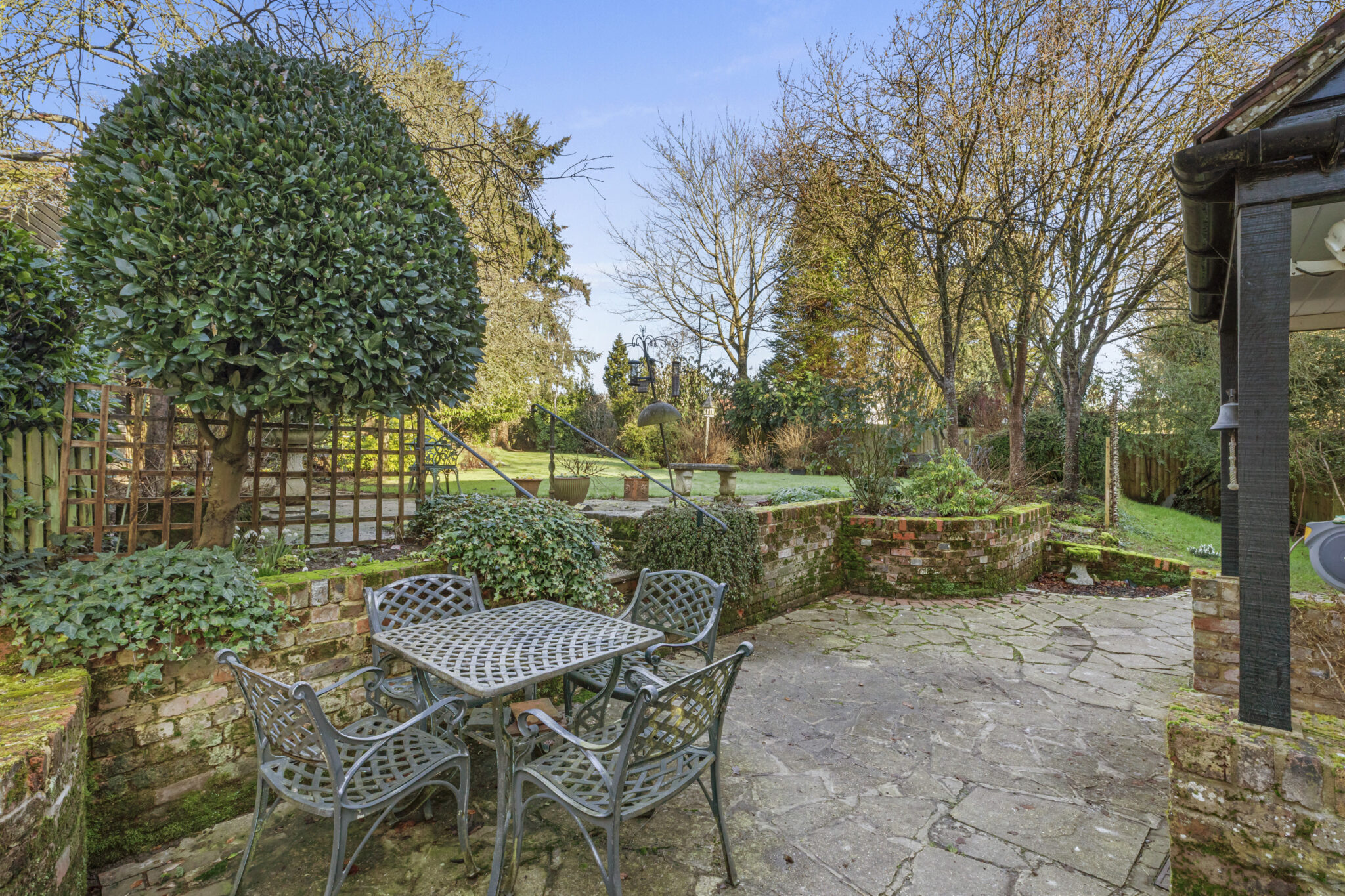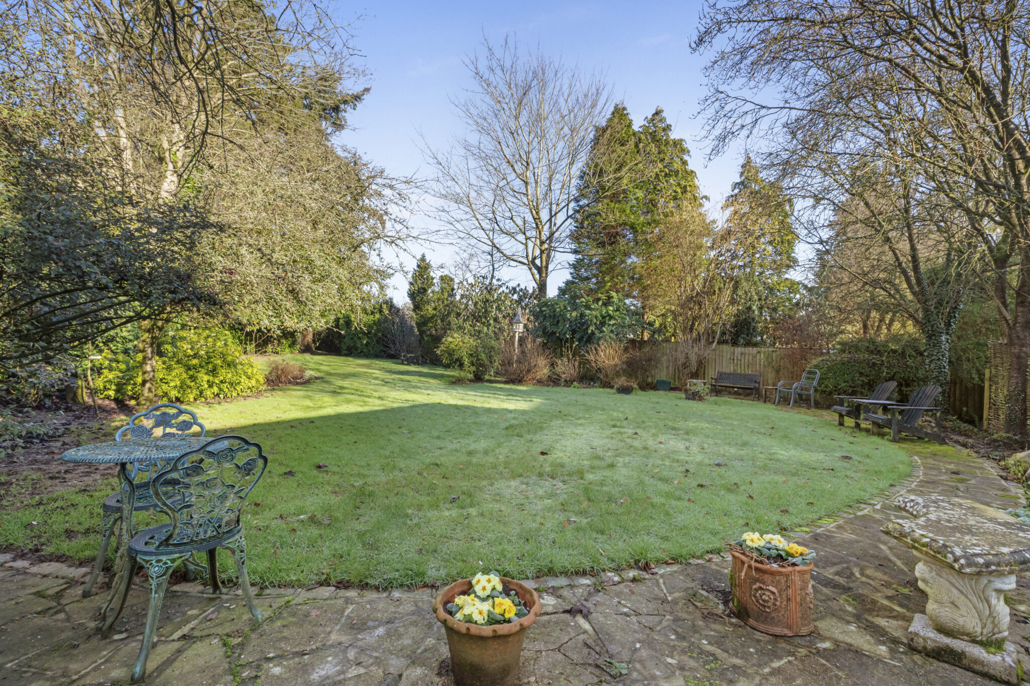 The gardens are a picture for most of the year, laid predominantly to lawn with well stocked mature beds and borders providing colour and privacy. There is a paved terrace with steps down to a second off the breakfast room.