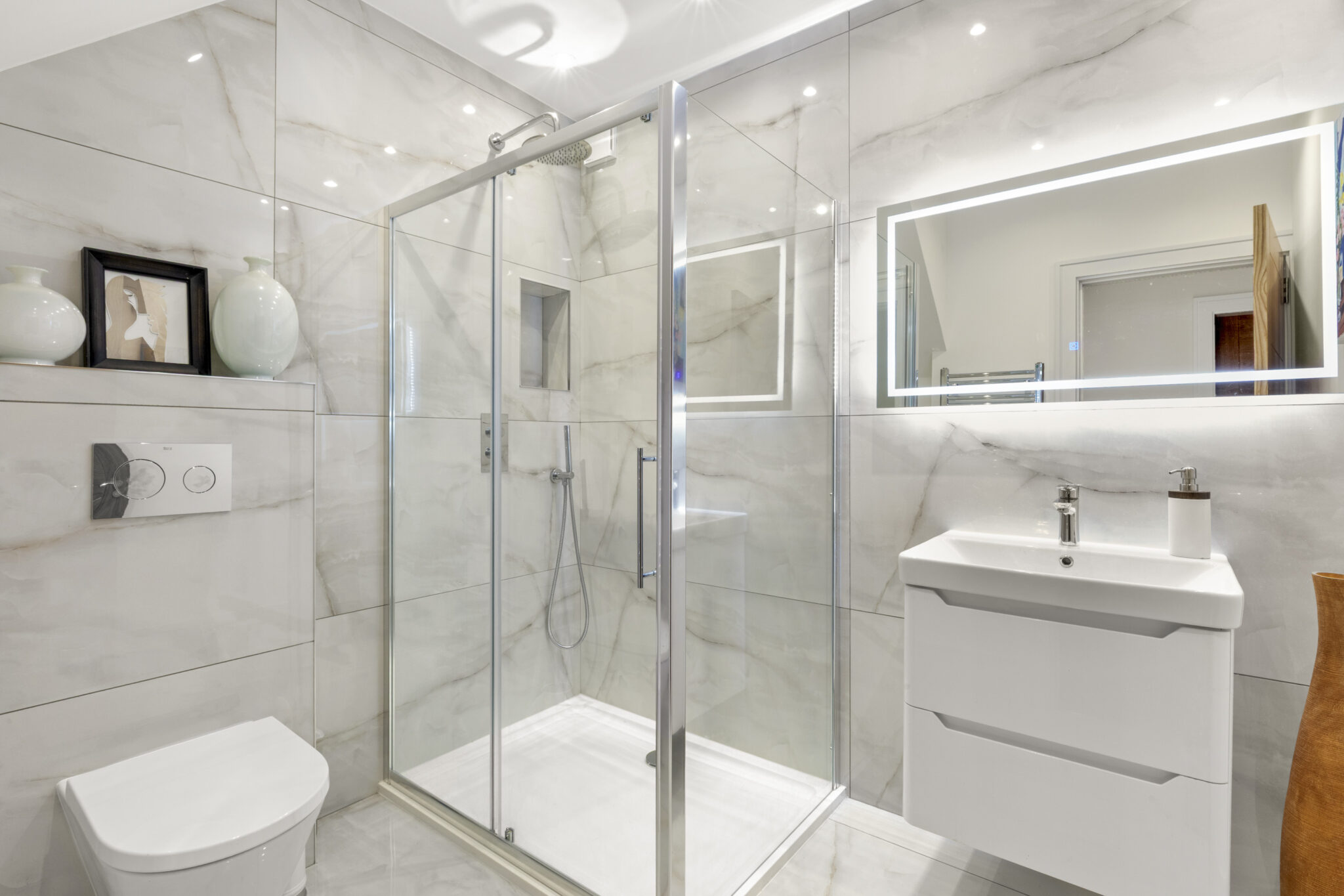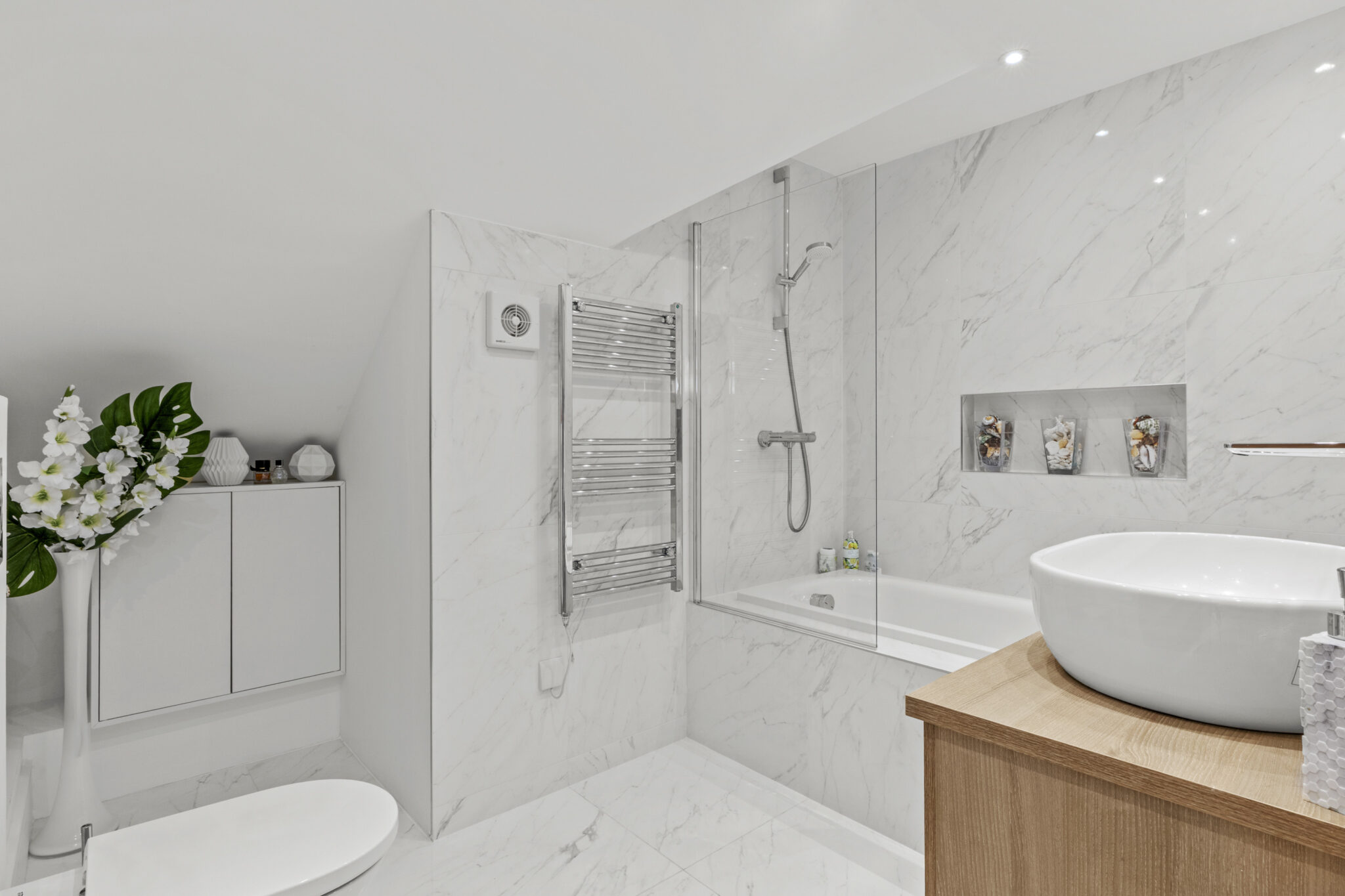 The accommodation includes three generous bedrooms and three modern bathrooms, with a luxurious principal suite and two further double bedrooms. A flexible study provides the option of a fourth bedroom or home office. Underfloor heating throughout both floors, powered by an energy-efficient air source heat pump, ensures year-round comfort, while ample storage and a welcoming entrance hall add everyday practicality. Offered with no onward chain, this home is ready for immediate occupation.