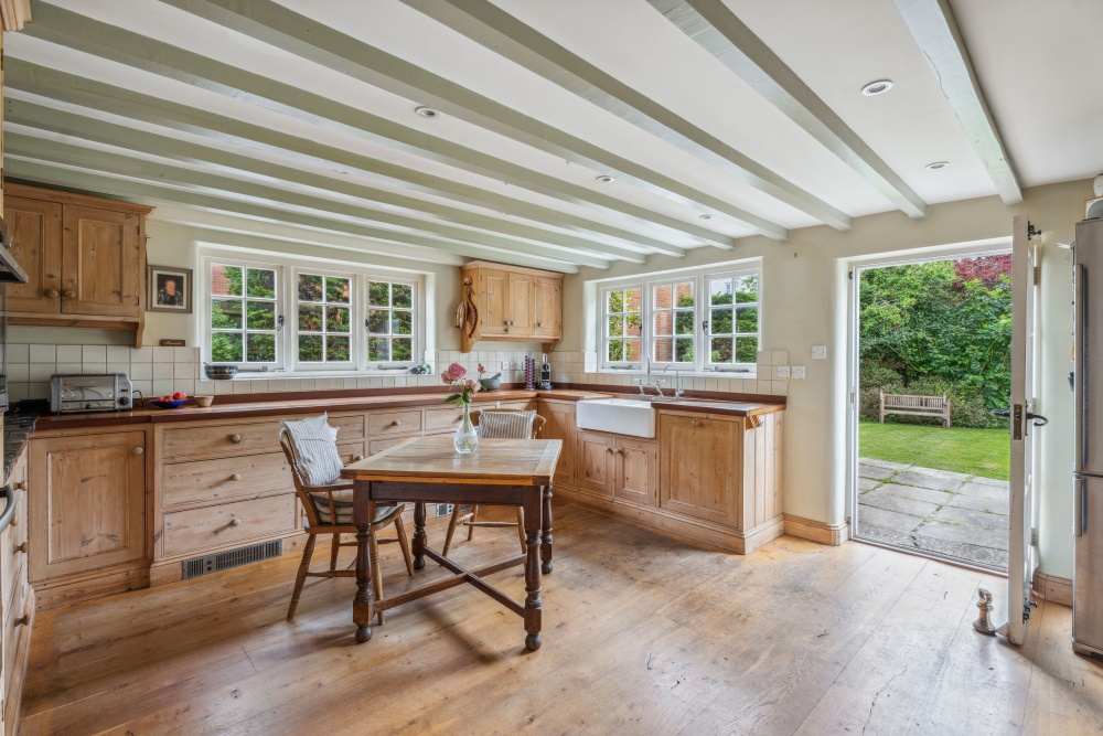 The focal point of the charming sitting room is the original inglenook fireplace complete with bread oven. The separate dining room also has a pretty fireplace and hearth. The kitchen/breakfast room has been comprehensively fitted with handmade units. There is a rear hallway/library which has casement doors opening to a lovely walled courtyard, together with a staircase to the first floor and door through to the garages. Completing the ground floor is a cloakroom, boot room and utility room.