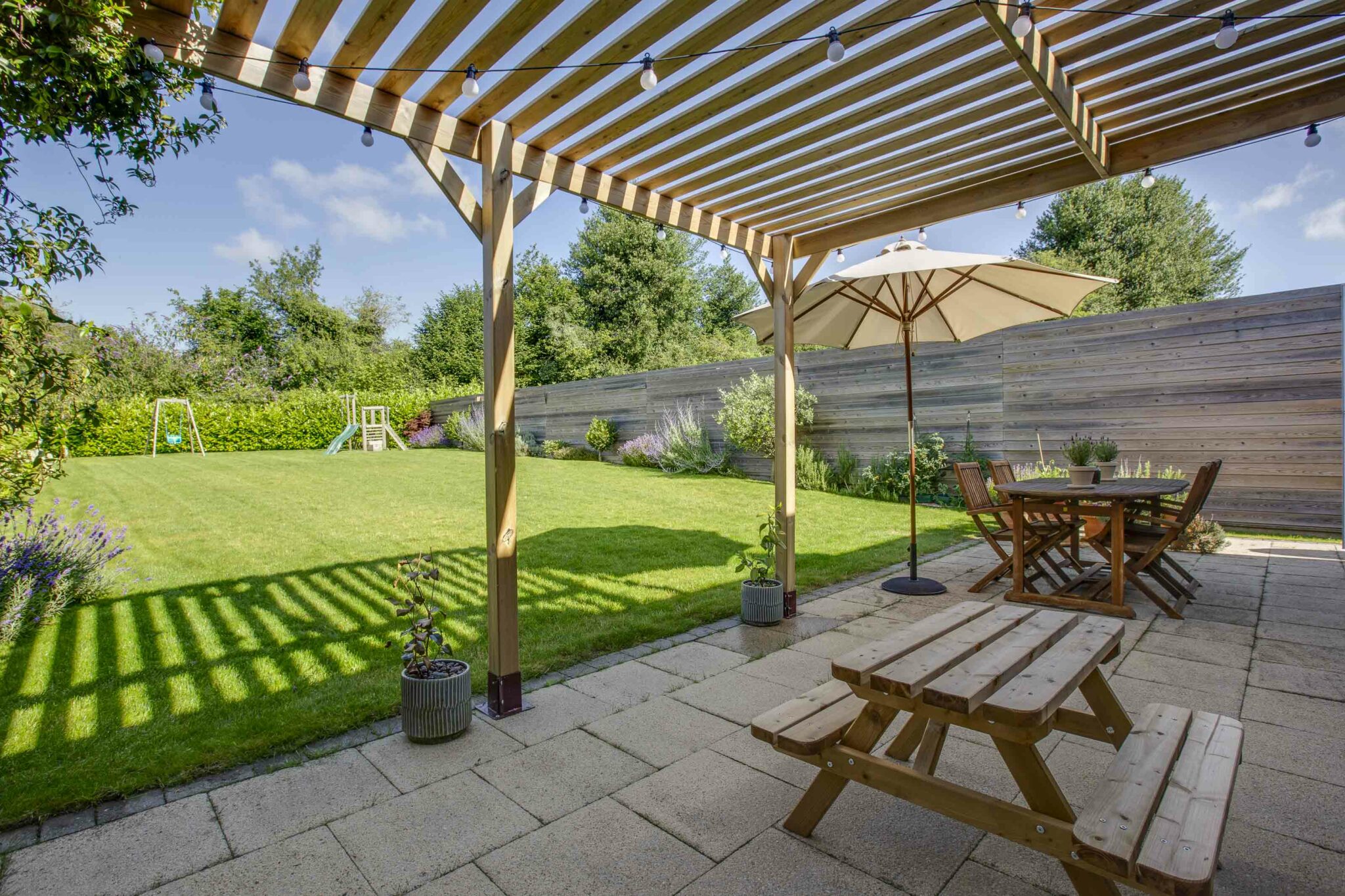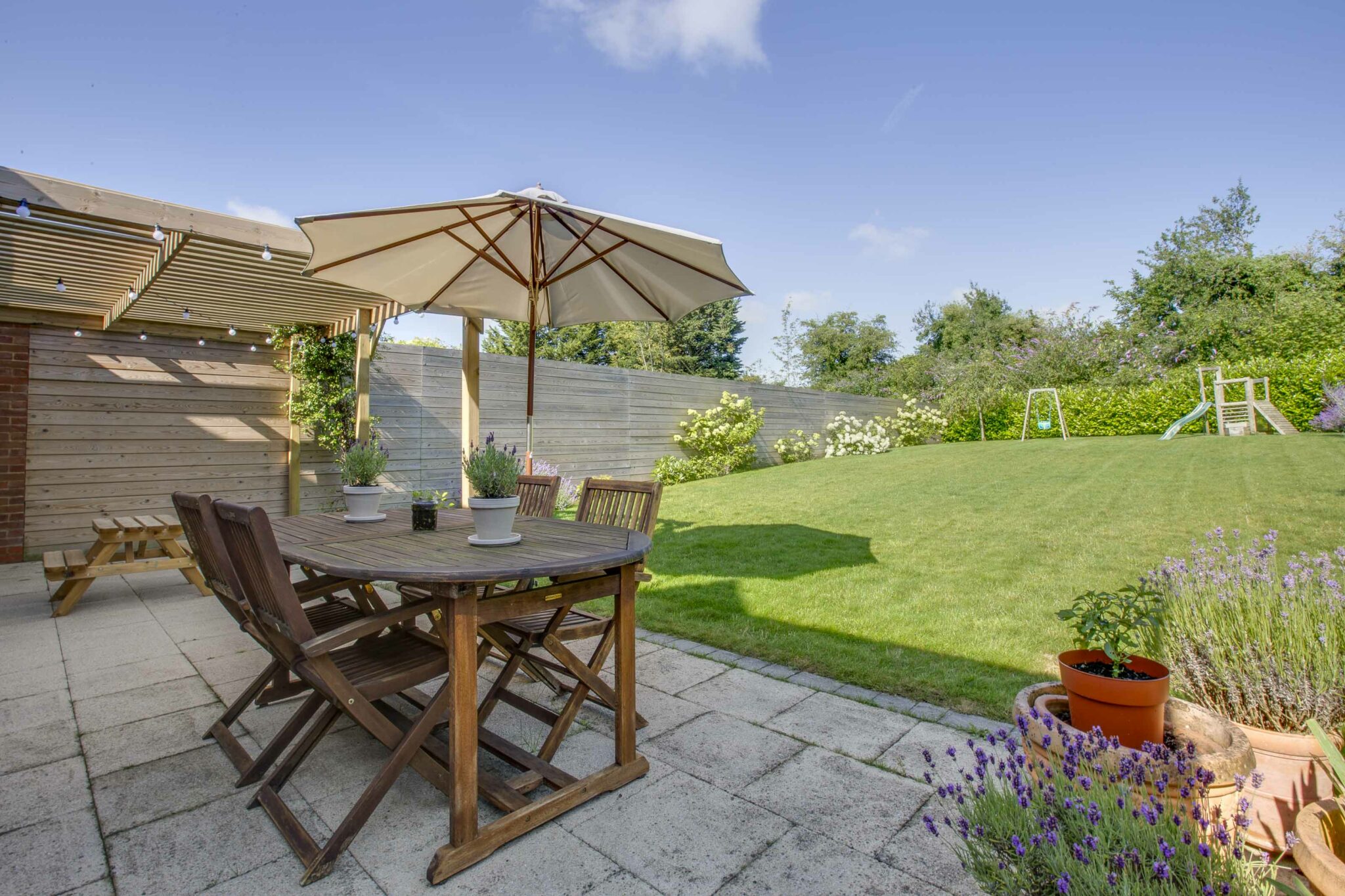 The generous rear garden enjoys a delightful westerly aspect being mainly laid to lawn with well stocked herbaceous borders. Immediately to the rear is a large terrace, well screened with a pergola offering a pleasant shady nook for al-fresco dining. The garden is enclosed with hedging and panelled fencing with mature trees to the rear affording a good degree of privacy and a glorious backdrop to Rowan House.
