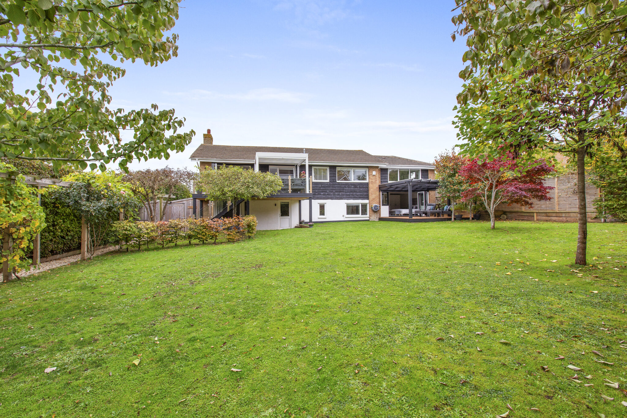 The principal bedroom suite is stunning, complete with a dressing room, ensuite bathroom, and a private covered decking area. Down the hall, four additional bedrooms and a family bathroom await, thoughtfully situated on the ground floor for convenience.