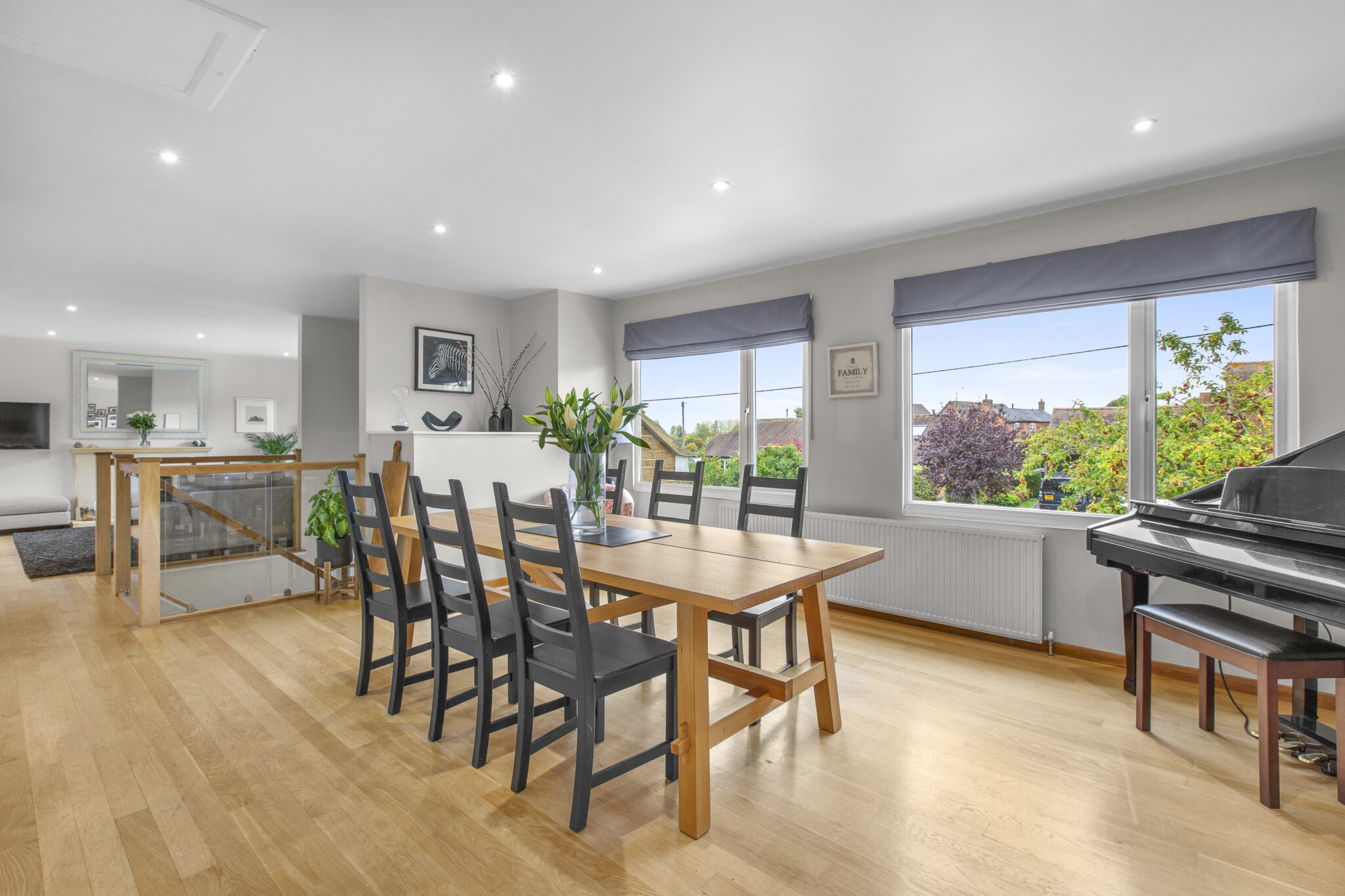 The heart of this home is undoubtedly the stunning kitchen/breakfast/family space. A harmonious blend of sleek design and functionality, this area boasts a raised decking area offering sweeping views, creating an ideal setting for hosting gatherings or enjoying a quiet morning coffee.