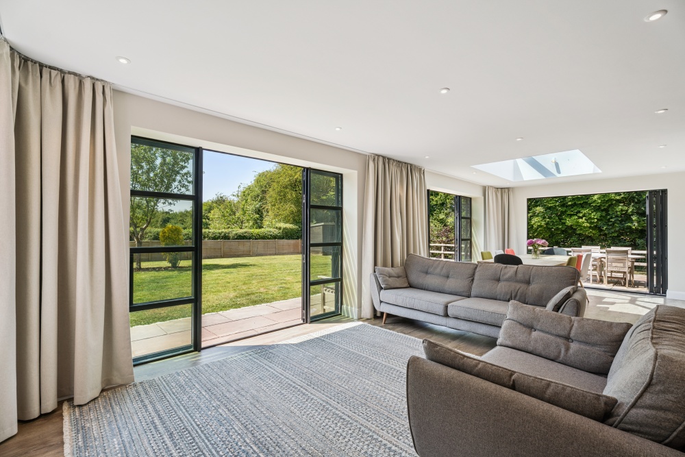 The front door opens into an impressive vaulted reception hall with the stairs up to a galleried landing. The double aspect sitting room has a lovely fireplace as a focal point with a wood burning stove and a generous study on the opposite side of the hall. The kitchen/dining/living space is the real hub of the home with three sets of doors connecting effortlessly with the garden. The kitchen is exceptionally equipped with stylish units, incorporating quartz work surfaces and a full range of integrated appliances. Off the kitchen lies a large utility room a well-proportioned family room.