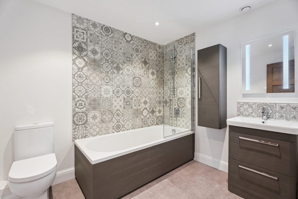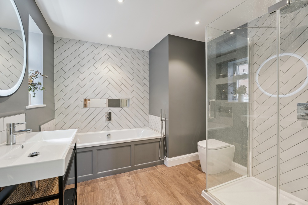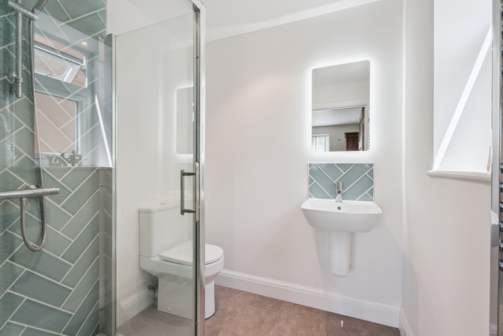 On the first floor the main bedroom has a dressing/wardrobe area and a full ensuite shower room. The second bedroom also has an ensuite shower room, with the additional three bedrooms being served by the family bathroom.
