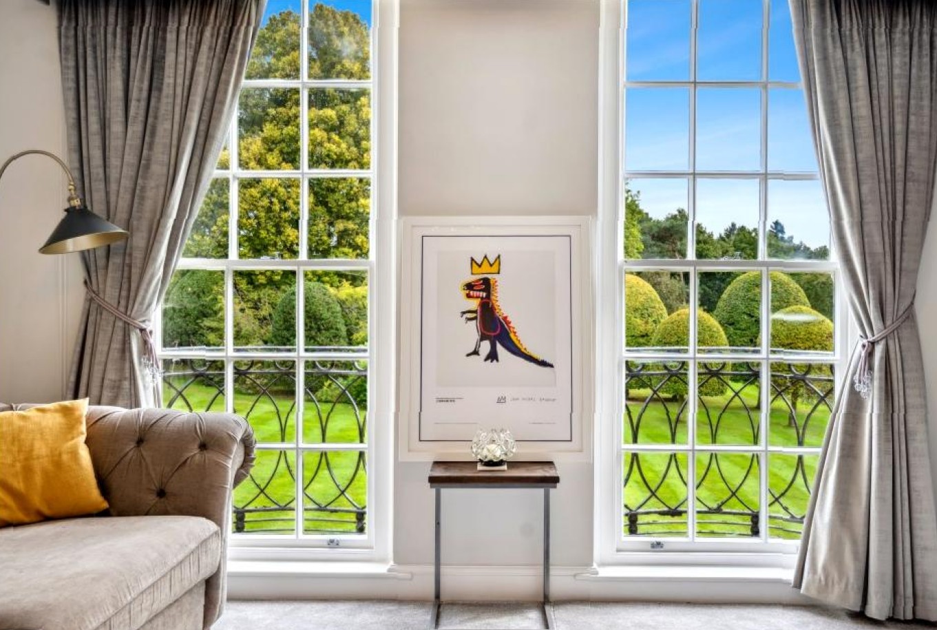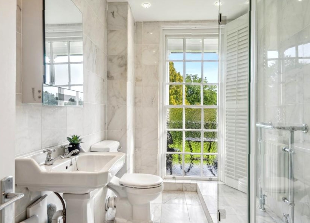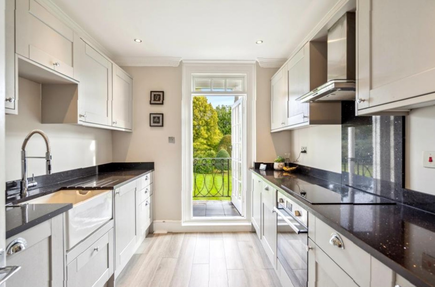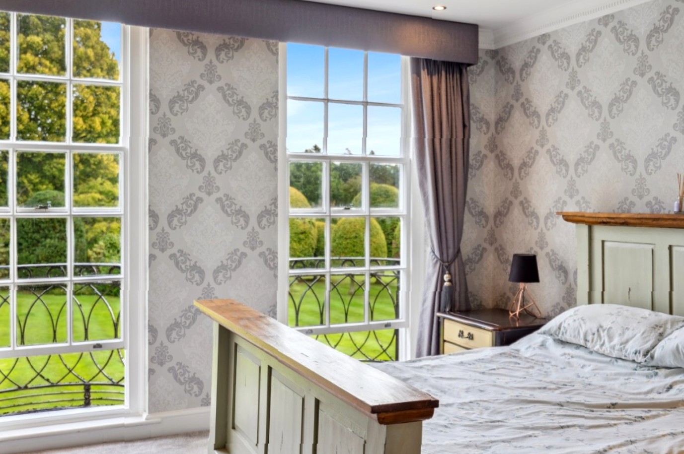 The principal bedroom benefits from bespoke built-in wardrobes, while floor-to-ceiling sash windows throughout the main living areas flood the interior with natural light and enhance the tranquil outlook.