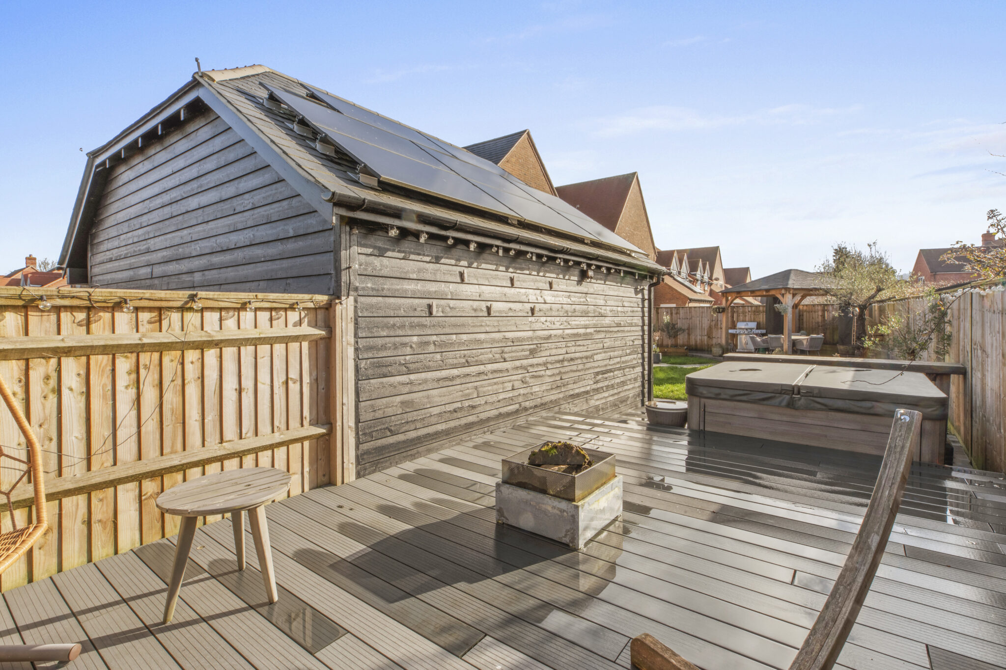 The private, landscaped rear garden is a true highlight, perfectly designed for outdoor dining, family gatherings, and relaxation. Mature planting and thoughtfully arranged borders create a serene atmosphere and a sense of seclusion, while multiple decking areas, including one that wraps around the side of the garage, provide versatile spaces for al fresco meals, entertaining, or simply enjoying the outdoors. The garden is easily accessed via bi-fold doors from the kitchen/living space, inviting the outdoors in and making the most of the property’s seamless flow between inside and out. To the front, the property features a well-maintained lawn and an attractive patioed walkway leading to the entrance, complemented by ample driveway parking in addition to the detached double garage.