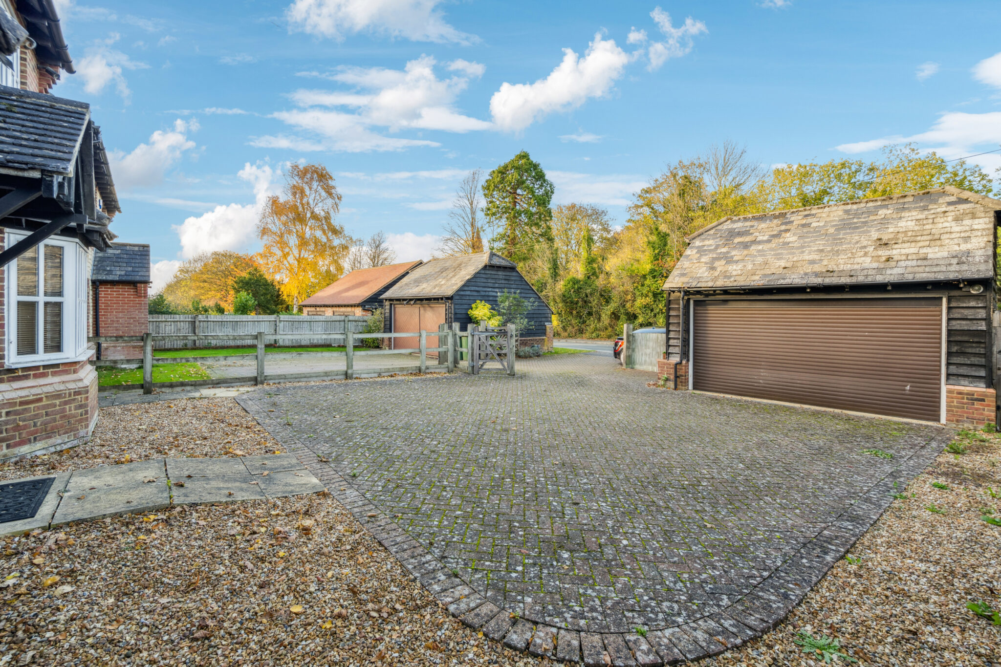 Outside, the property is approached through a welcoming five-bar gate, opening onto a large driveway with plenty of parking and a double garage offering excellent storage and workspace options.