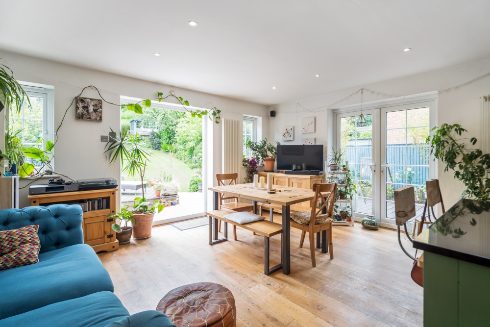 Upstairs, the generously sized master bedroom with its vaulted ceiling, large picture window to enjoy the garden and en-suite (with underfloor heating) creates a private retreat. There are two further bedrooms and family bathroom.