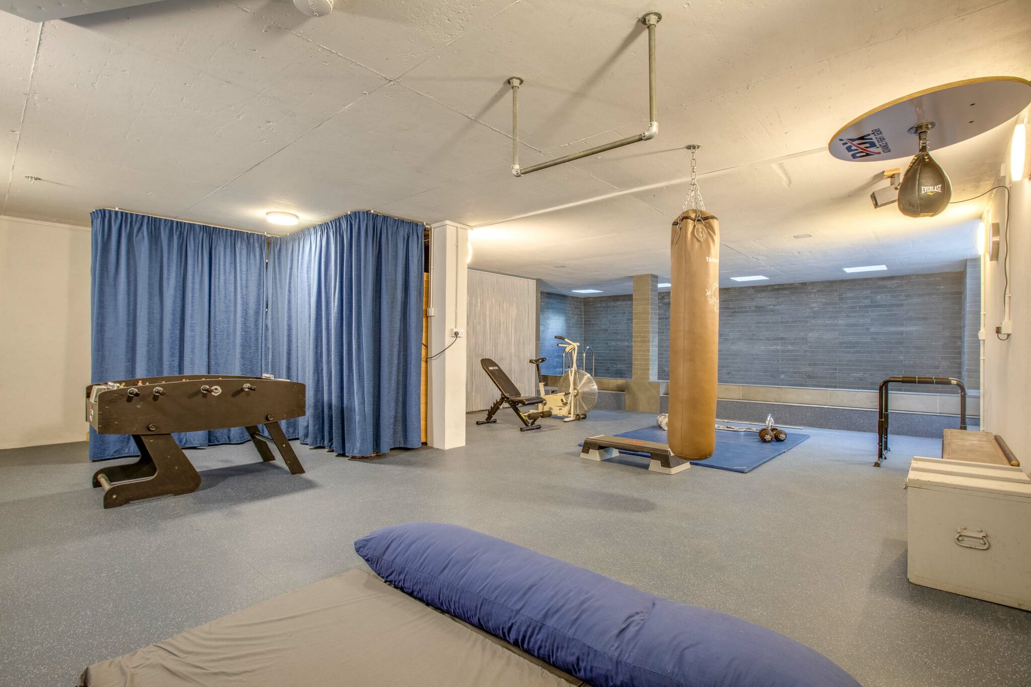 The basement provides a fantastic gym or training space for several people and is complete with climbing wall, a resistance pool (in progress) and sauna.