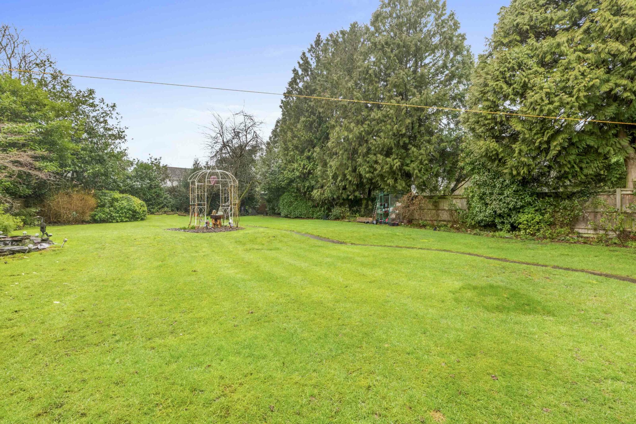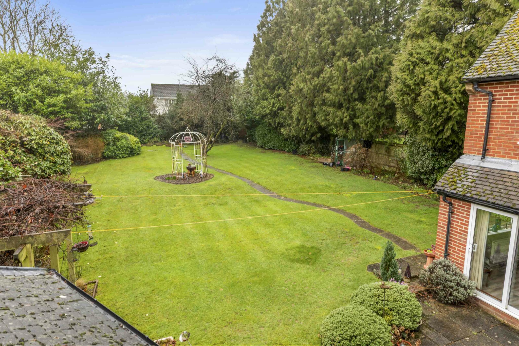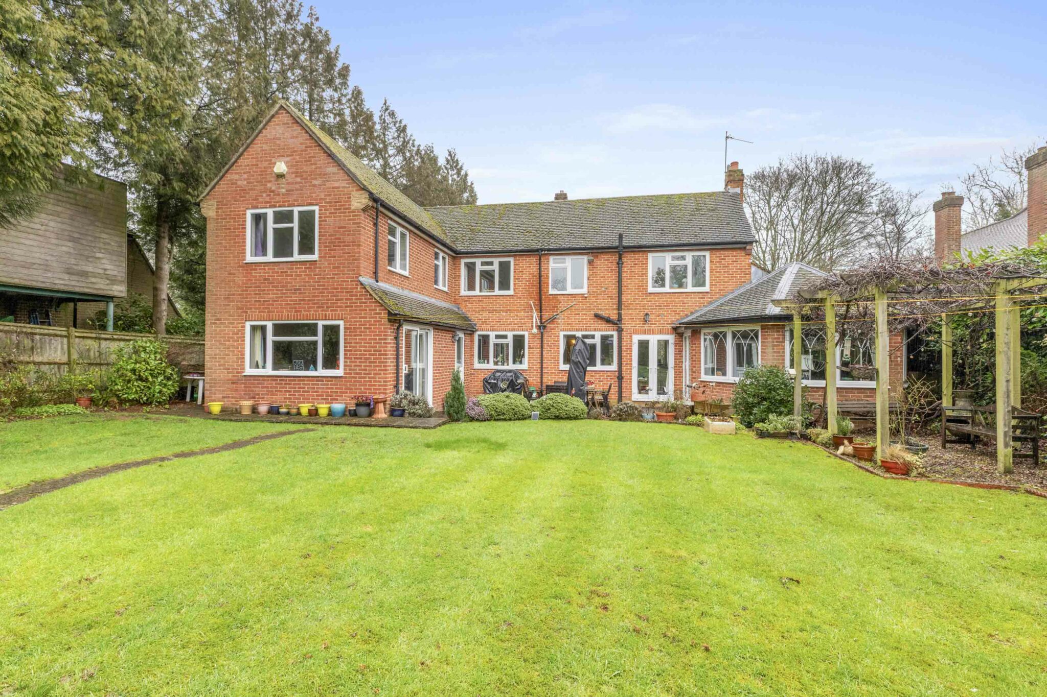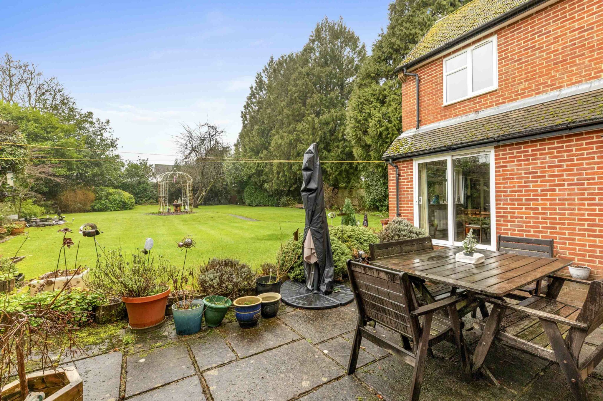 • Generous patio area leading to a large level lawn surrounded by mature hedging and shrubs/trees