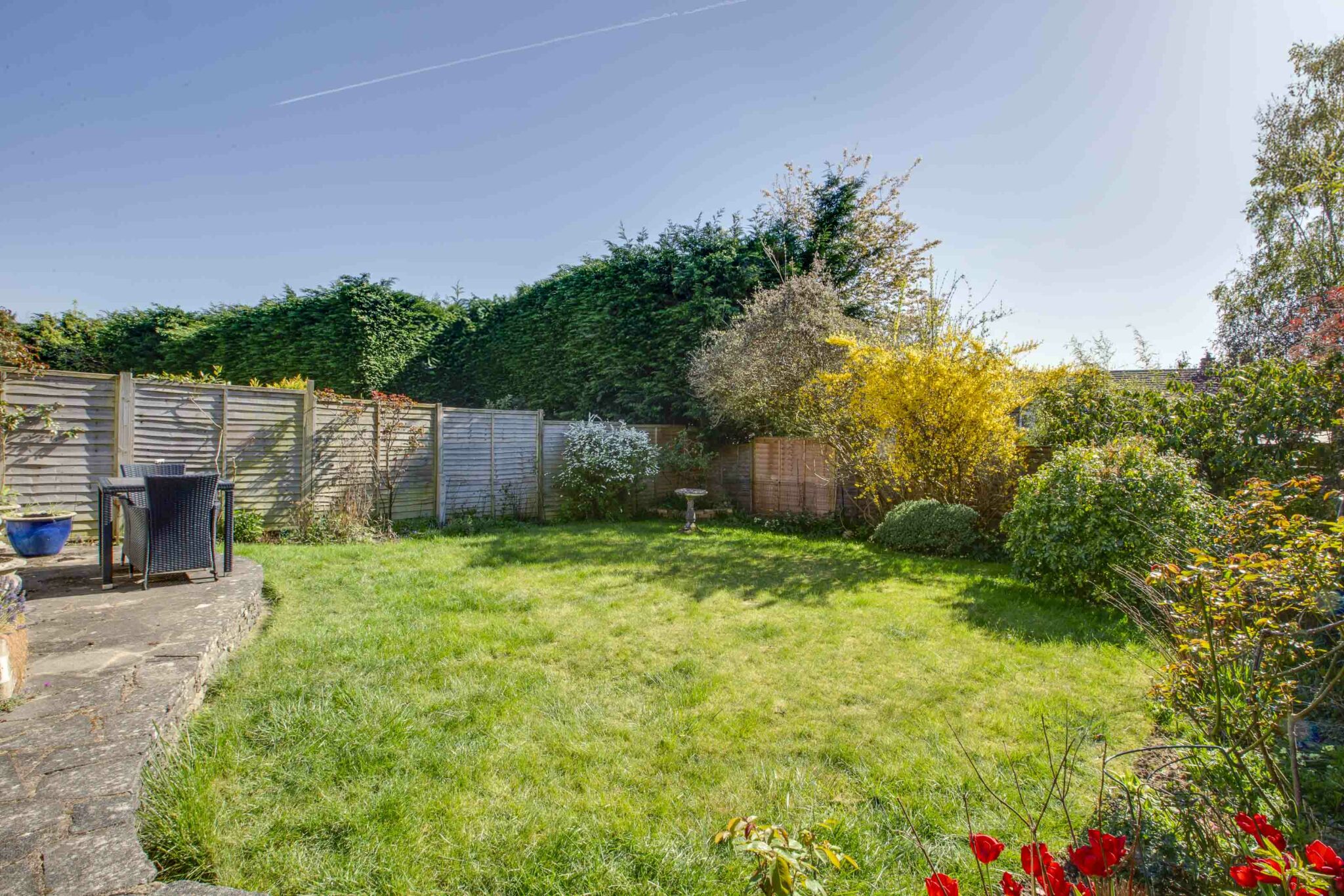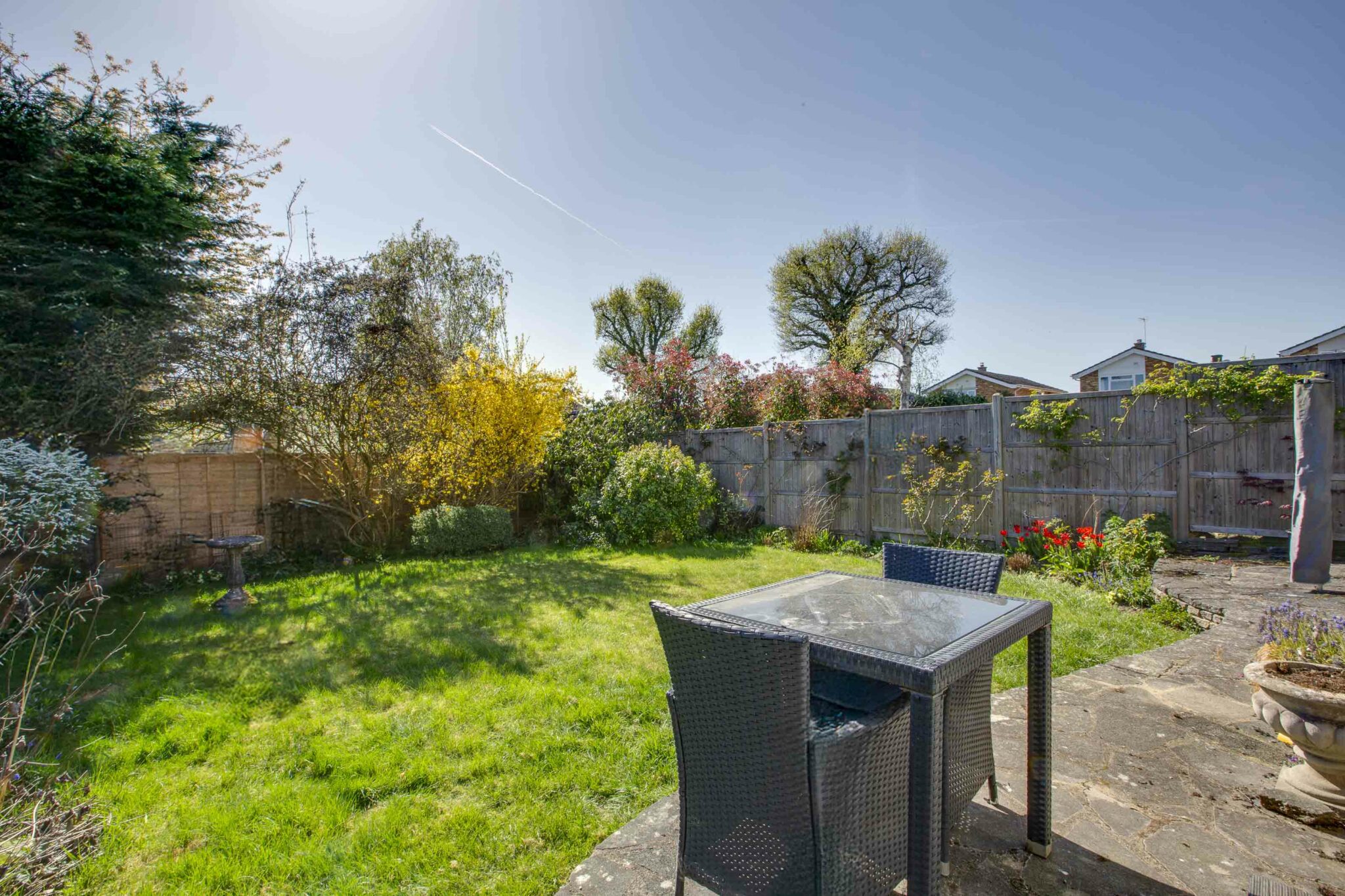 Outside, the property offers driveway parking leading to an attached garage, providing ample parking and storage options. The wide patio area flows onto an area of lawn, enclosed by fencing, creating a secure outdoor space for all to enjoy.
