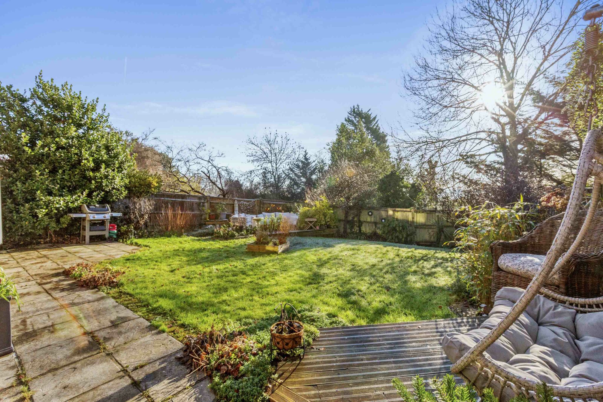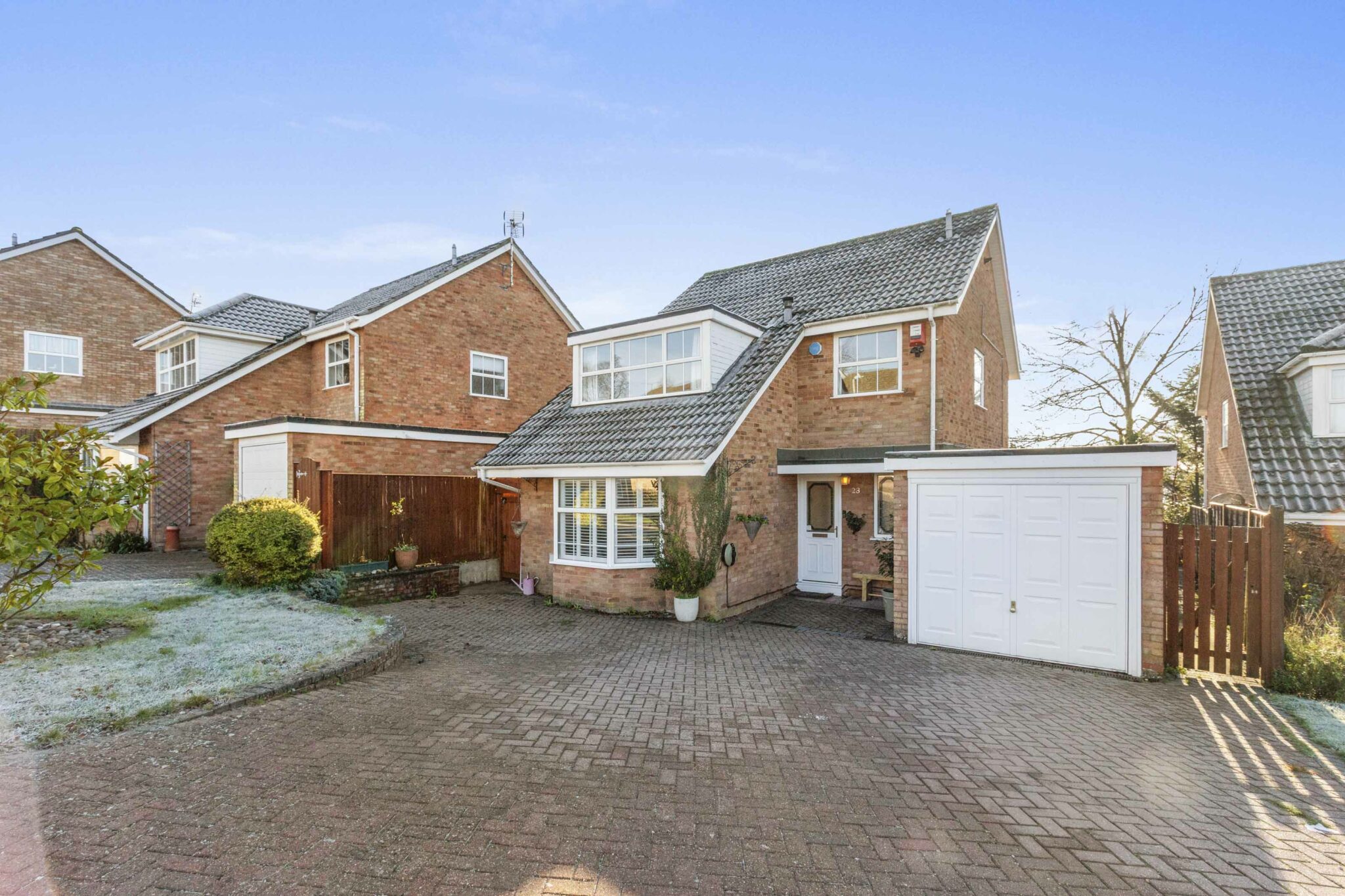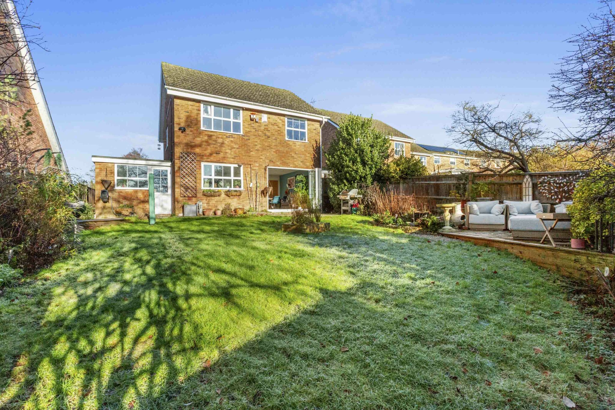 Outside, the property is laid open plan style with a level front garden, a spacious driveway for ample off-road parking, and an attached garage for secure storage. To the rear, the generous garden is maintained with mature trees, shrubs, lawns, and multiple patio and seating areas - perfect for relaxing, hosting gatherings, or allowing children to play in a safe and private environment.