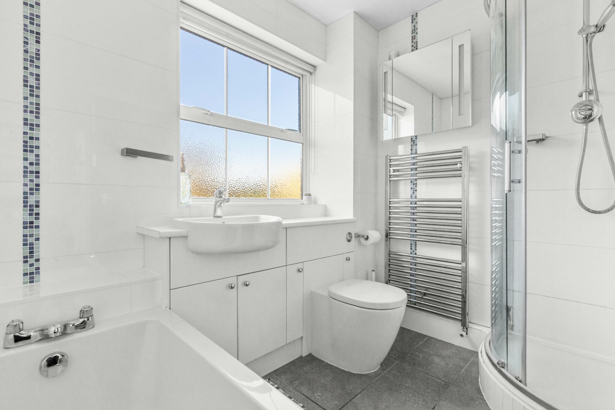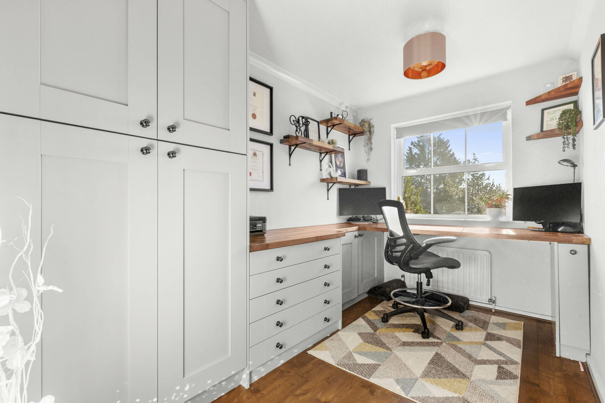 Upstairs there are four bedrooms which are thoughtfully designed to cater to both comfort and functionality. The principal bedroom features spacious built-in wardrobes and a large window for a bright and airy feel, whilst bedroom four is set up currently as a dedicated home office. All served by the modern family bathroom with bath and separate shower, vanity with built-in storage and a heated towel rail.