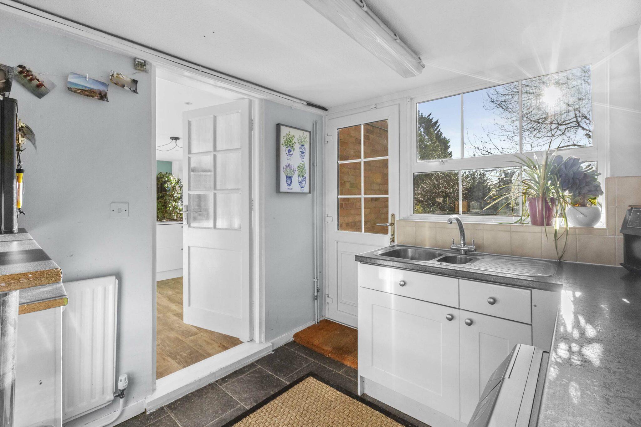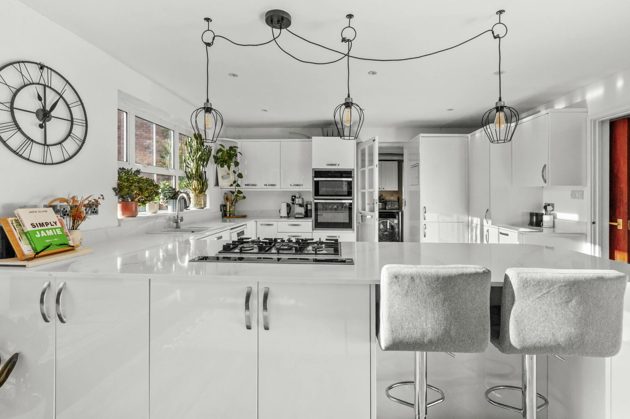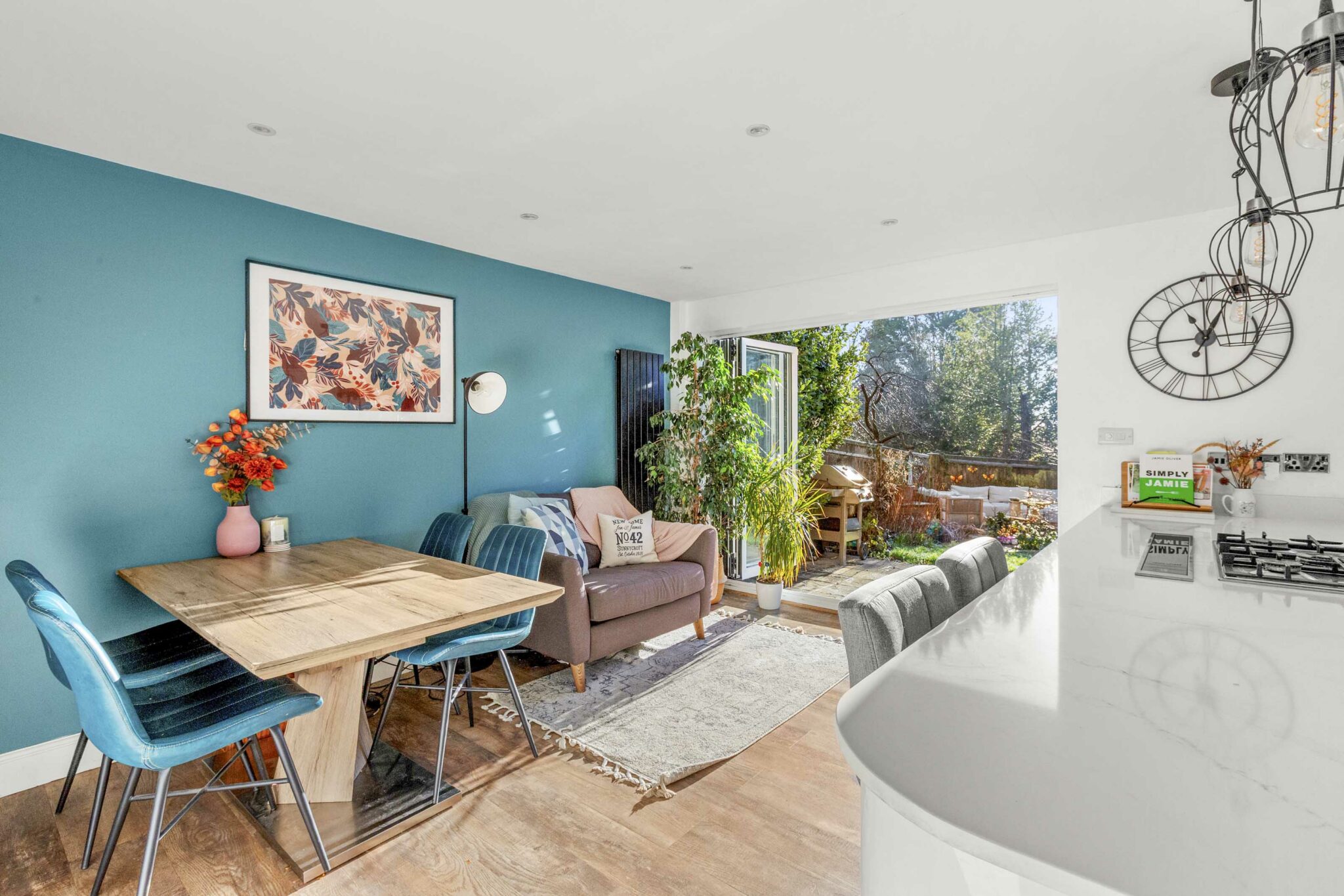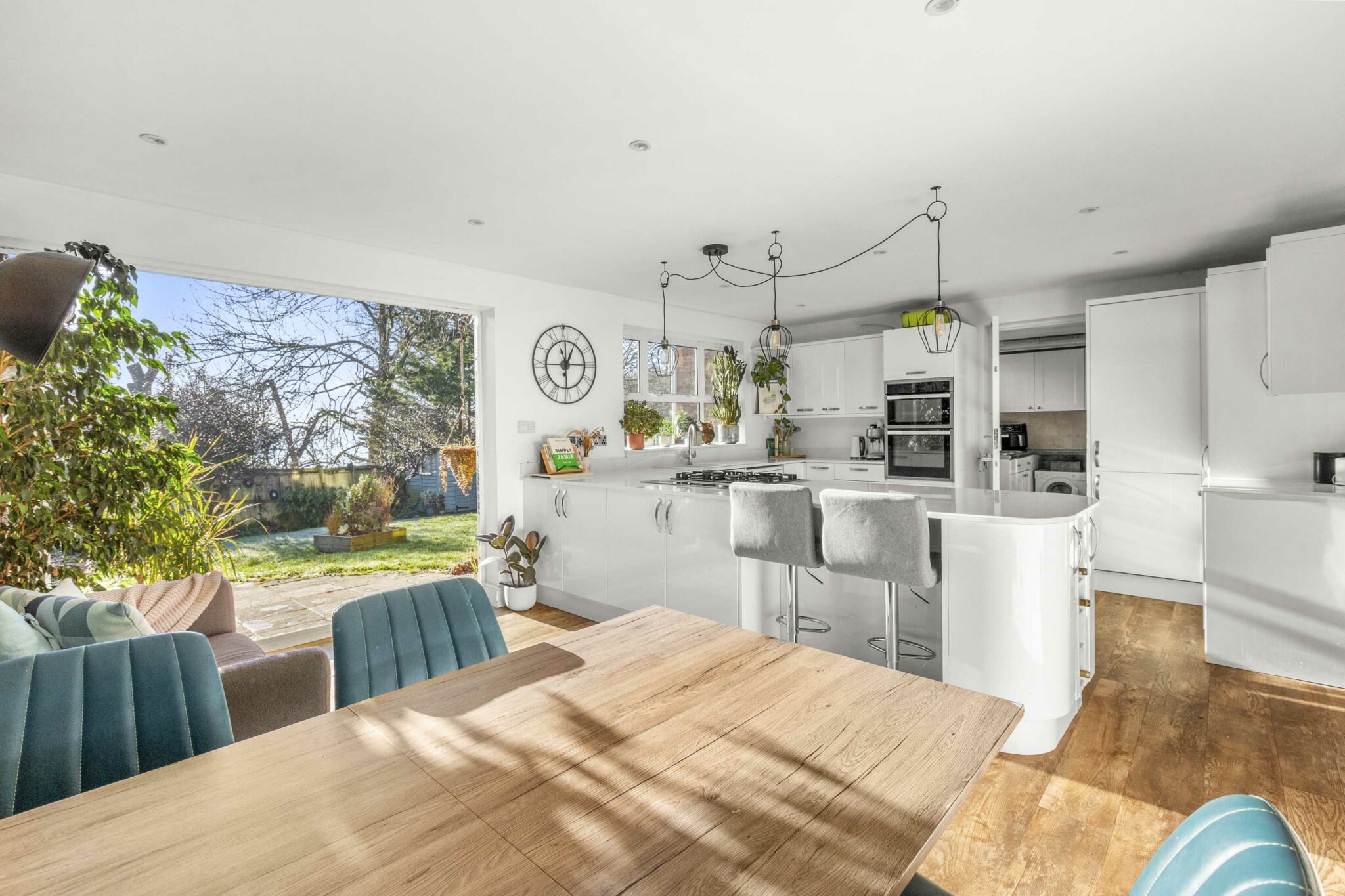 This well presented four bedroom detached house boasts two spacious reception rooms and a generous, light-filled open plan kitchen and dining area, complete with modern white cabinetry, a central kitchen island with breakfast bar, and integrated appliances. Large bi-fold doors seamlessly connect the living spaces to the level rear garden, allowing for effortless indoor-outdoor entertaining. The inviting living room is enhanced by a feature wood burning stove and a large bay window providing an abundance of natural light.
