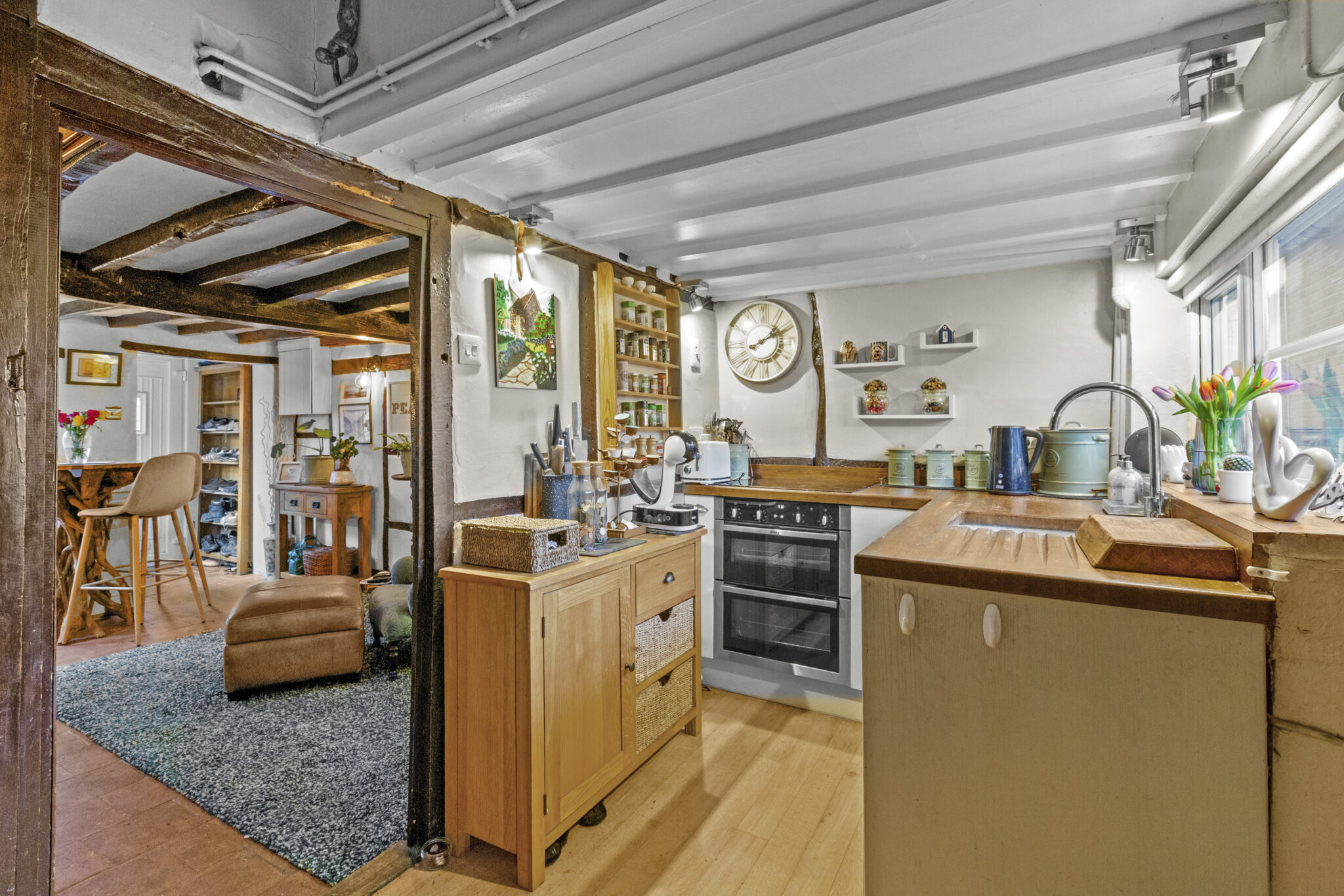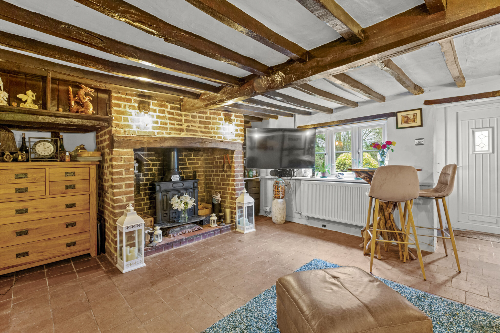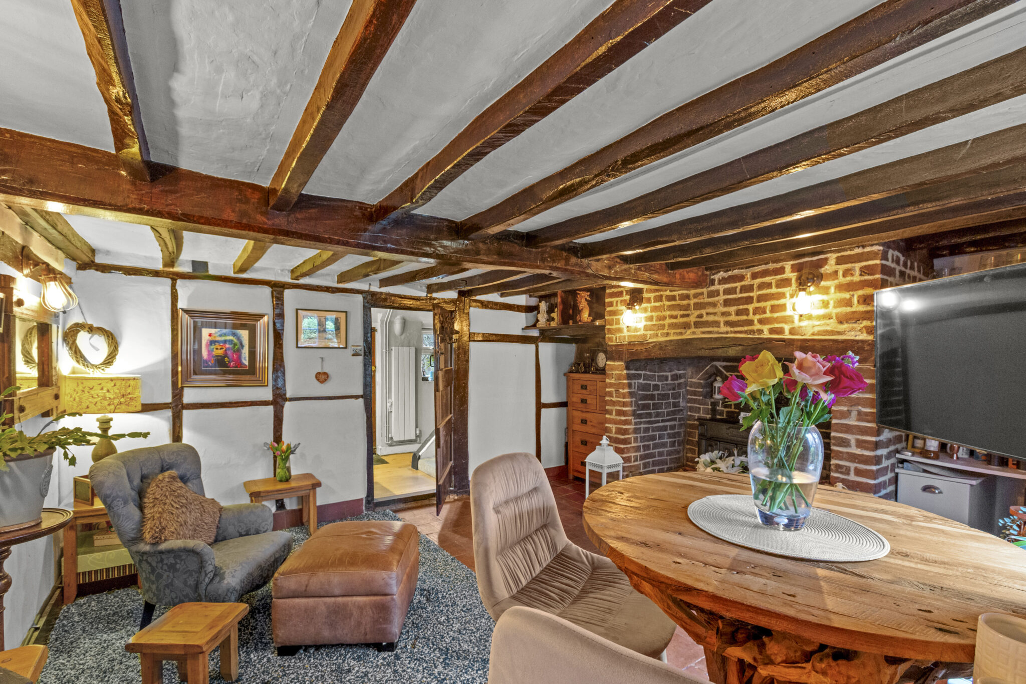 As you step inside, you are greeted by a cosy sitting room with a stunning inglenook fire, perfect for relaxing evenings by the fire. The sitting room seamlessly flows into a well-appointed kitchen.