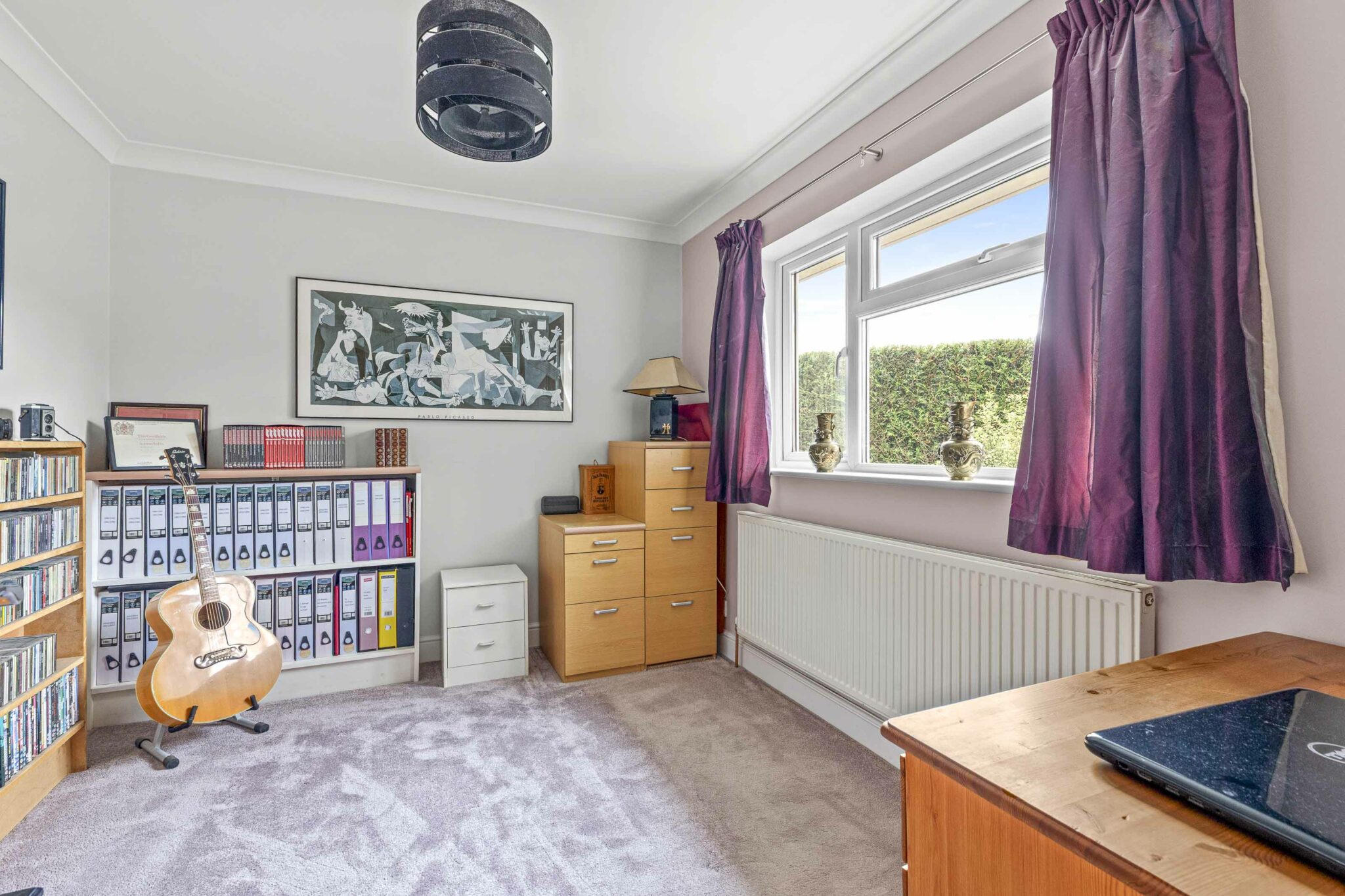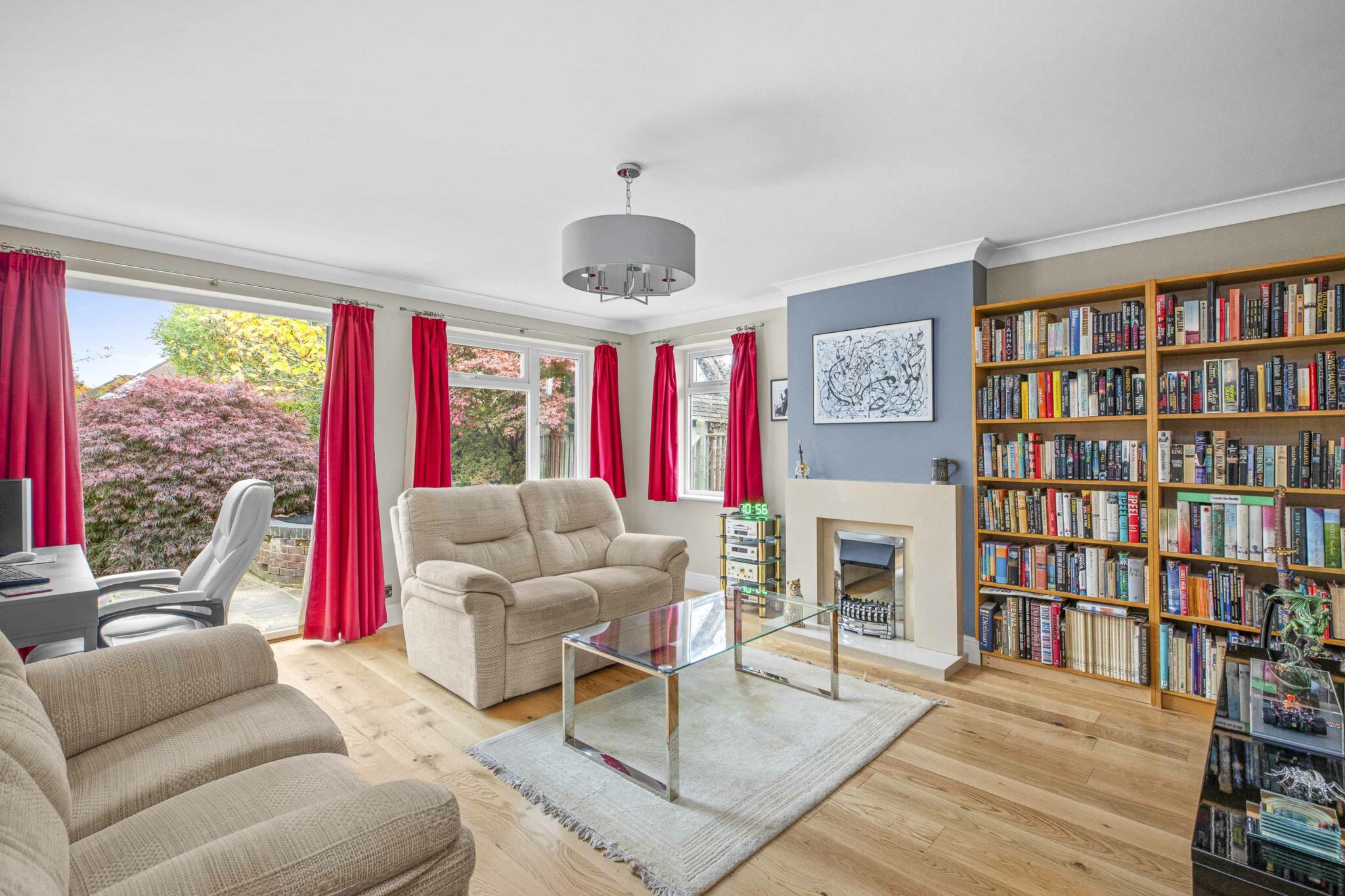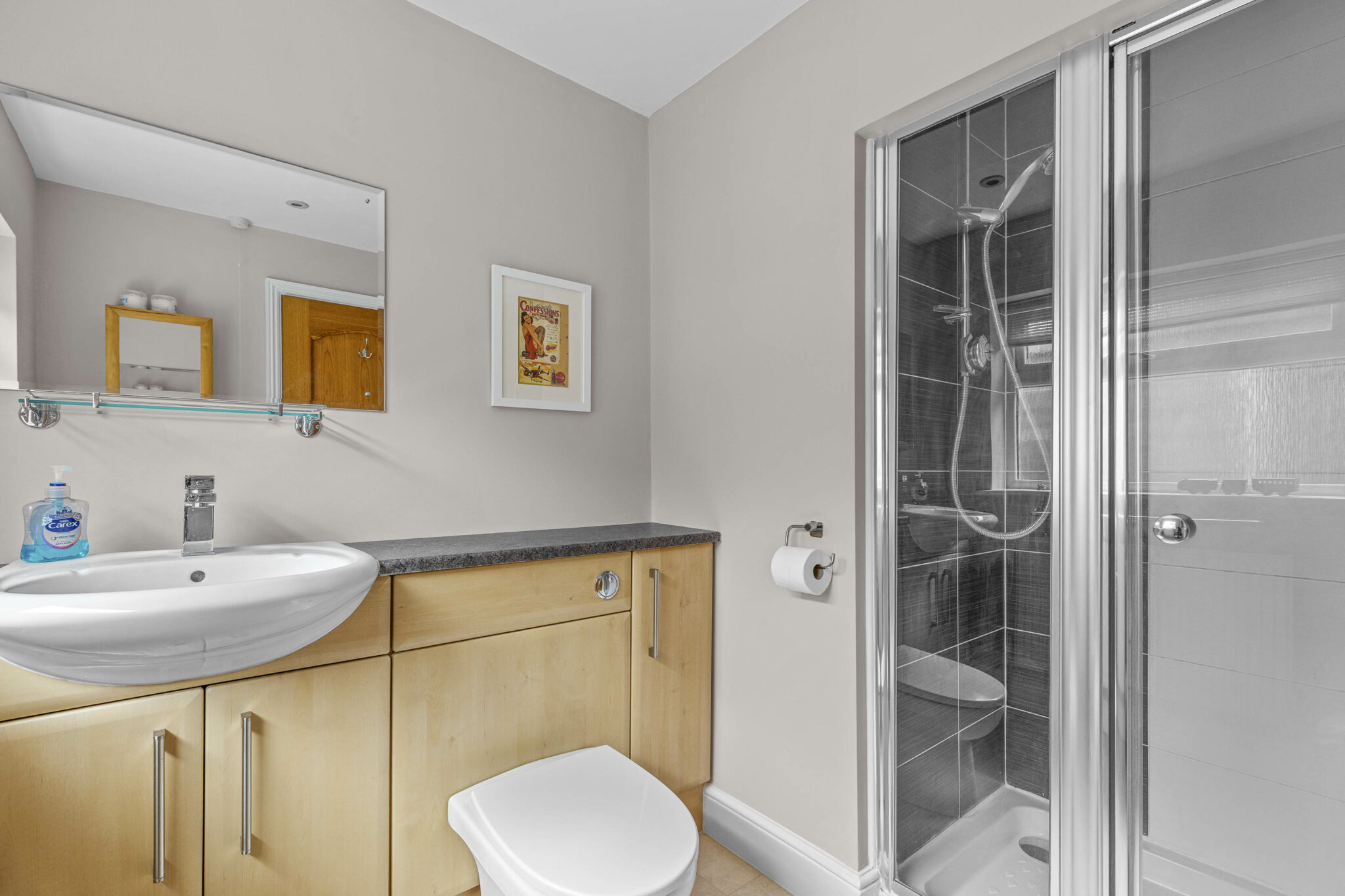 The light-filled and spacious sitting room, featuring oak flooring, a striking fire feature, and patio doors invite you to the garden. The principal bedroom offers fitted wardrobes and an ensuite shower room, accompanied by an additional double bedroom and a versatile family room/bedroom three, all serviced by the impeccably crafted family bathroom.