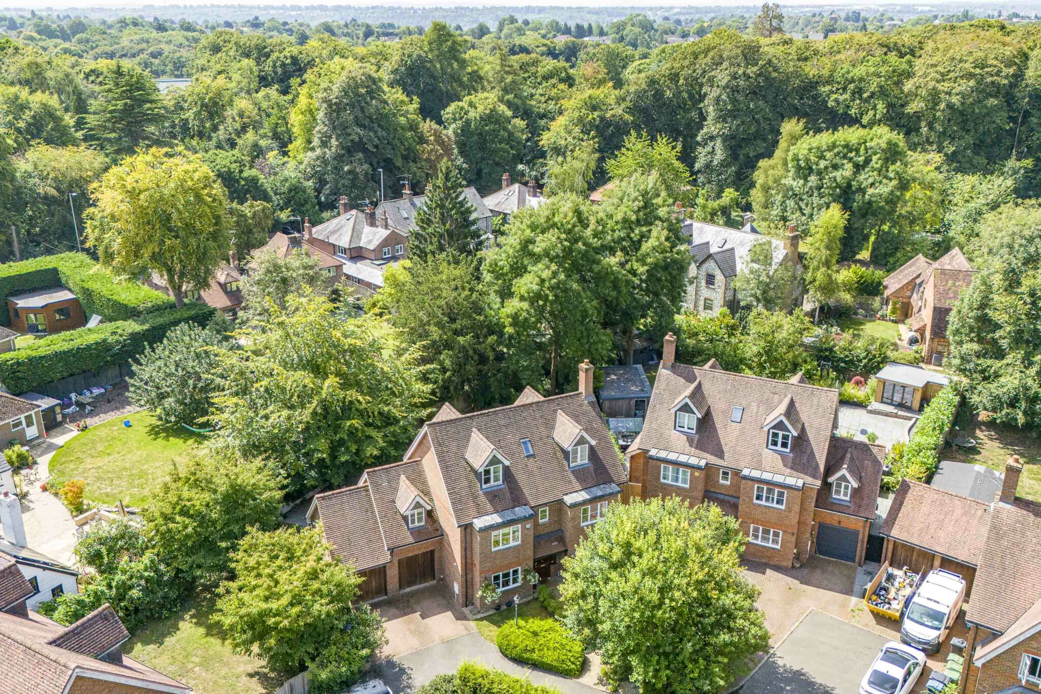 • Private and secluded rear garden with generous patio area leading to level lawn with door to double garage/gym, and summerhouse, surrounded by mature trees and shrubs enclosed by timber fencing